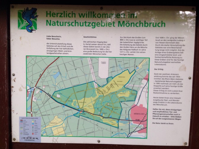 Die Strecke ist wunderbar: Vom Bahnhof Rüsselsheim über Nebenstraßen und auch ein Stück entlang einer Hauptsttaße, dann über die Autobahn (mit stockendem Verkehr – herrlicher Anblick von oben!) rein in den Wald. Der Wald (Mönchbruch) umgibt die Startbahn West des Frankfurter Flughafens, wo alle Minute über meinem Kopf ein Flugzeug abhebt. Jetzt weiß ich, warum damals alle gegen diese Startbahn waren: Es ist einfach schade um den Wald, der dafür abgeholzt wurde. Dem Schalenwild macht der Lärm scheinbar nichts aus. Abgesehen davon wirkt die Gegend an manchen Stellen streng geplant, an anderen wie ein Urwald.