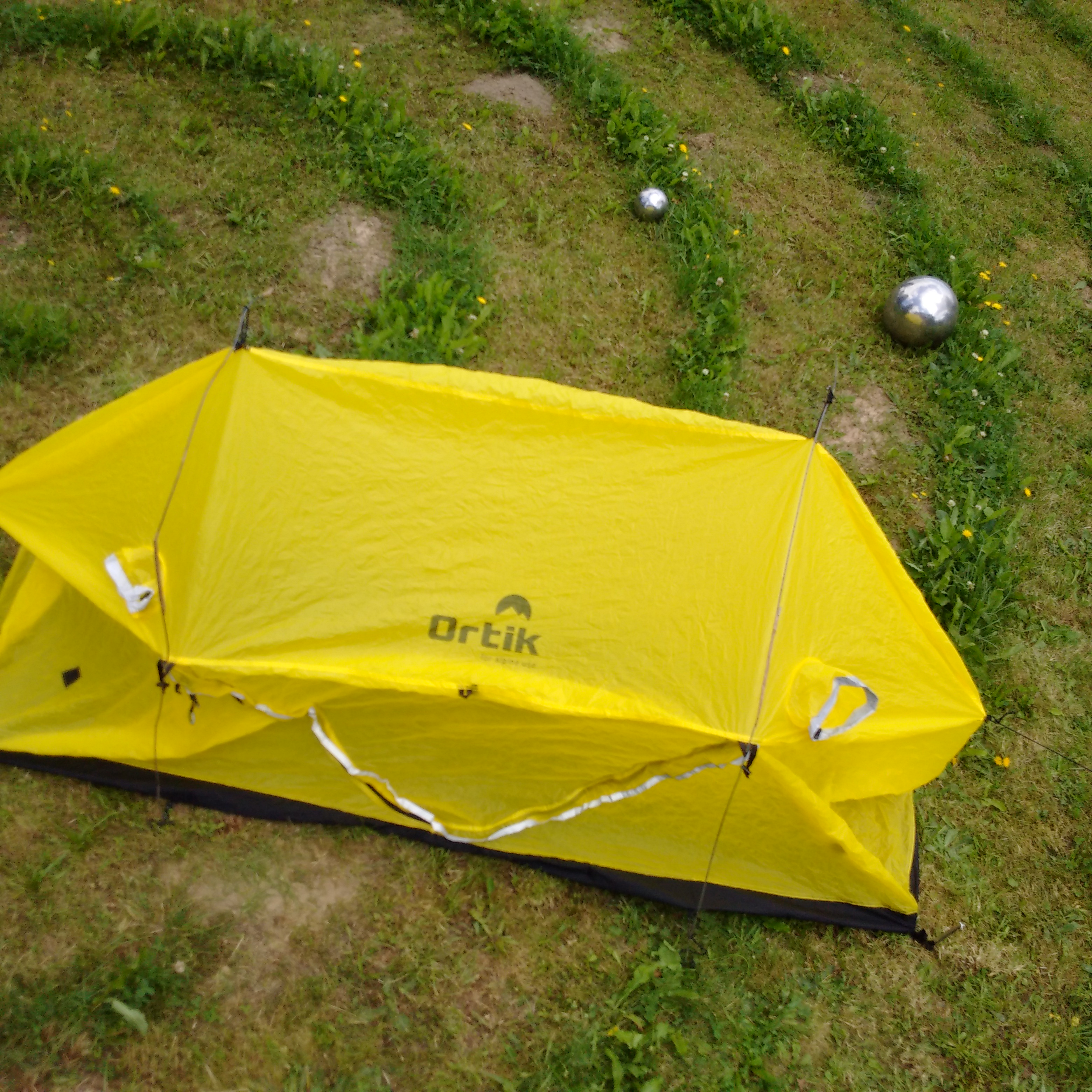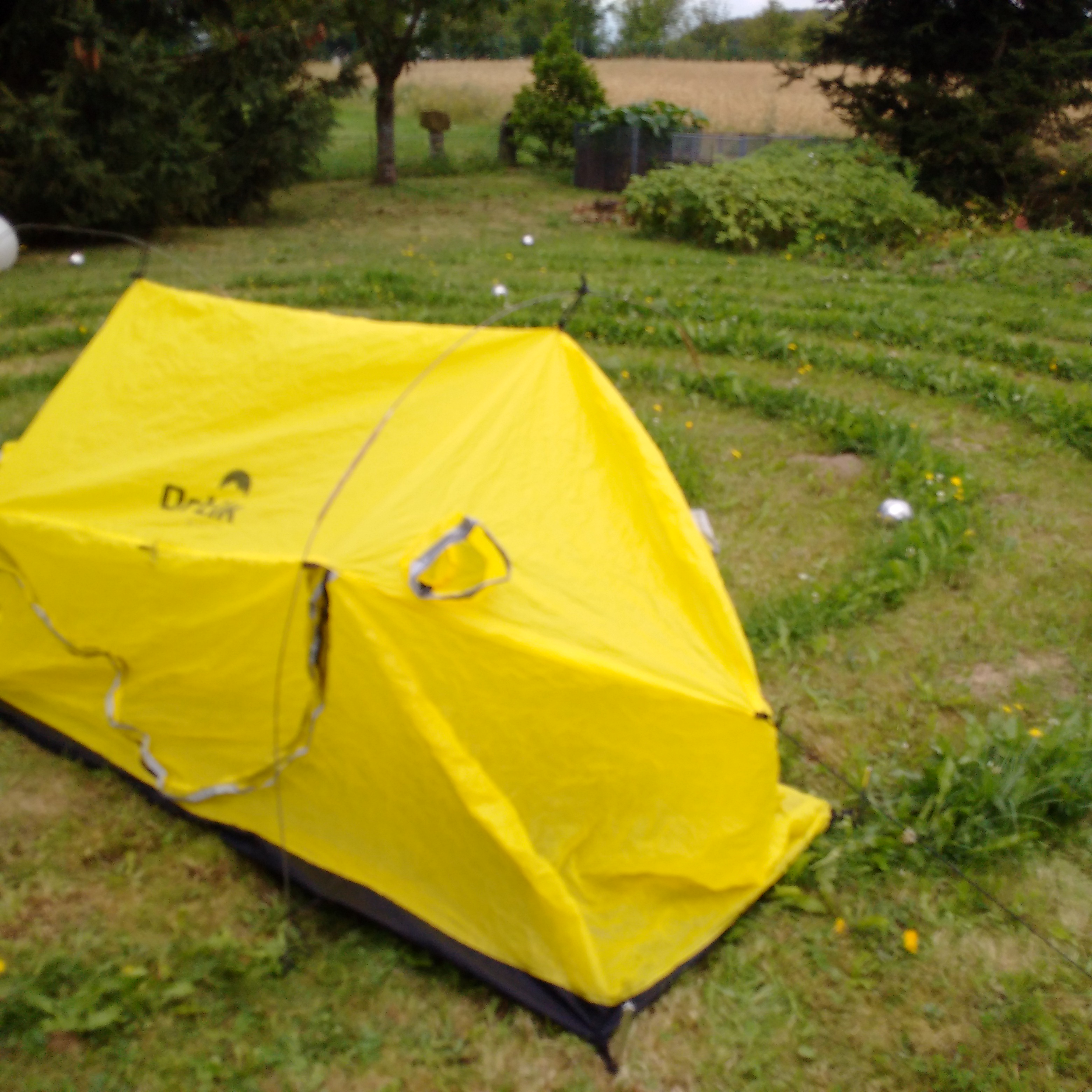Irgendwann kam ich auf das Zelt Ortik Tupek, weil es einen offenen Boden hat. Bei starkem Regen könnte man das Zelt rausziehen und über sich und den Wagen ziehen. Drinnen kann man dann den Boden nachträglich zu machen. Die eine Seite würde durch den Wagen gestützt, die andere Seite durch die beiden Zugstangen des Wagens. Es ist eher ein Notzelt. Wenn man Zeit hat und das Wetter schön ist, kann man es in Ruhe aufbauen und dann auch mit geeigneten Stangen oder Ästen abstützen und verzurren. Stangen sind übrigens nicht dabei. Ich habe schon ein paar Versuche unternommen, es mit anderen Stangen provisorisch aufzurichten. Das geht irgendwie, ich muß mir da selbst Gedanken machen – sieht man auf den Fotos, aber da muß ich mir noch gute, ultraleichte Stangen dazu kaufen, die auch biegsam sind. Das ortik Tupek ist wohl von einem portugiesischen Hersteller, aber nirgends mehr zu bekommen, Nachlieferung gibt es wohl nicht mehr. Die Webseite ortik.net ist nicht erreichbar. ich habe es in einem schweizer Webshop gefunden, die Bestellung, Rechnungsbezahlung und Lieferung war ein kleines Abenteuer und es war dadurch auch über 100€ teurer, als wen ich es in Deutschland bekommen hätte.
