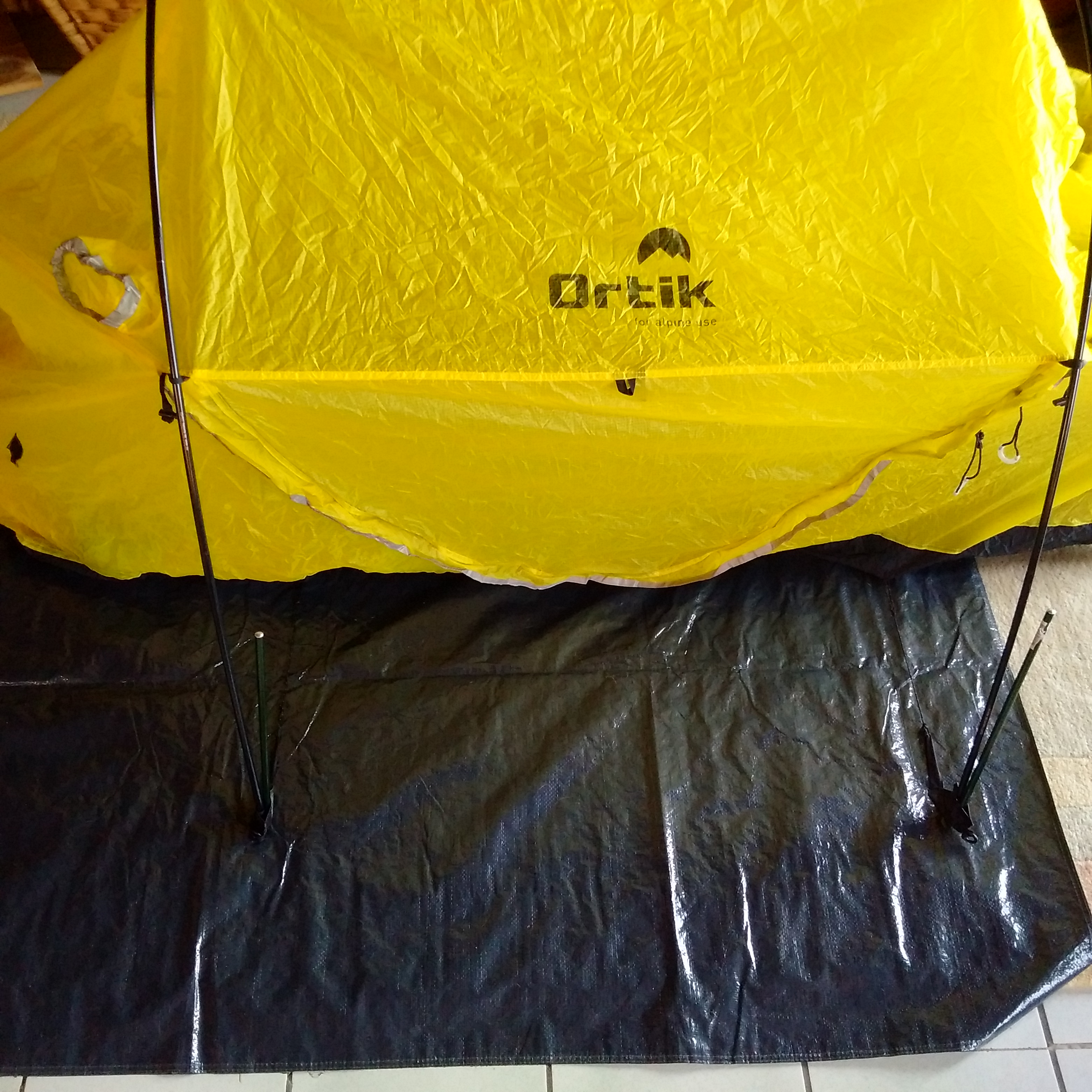 Ich habe jetzt die beste Lösung für mein Ortik-Zelt: zwei Super-Qualitäts-Zeltstangen als Bögen an dem der Stoff gut hängt. Ich habe sie sie der Zelt-Abteilung des Globetrotter-Kaufhauses in Hamburg Barmbek gekauft. Die haben auch einzelne Stangen und schneiden sie bei Bedarf auf individuelle Länge. Dazu noch zwei Sand- und Schneeheringe und 4 Schlaufen, in die ich die stark gebogenen Stangen stecken kann.