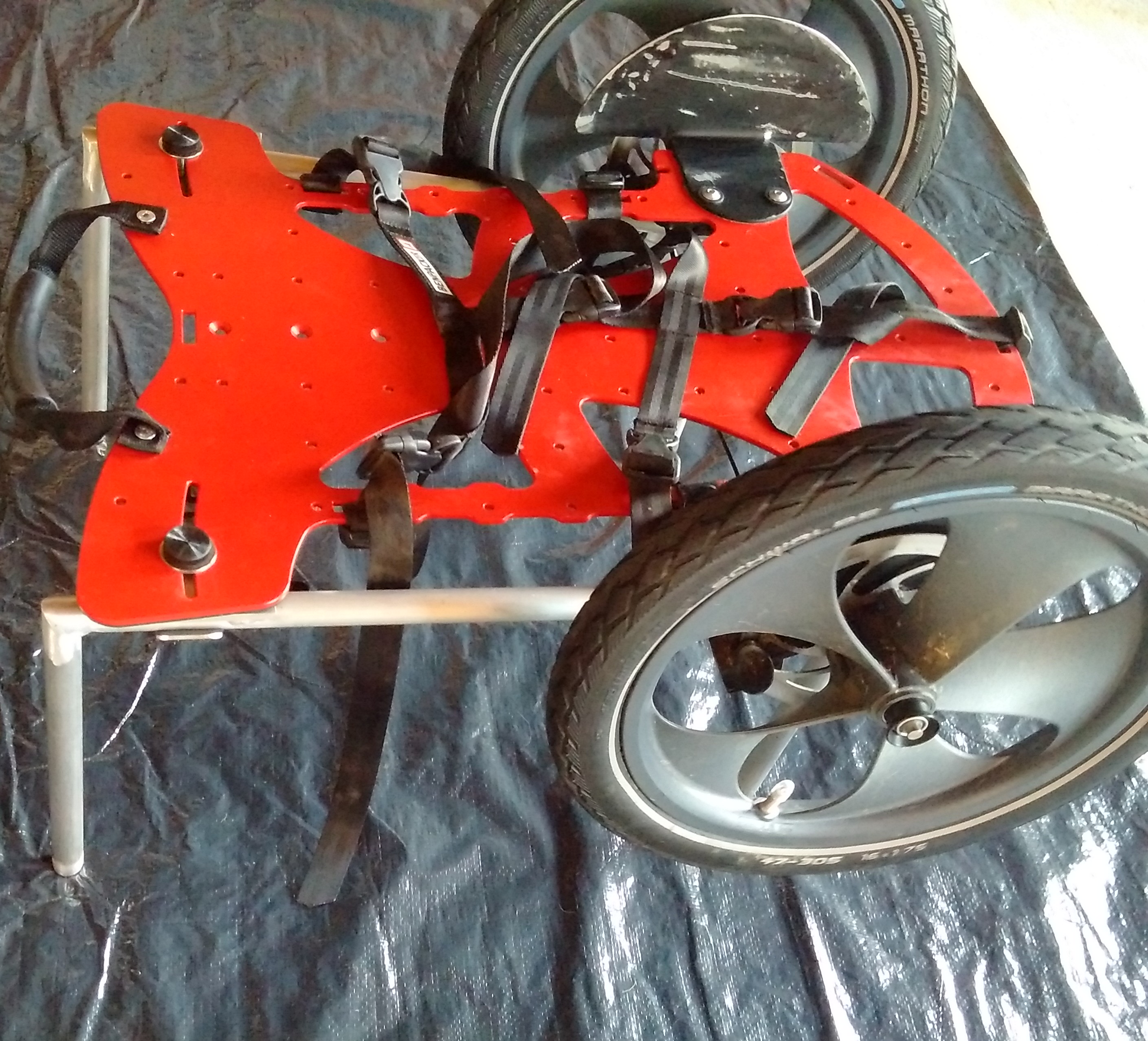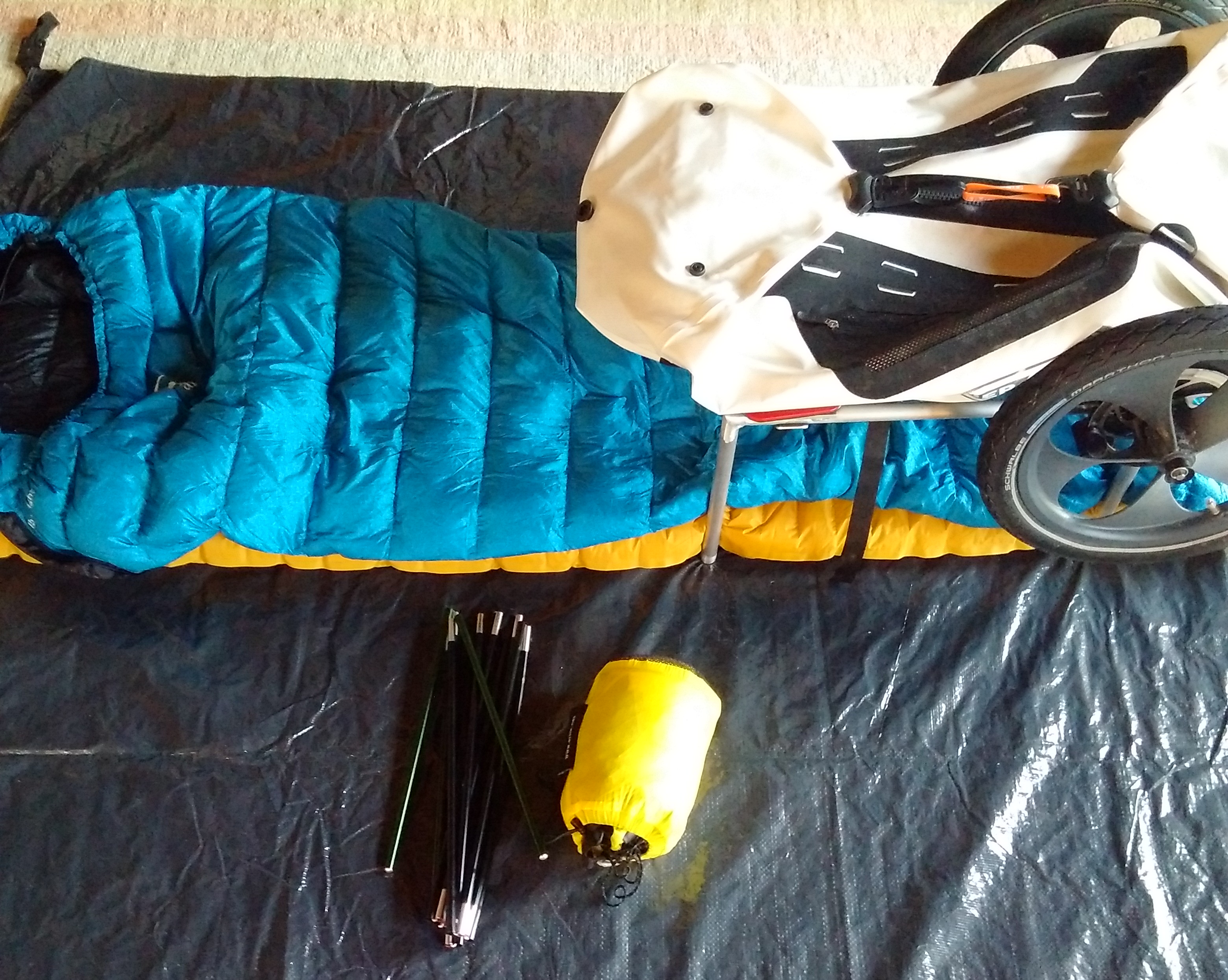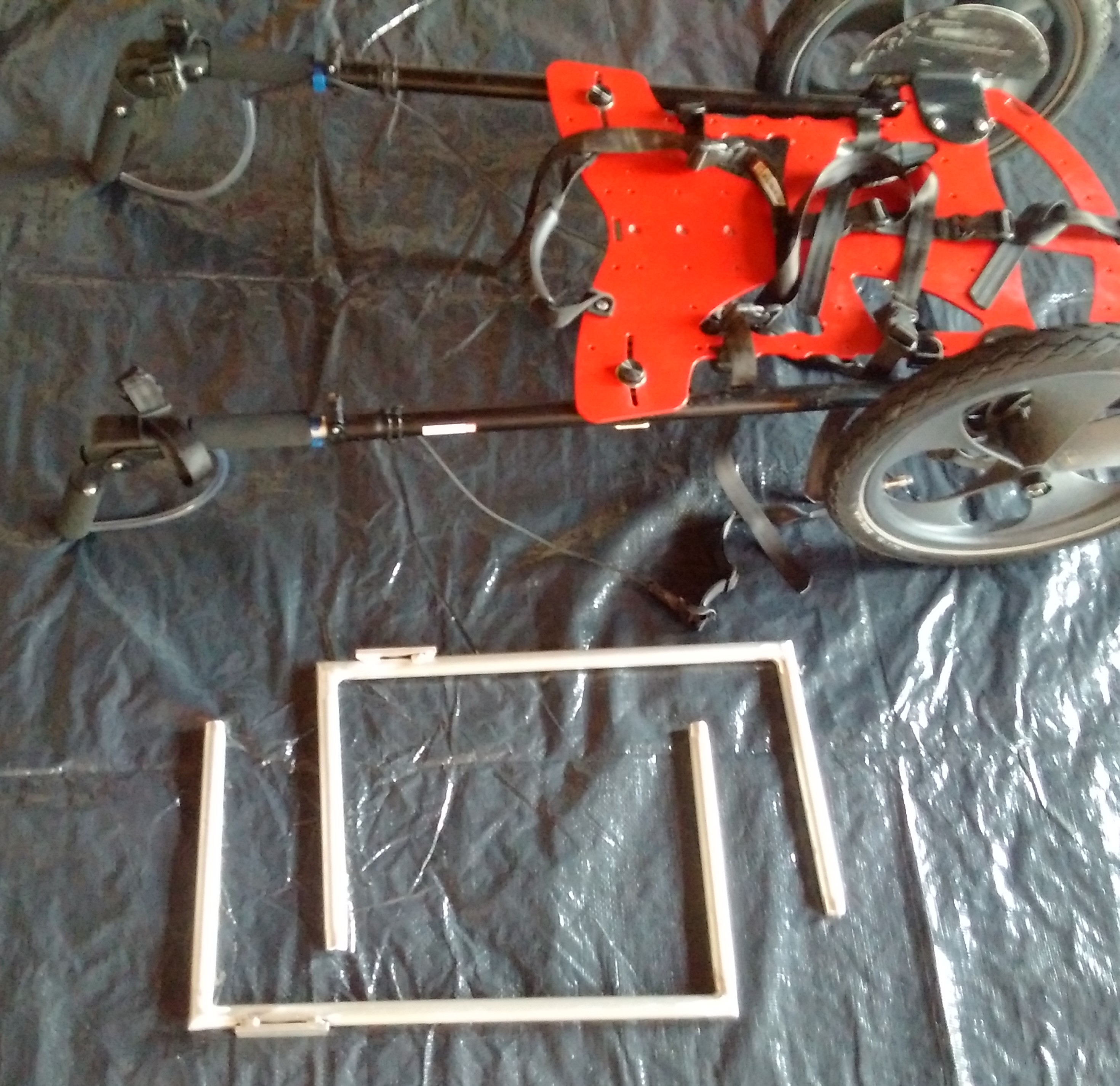 Ein weiteres Problem konnte ich jetzt lösen: Der Wagen soll mit ins Zelt und ich will meine Beine zum schlafen unten durchstecken. Das hatte ich im Herbst au meiner Westerwaldtour ausprobiert, aber der Wagen ist zu flach. Ich habe dann mit verschiedenen Stützen herumprobiert, jetzt aber die Lösung mit zwei Aluminiumbügeln mit aufgeschweißter Platte gefunden. Die Bügel hat Metallbau Gahn in Mörfelden-Walldorf angefertigt.