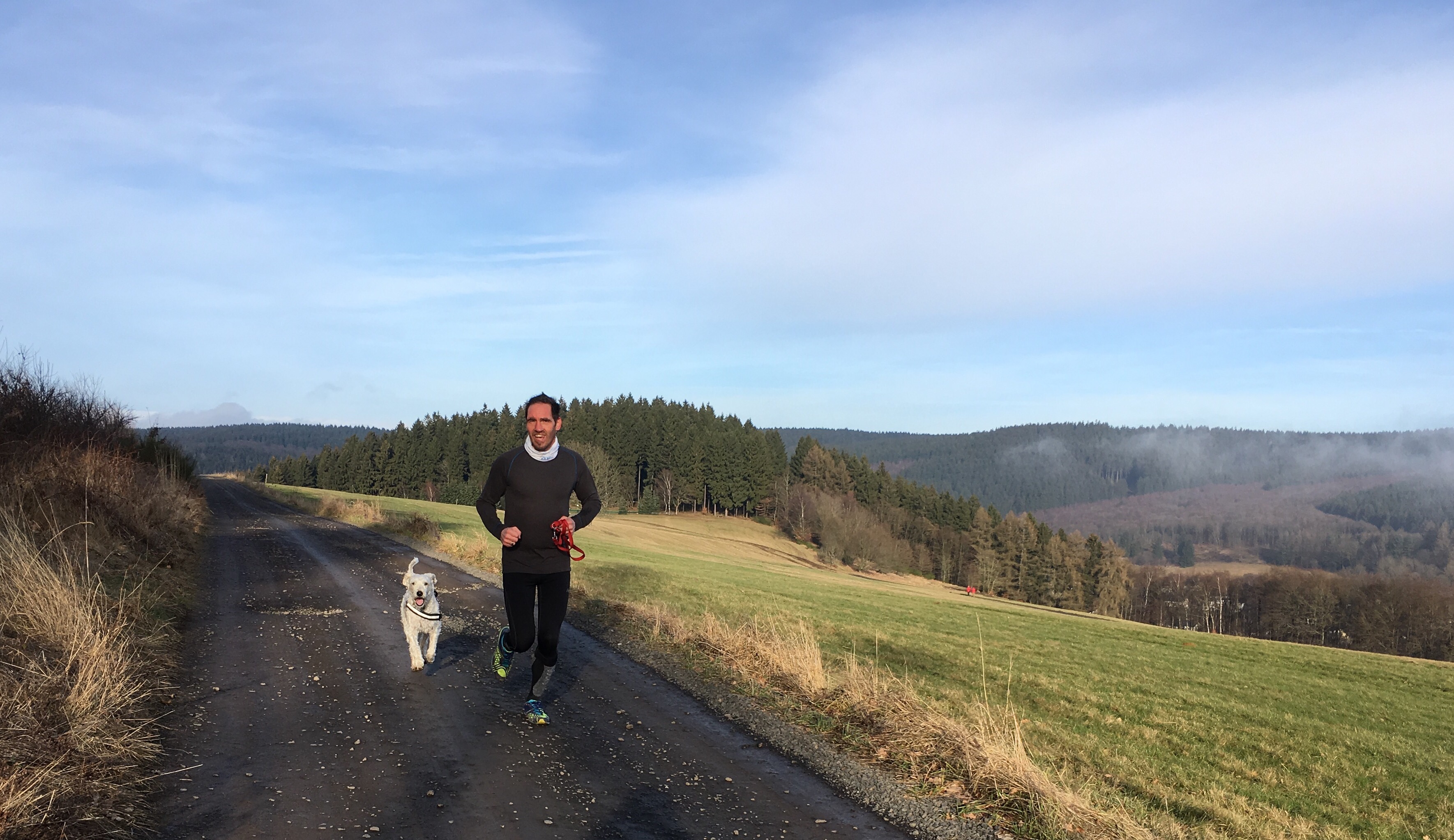 Es ist natürlich auch eine Frage der Rasse und des individuellen Typs: Unser ist ein Hütehund, ist mittelgroß und gesund, die hat Ausdauer. Nur bei warmem Wetter kommt sie nicht all zu weit und schnell. Das ist übrigens bei mir auch so. Wir passen vom Typ her ganz gut zusammen. Wir sind in den letzten drei Tagen jeweils gut 14 km mit 400 Höhenmetern gelaufen. Für Charlie war das kein Problem. Ich habe heute bergauf etwas geschwächelt. Immerhin, pace nur knapp über 5:30 den km.