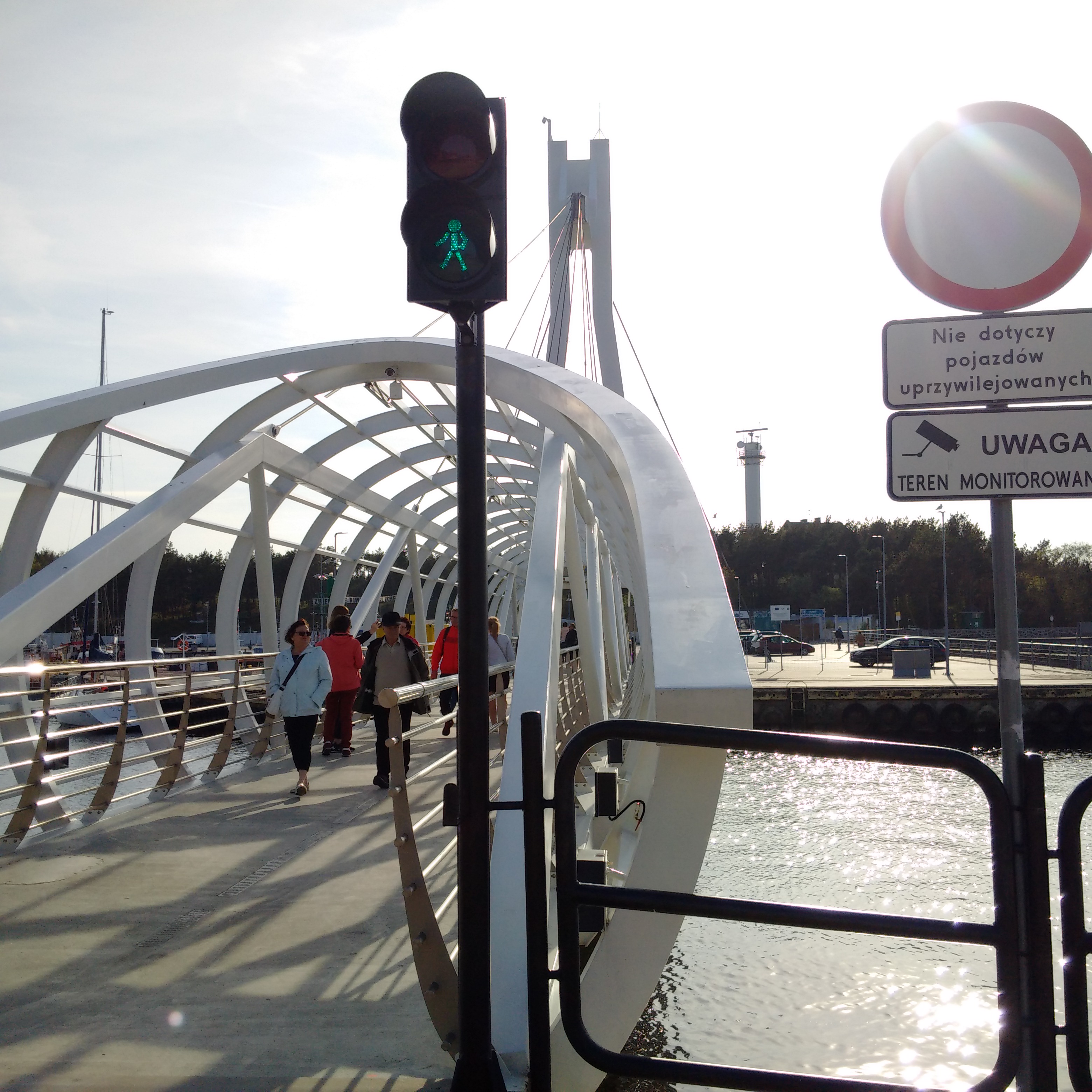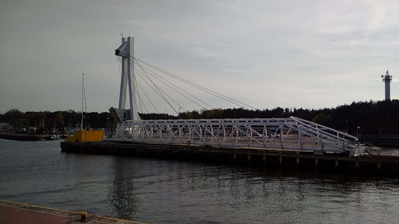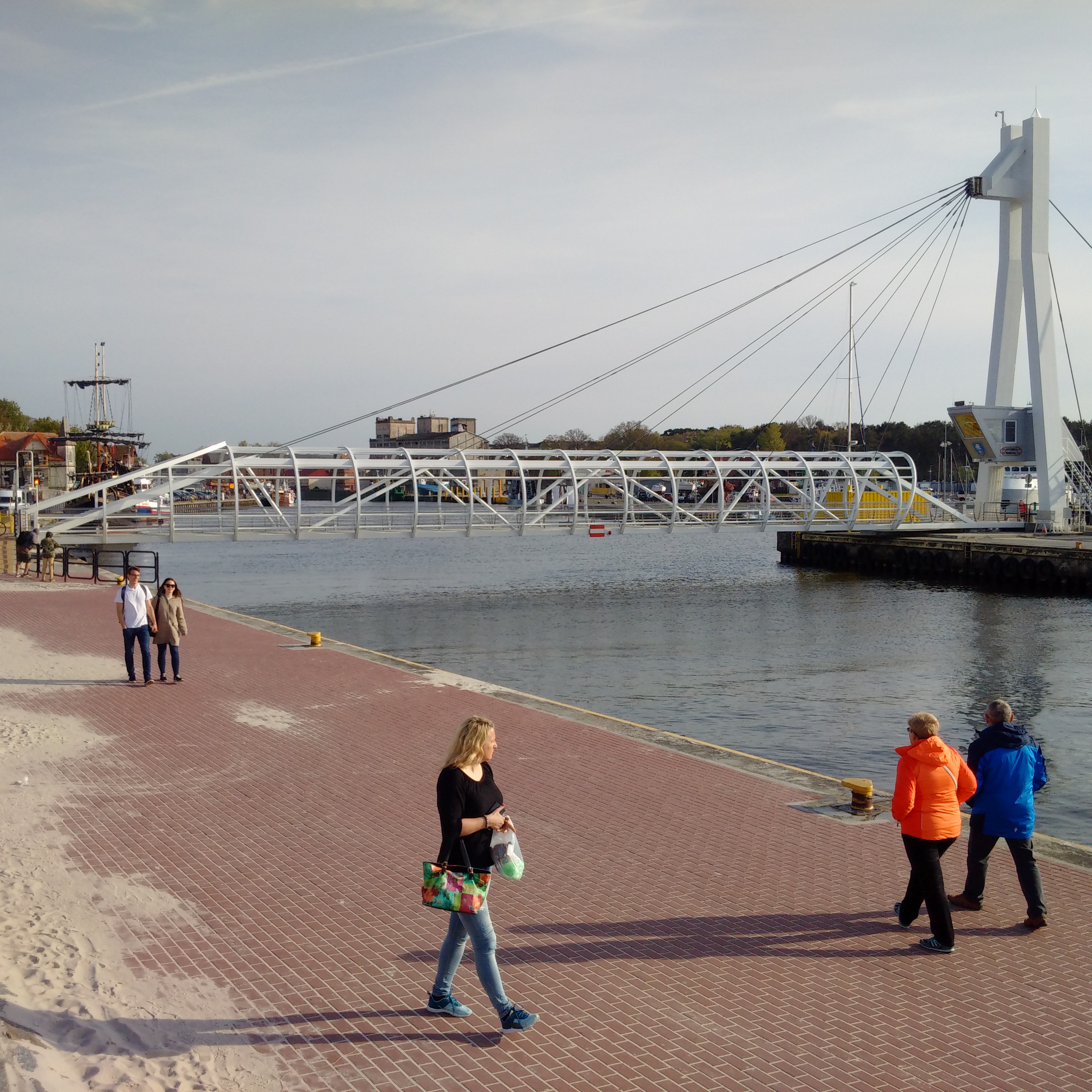 Der Hafen hat eine kühne Schwenkbrücke, die bei Schiffsverkehr seitlich weggeklappt wird, beeindruckend!