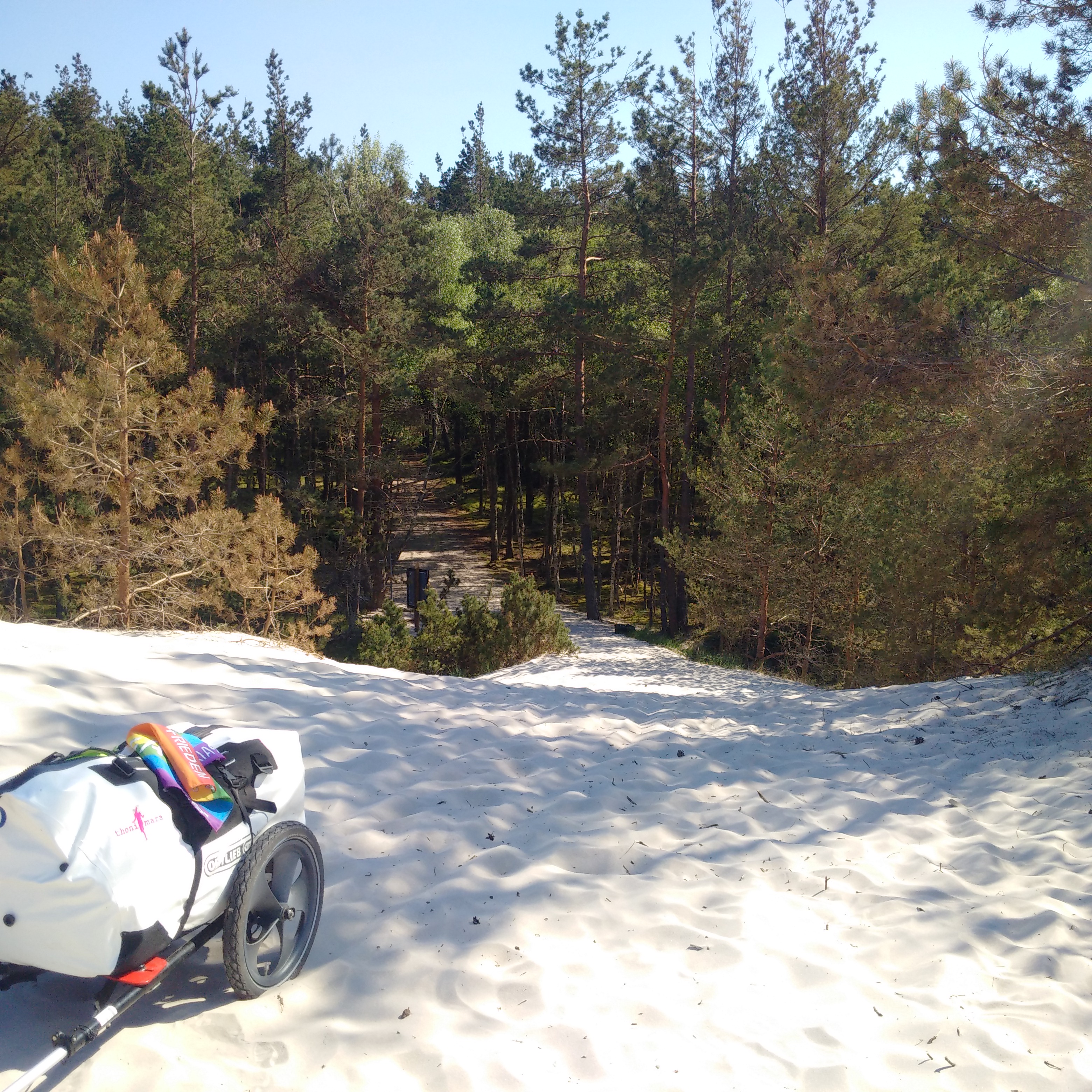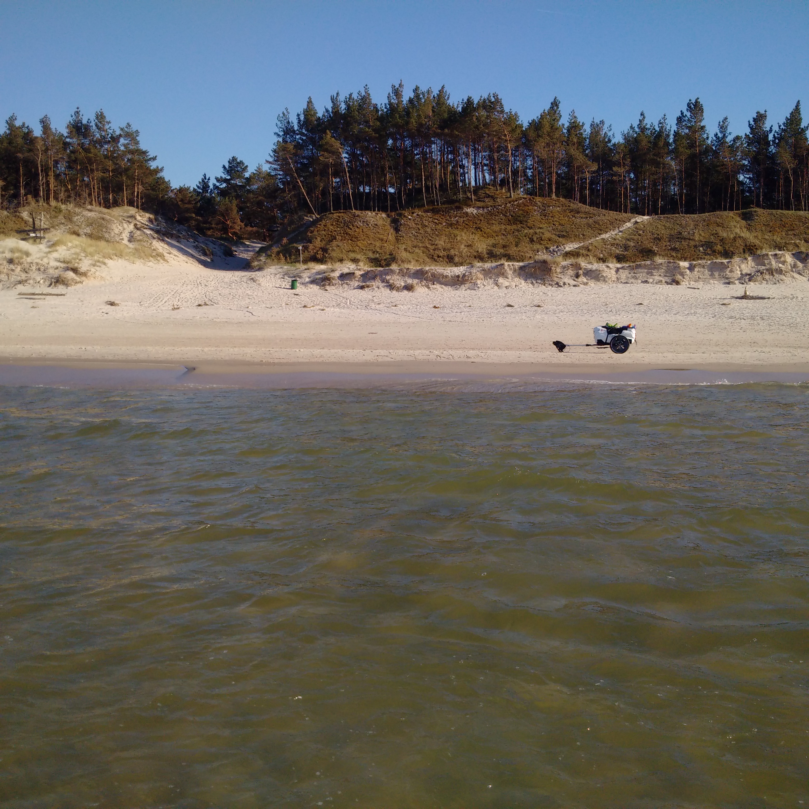 An der Vorbereitung hat es nicht gemangelt. Vorsichtshalber war ich gestern, am Pausentag die ersten drei Kilometer sowohl Strand als auch den Radweg abgewandert. Und so fiel die Wahl auf den schattigen 1a Radweg. Er war natürlich nicht so doll, wurde Richtung Czolpino immer schlechter. Aber es wird das Beste sein, ich gewöhne mich daran. Hier das Video von vor drei Tagen, so ähnlich sah es heute auch aus: