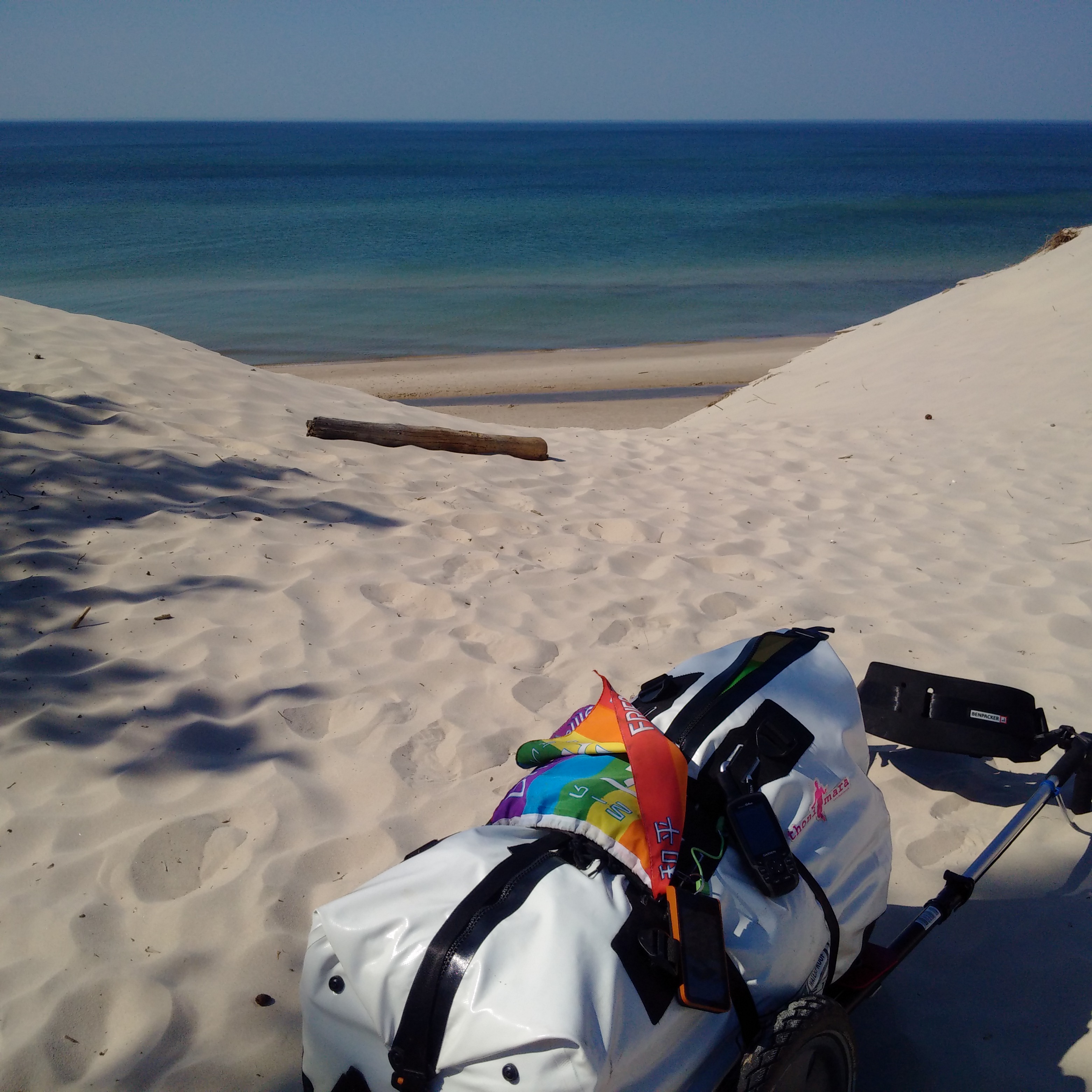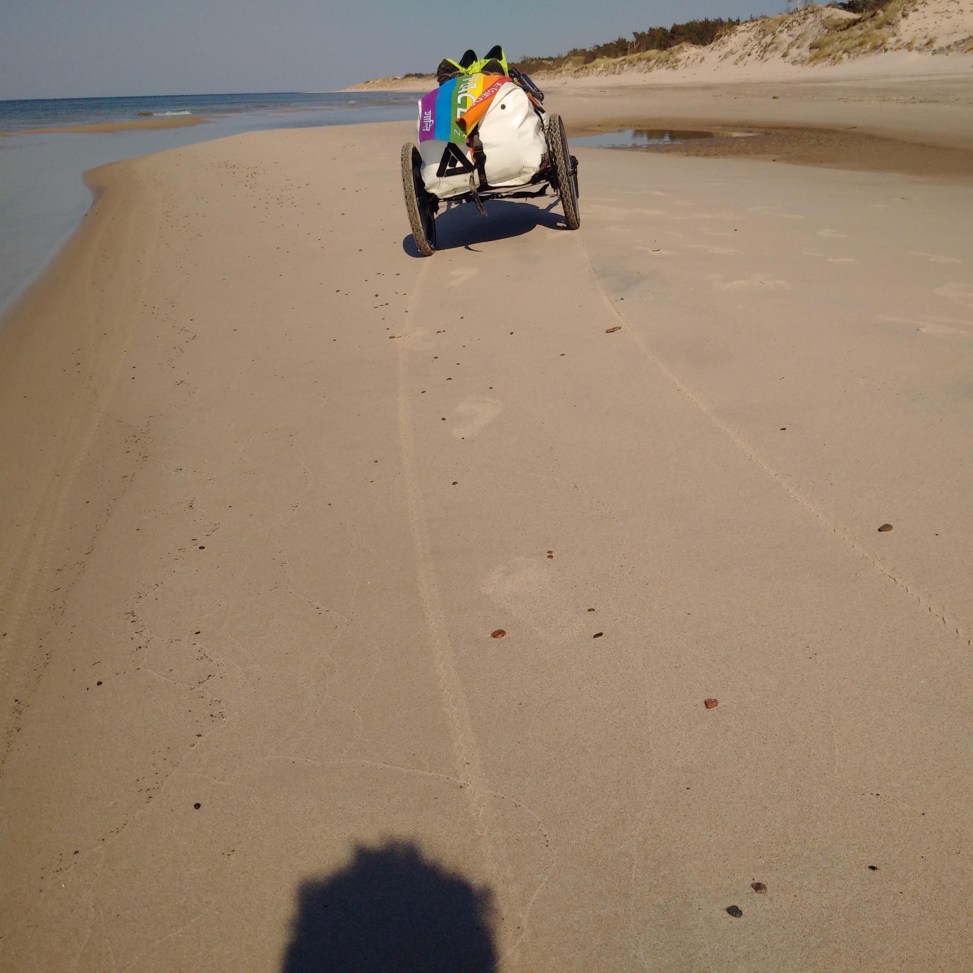 Nun ging es 20 km am Strand lang, die einzige Möglichkeit, die Dünen zu umgehen. Und es ist absolut unpraktisch, zu Fuß in einer Wüste unterwegs zu sein, nur noch zu übertreffen, mit einem Wagen zu versuchen, dort durchzukommen. Ich bin also barfuß den Strand bis Leba gelaufen und absolut happy damit. Ich hab zwar nun eine Blase unter der gesamten rechten Ferse, aber das war es mir wert. Anders hätte ich die Wüste nicht geschafft. Niemals!