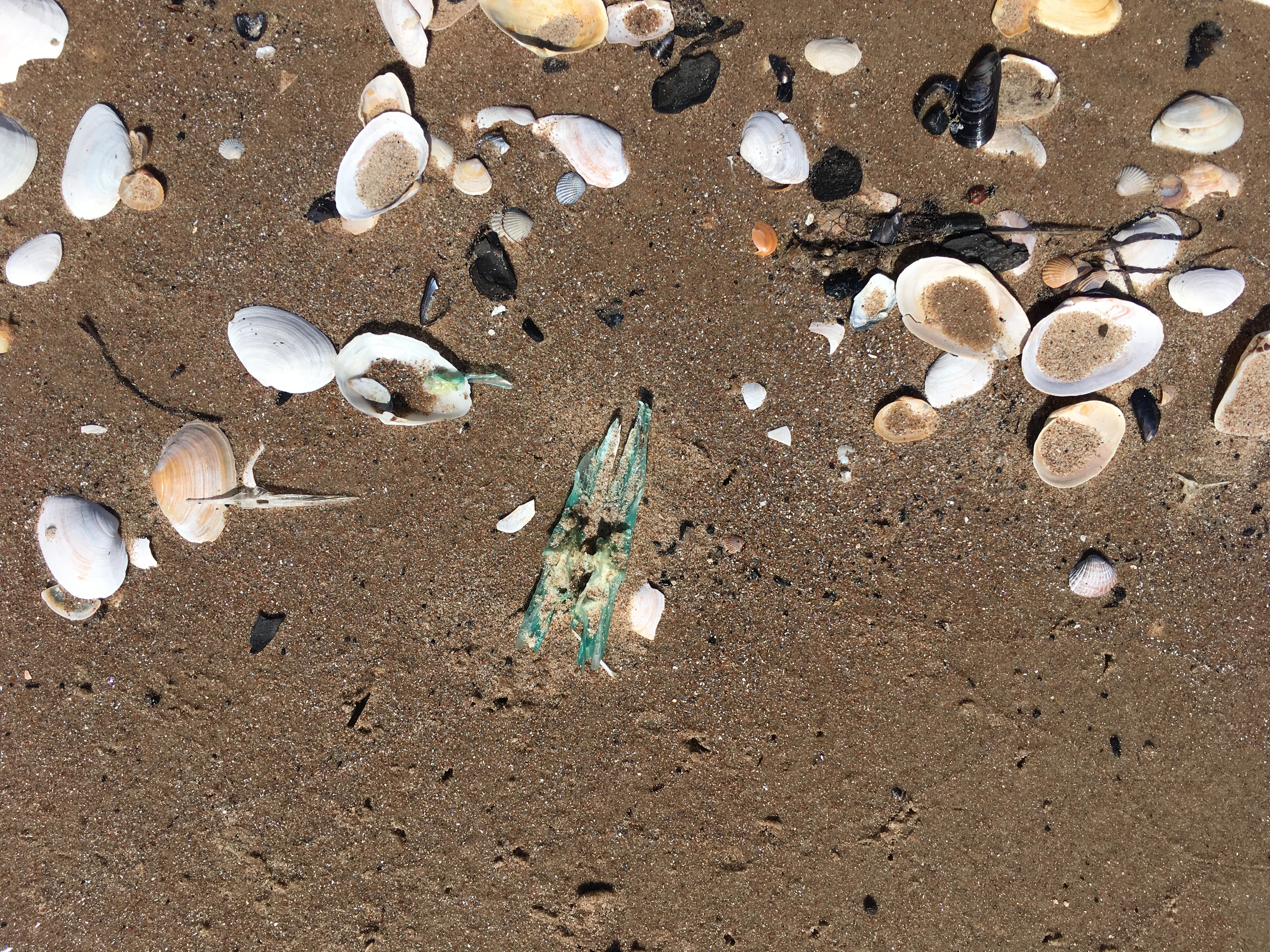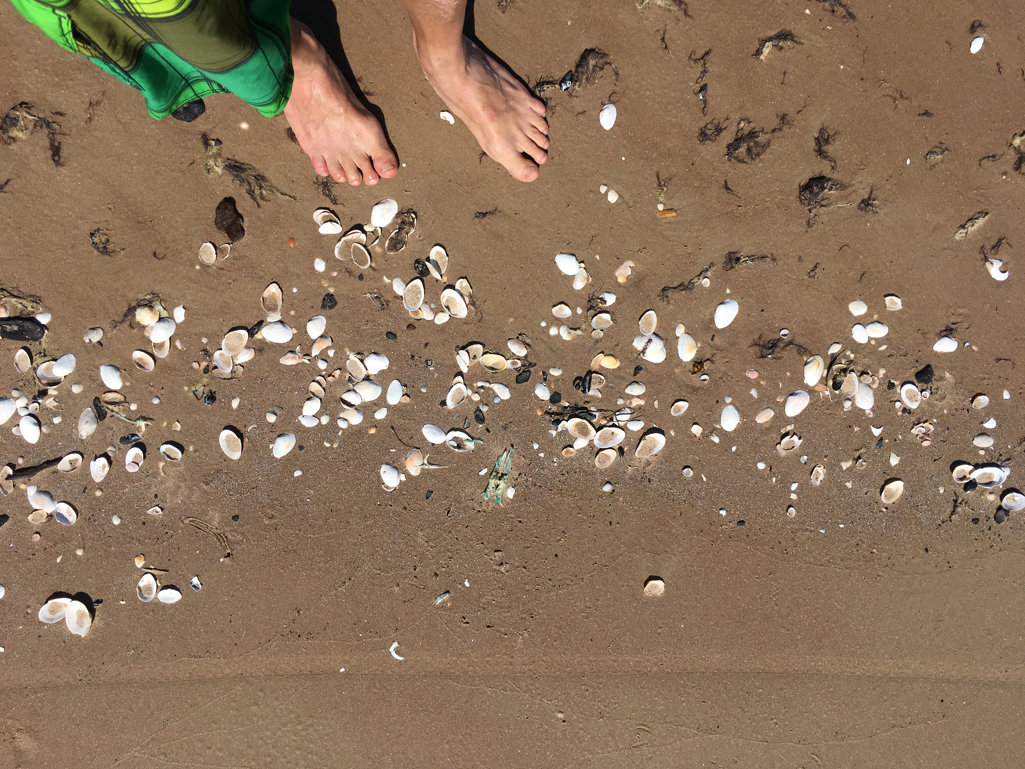 Der Strand hat viele Facetten. Man geht nicht einfach wie auf einem Gehweg, es erfordert – jetzt wäre mir beinahe das Wort Achtsamkeit heraus gerutscht – Aufmerksamkeit bei jedem Schritt. Das grüne sind Fischgräten, die pieksen heftig.