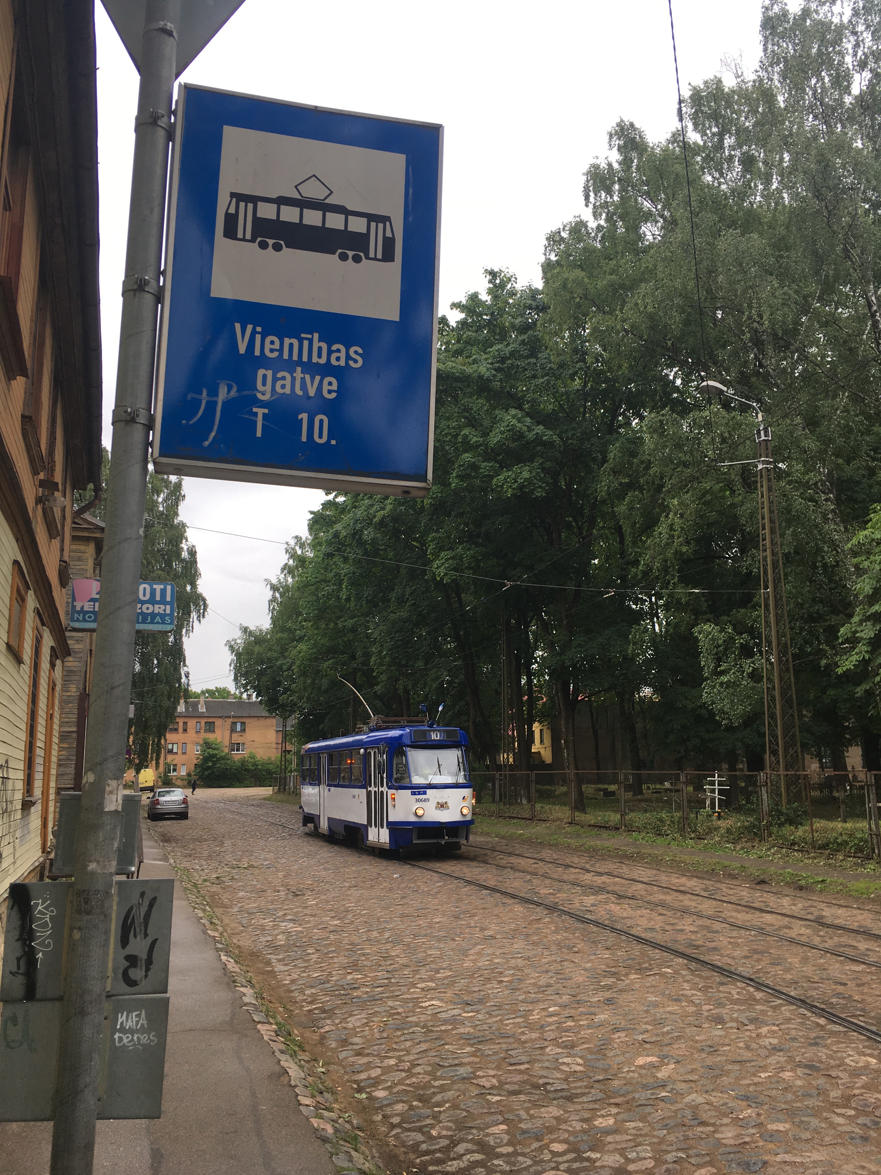 Eine U-Bahn hat Riga nicht, aber Straßenbahn, Trolleybusse, Busse und Kleinbusse. Das System ist nicht einfach zu durchschauen. In den Bussen und Bahnen kein Plan, immerhin einen Stationsansage. Es gibt zwar eine Webseite mit Routenfinder, aber wenn man nicht exakt den Namen der Haltestelle hat, findet man nichts. Die virtuelle Karte hat alle Haltestellen als Punkte dargestellt, aber man braucht schon einen großen Bildschirm um etwas zu erkennen. Mir würde ja eine einfache Karte genügen mit den Bussen und Bahnen drauf, dann kann ich mich orientieren, aber sowas gibt es nicht, auch nicht als PDF. Sowas reizt mich ja dann. Ich habe herausgefunden, daß bei meinem Hotel nicht nur der Trolleybus 19 in der Kartupeli iela (Kartoffelstraße) fährt, sondern hier irgendwo auch eine Straßenbahn Nr. 10. Mit der bin ich durch die ganze Stadt bis zur Endstelle gefahren und hab mir abseits der Altstadt vieles angesehen. Später bin ich auch noch umgestiegen und habe so einige Zeit bei Regenwetter in der Straßenbahn verbracht.