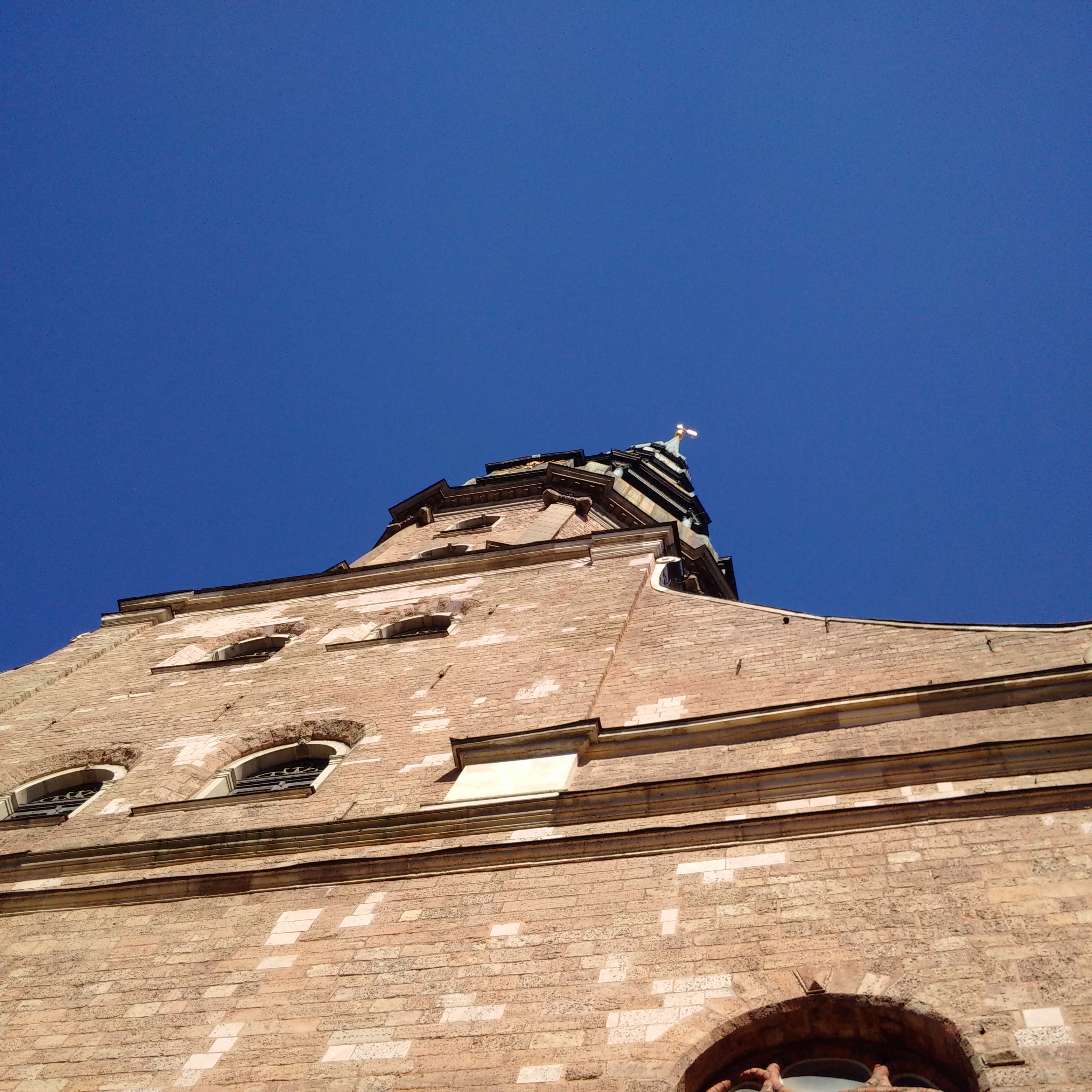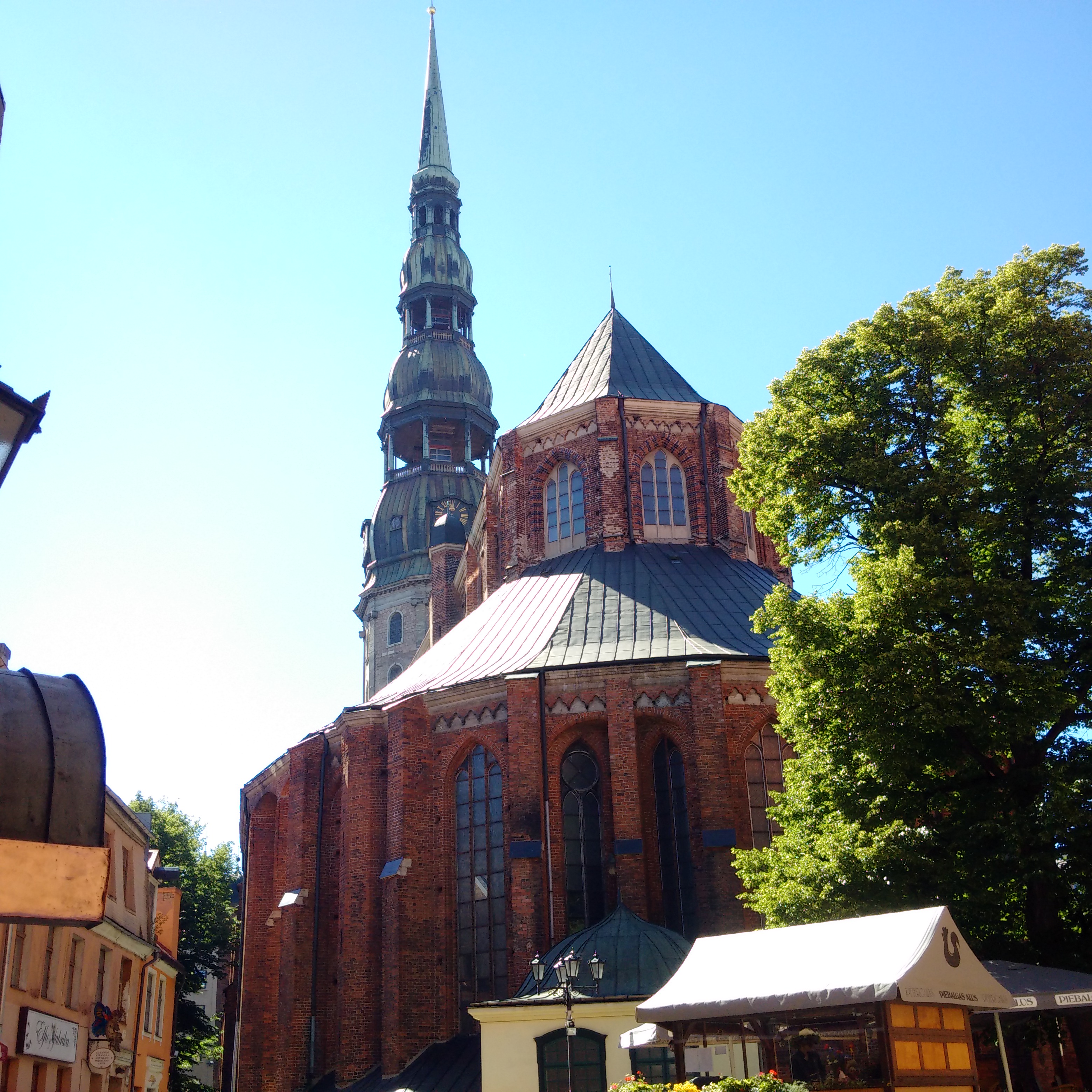 Vom Turm der St. Peter Kirche habe ich ein rundum-Video gemacht 70 m über der Stadt. Man kann nur mit dem Aufzug hoch für stolze 9€. Für die Kirche ansich sollte ich auch nochmal 3,50€ bezahlen. Es ist eine ziemlich ausgeräumte Kirche mit imposantem Bachsteinwerk, sehr hohen Kreuzgewölben und einem schlichten Altar. Da reichte mir der Blick von der Empore, dem Fahtstuhleingang – da wo eigentlich die Orgel sein müßte. Der Turm muß sicherlich noch grundlegend überholt werden. Die anderen zwei großen Hauptkirchen sehen aus, als seien sie besser in Schuß, die sind aber nicht so schön hoch und haben schlichtere Türme.