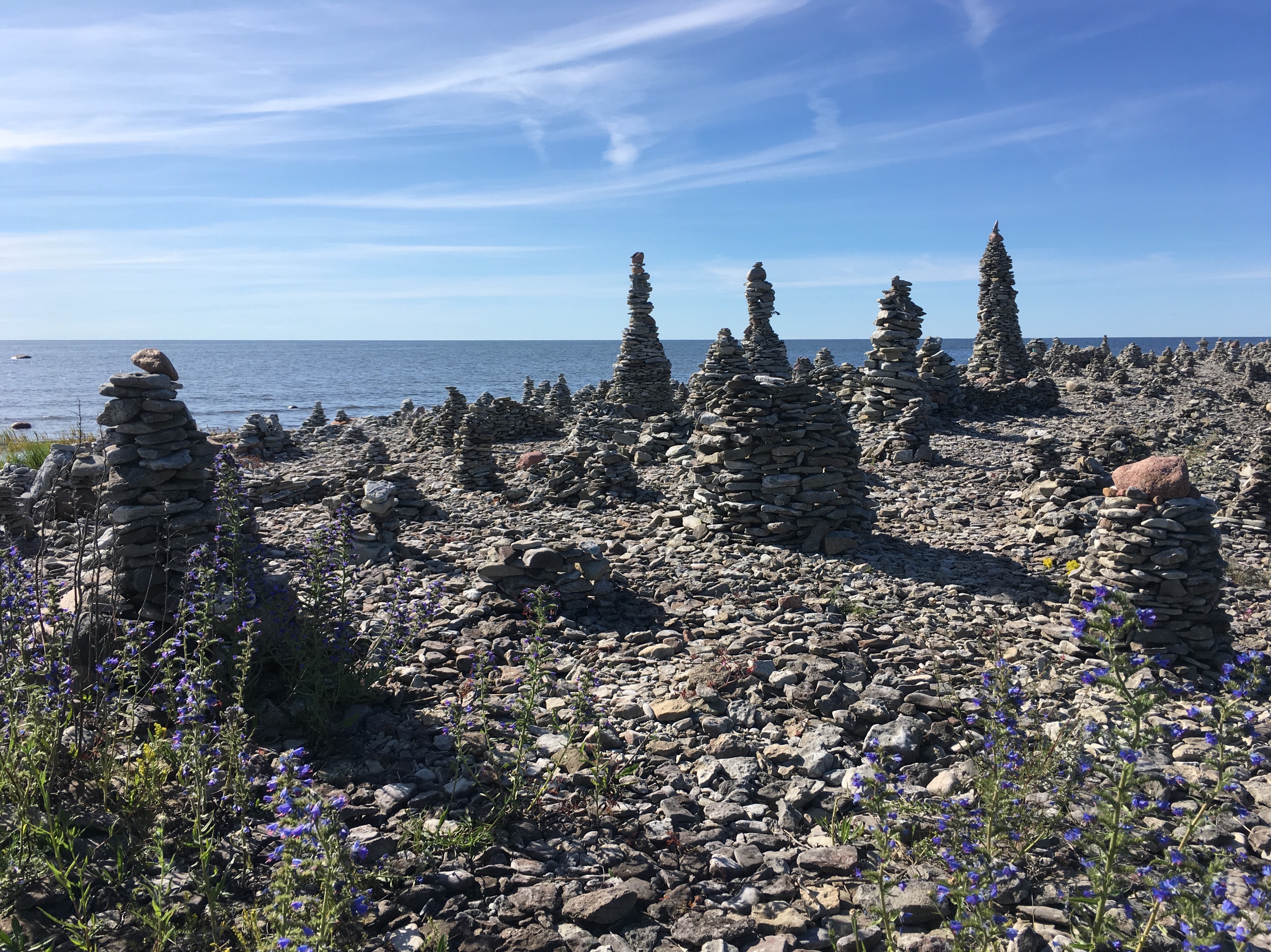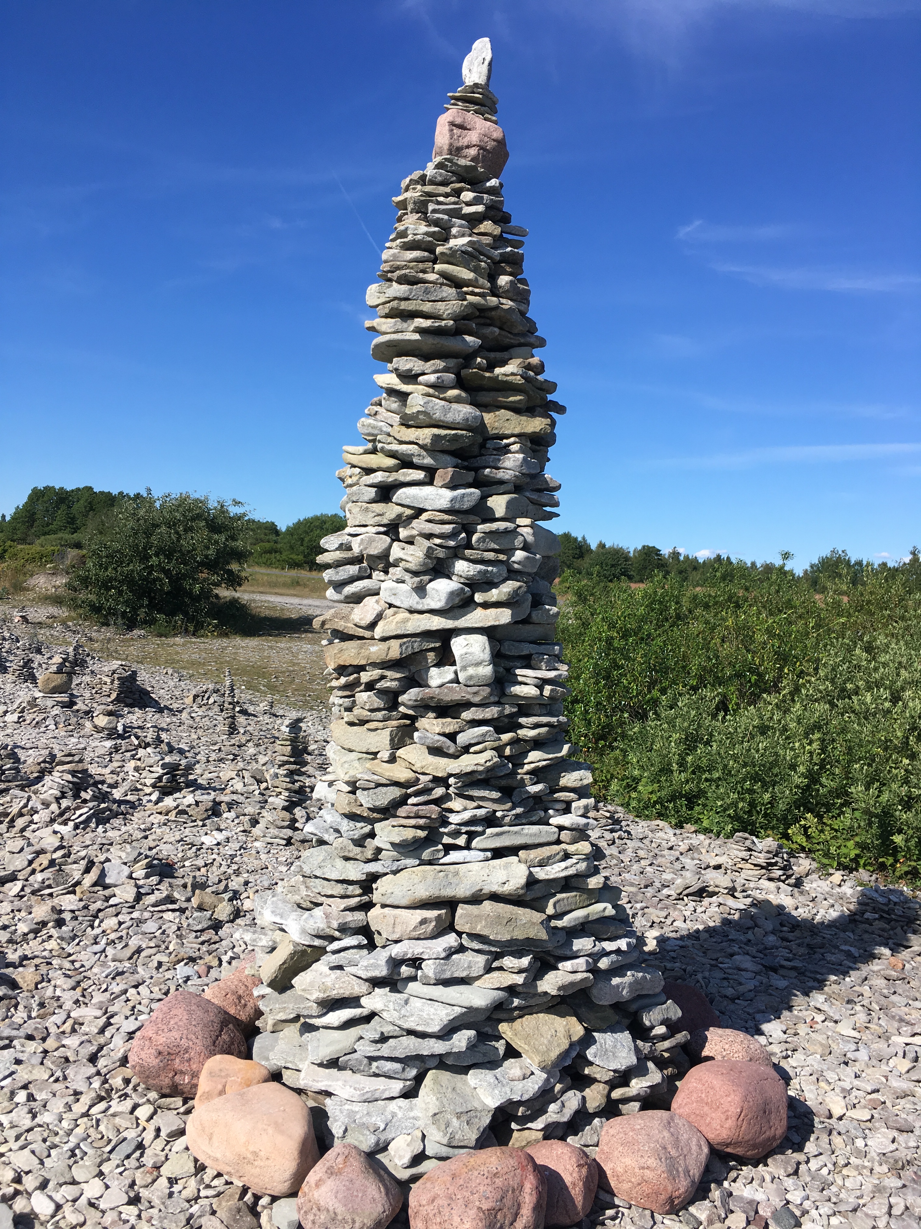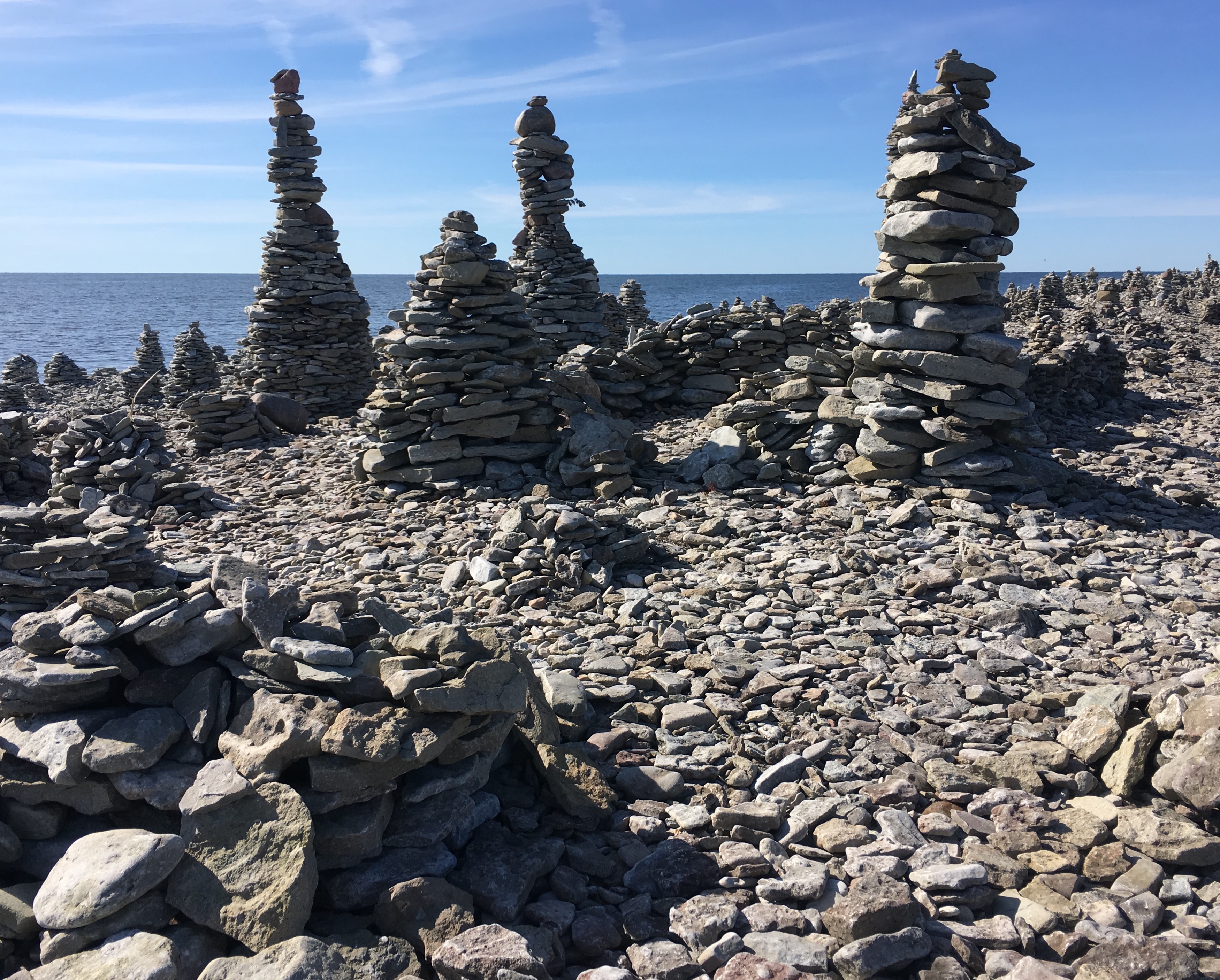 Nach 24km um die Südspitze komme ich zu einem schönen Steinstrand mit unzähligen aufgestapelten Türmchen. Ein beeindruckender Anblick. Der höchste Stapel ist über drei Meter hoch! Hoffentlich hält das, wenn hier Stürme toben.