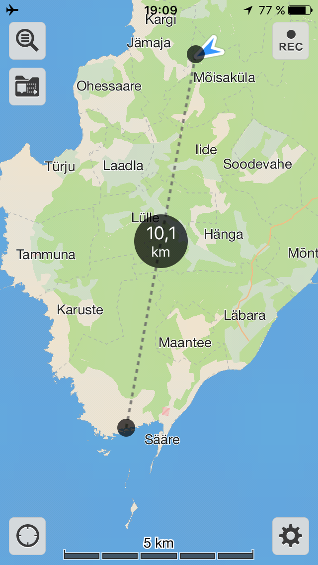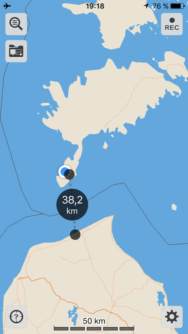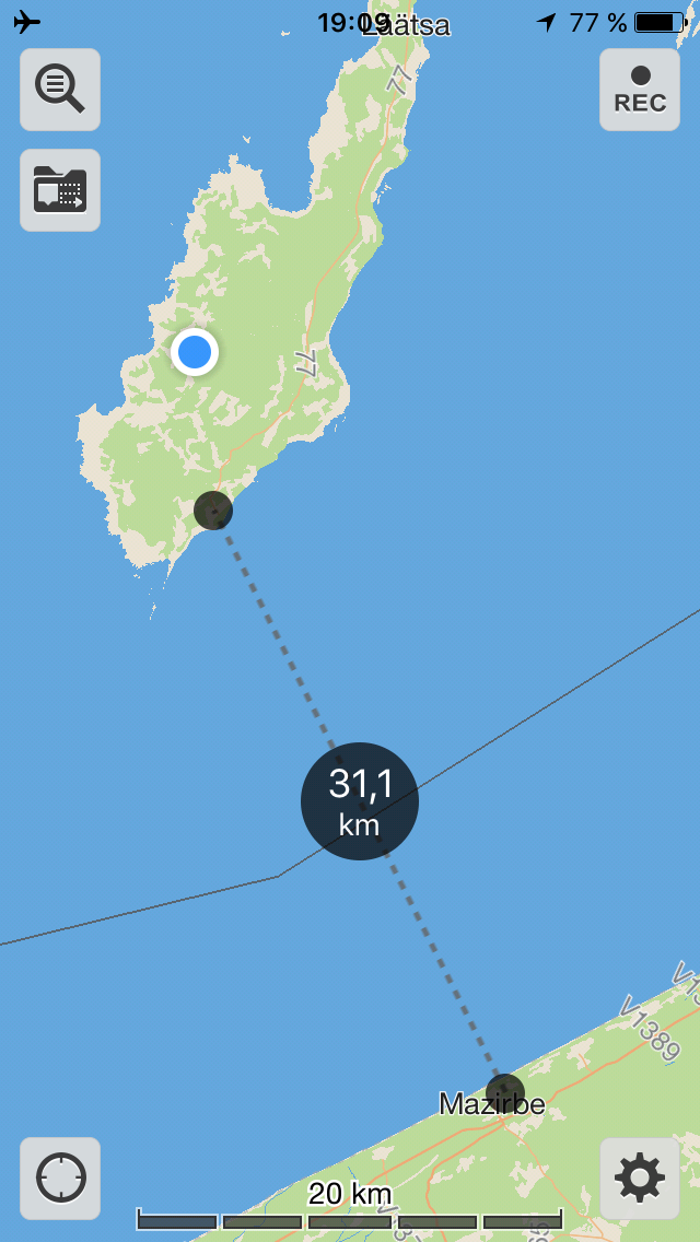 Drüben In knapp 30km Entfernung kann man Lettland sehen. Dort wo ich an äußerst einsamen Strand mit Sehnenproblemen und Trinkwasserknappheit vor 4 Wochen lang gewandert bin, sieht man den Wald des Slitere Nacionalas Parkas als leichte Erhebung über dem Horizont. Bis auf das kleine Stück Wasser, durch das fast alle Schiffe von und nach Riga hindurch müssen, habe ich die Rigaer Bucht komplett umrundet.