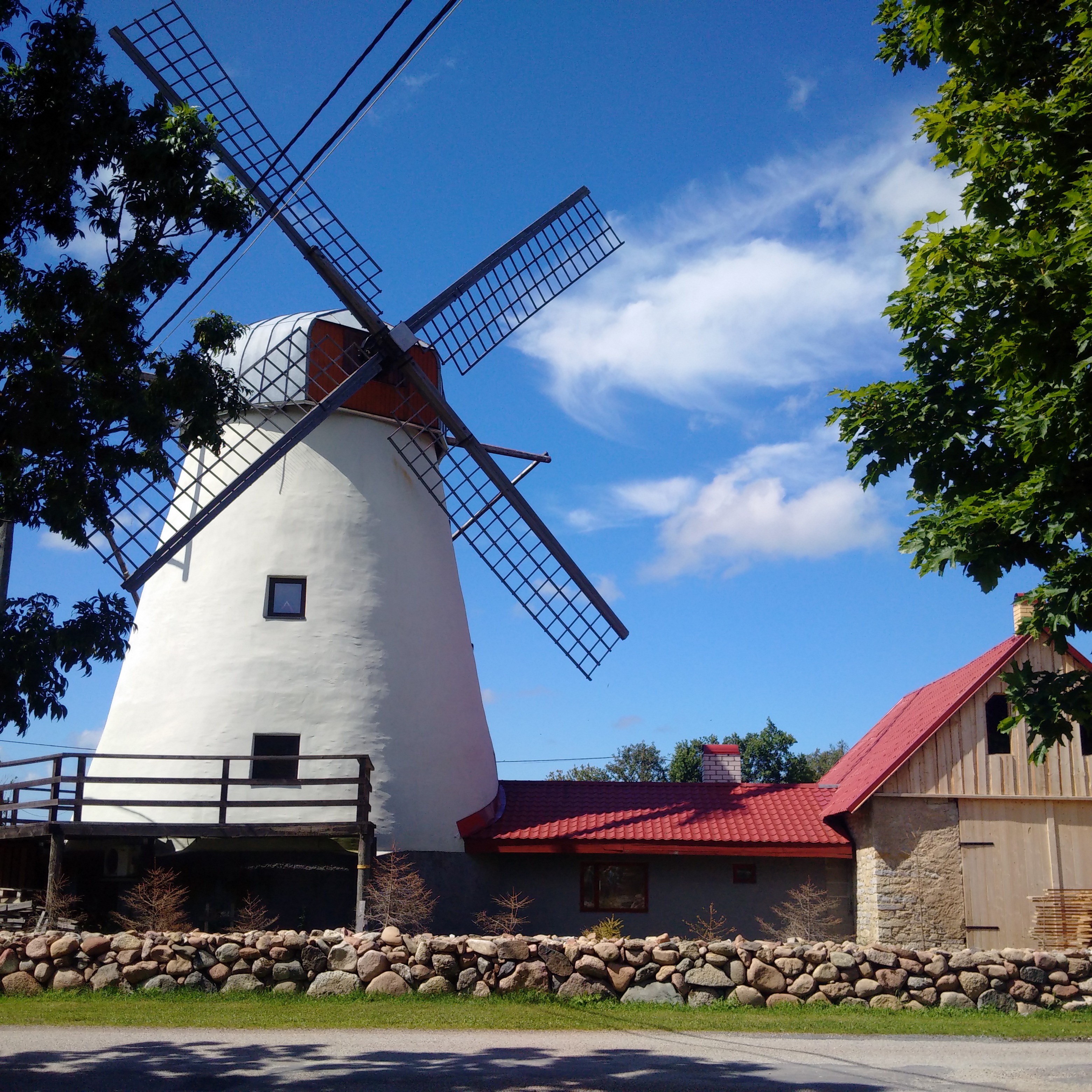Mein Ziel sind die Klippen von Panga „Panga Pank“. Vorher komme ich durch Mustjala; hier gibt es einen Laden für meine Vorräte und eine schöne Kirche. Dazu eine frisch renovierte Holländermühle.