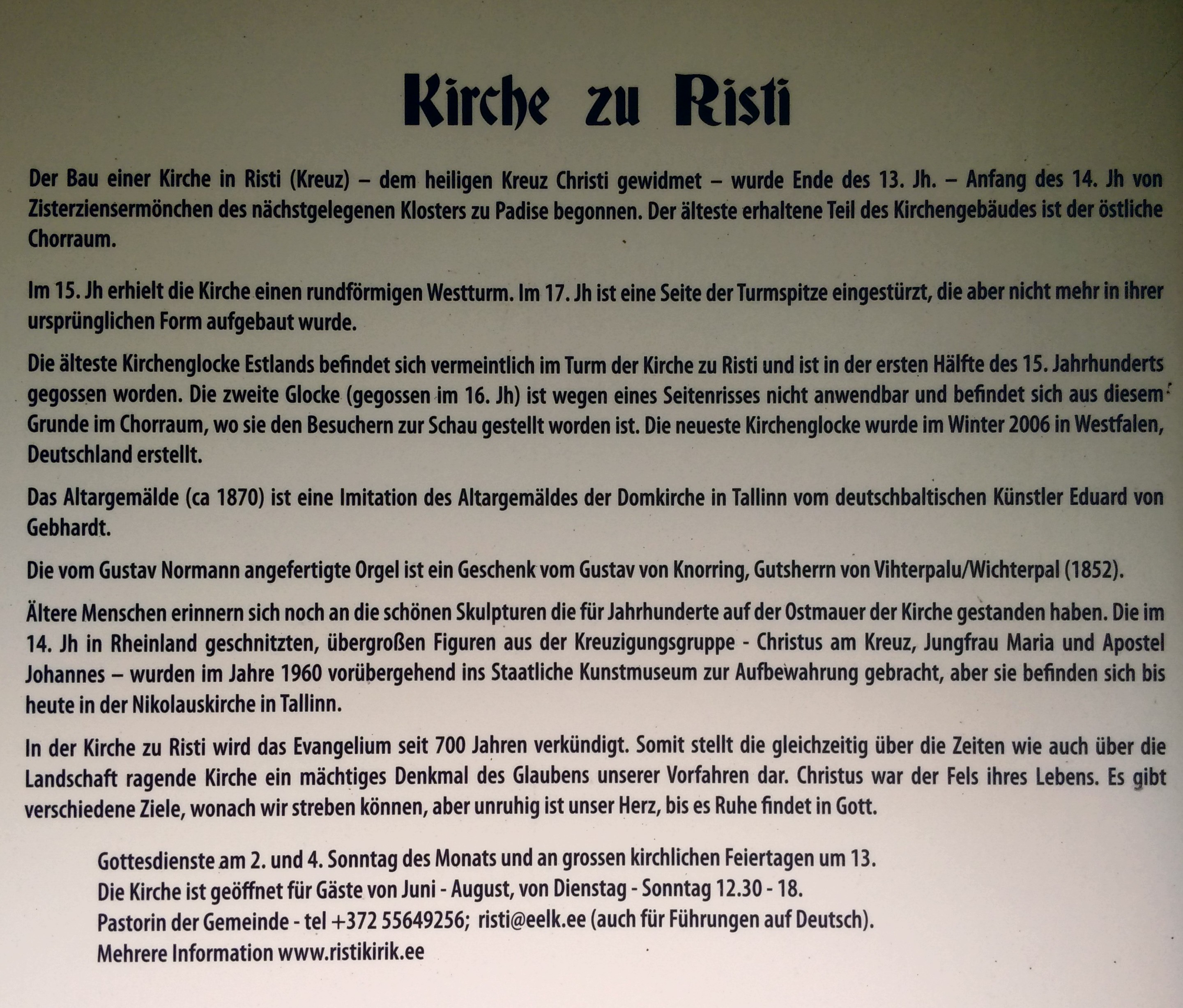 In Harju Risti (Kreuz) sah ich die wahrscheinlich älteste Kirche während meiner Reise. Sie wurde von Mönchen aus Padise erbaut und beherbergt auch die ältesten Glocken Estlands. Der eigentlich runde Turm war zur Hälfte eingestürzt und wurde dann nur mit einer geraden Wand wieder aufgemauert. So ist er kurioser weise ein Halbzylinder. Leider ist heute der einzige Wochentag, an dem die Kirche nicht offen ist.