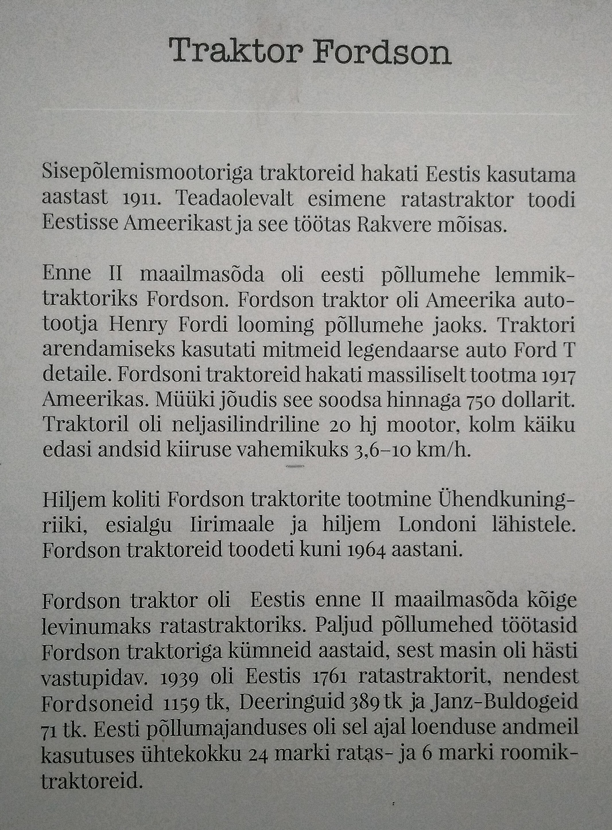 Ein Highlight ist sicher der 90 Jahre alte Traktor der Marke Fordson. Die Firma wurde von Henry Ford gegründet und zog aber vor 80 Jahren nach London um. Nicht rausbekommen könnte ich, ob der Trecker aus amerikanischen Teilen hier in Tallinn zusammen gebaut wurde oder im Ganzen importiert wurde. Auf jeden Fall war er vor dem letzten Krieg der mit Abstand beliebteste Traktor in Estland (1159 Stück gegenüber nur 71 Lanz Bulldog und 389 zugelassenen John Deer).
