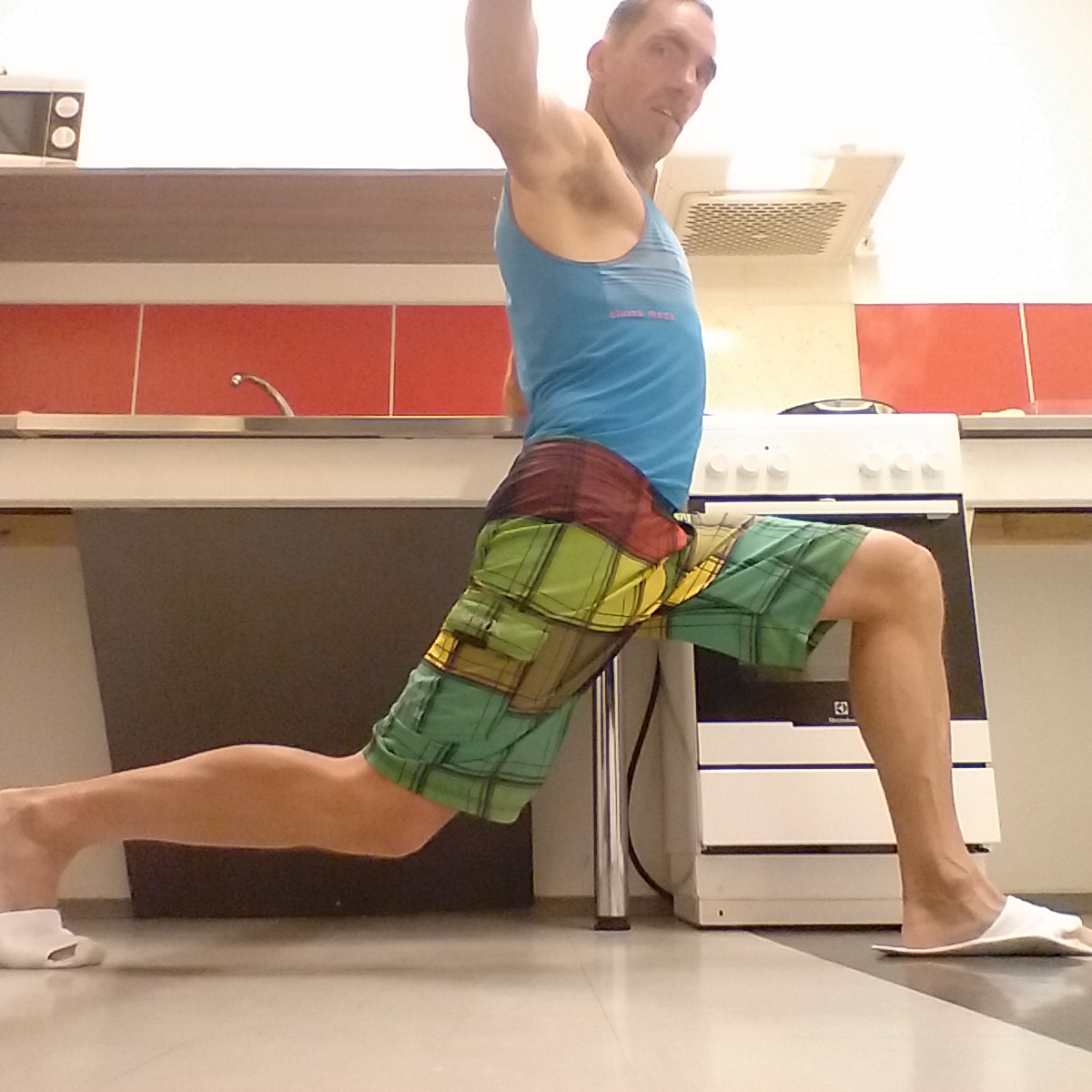 Während des Kochend dehne ich mich vor dem Herd. Eine nicht ganz vorteilhafte Perspektive, das gebe ich zu. Dann kommen andere auch zum kochen und ich lasse das.