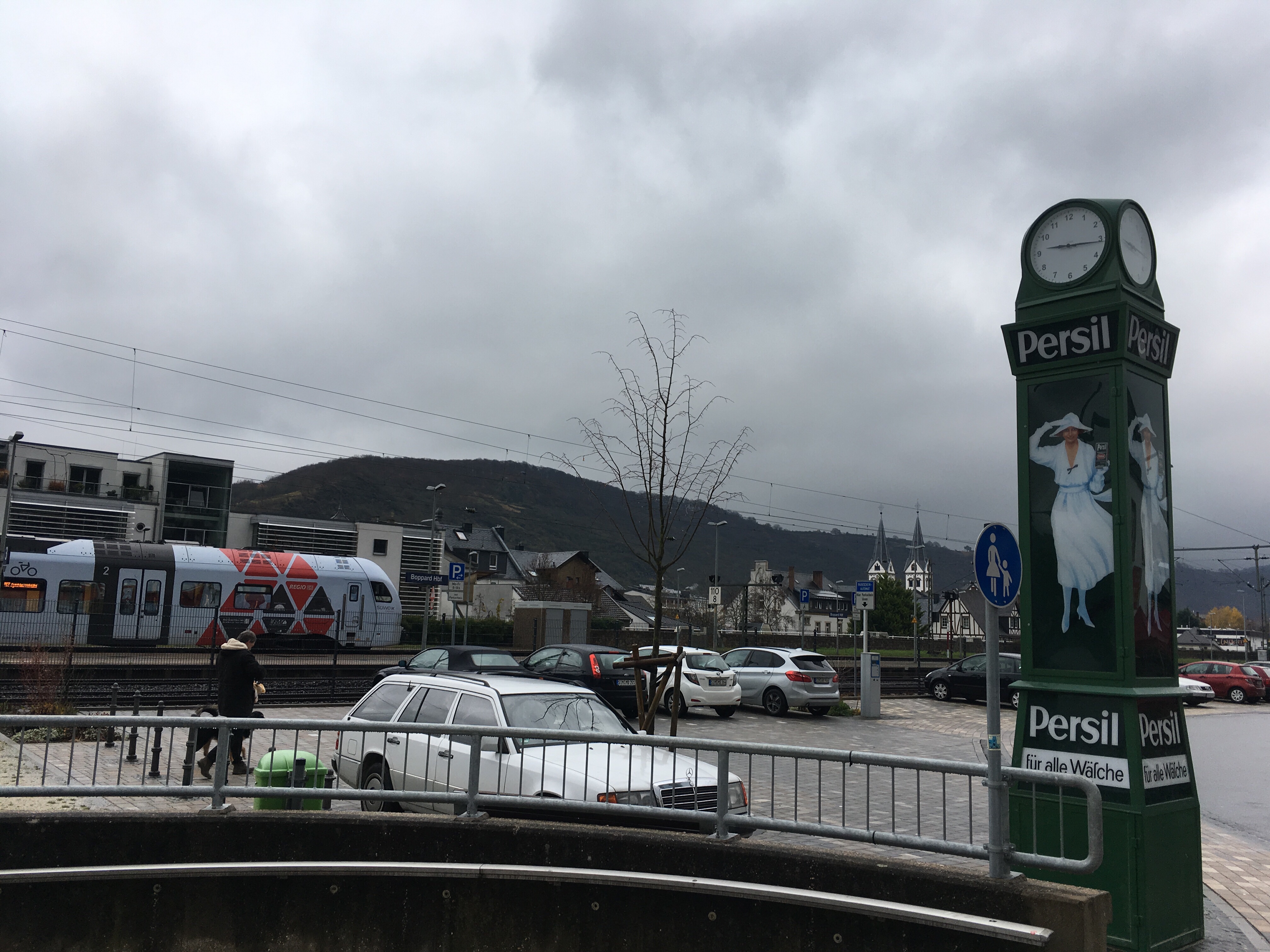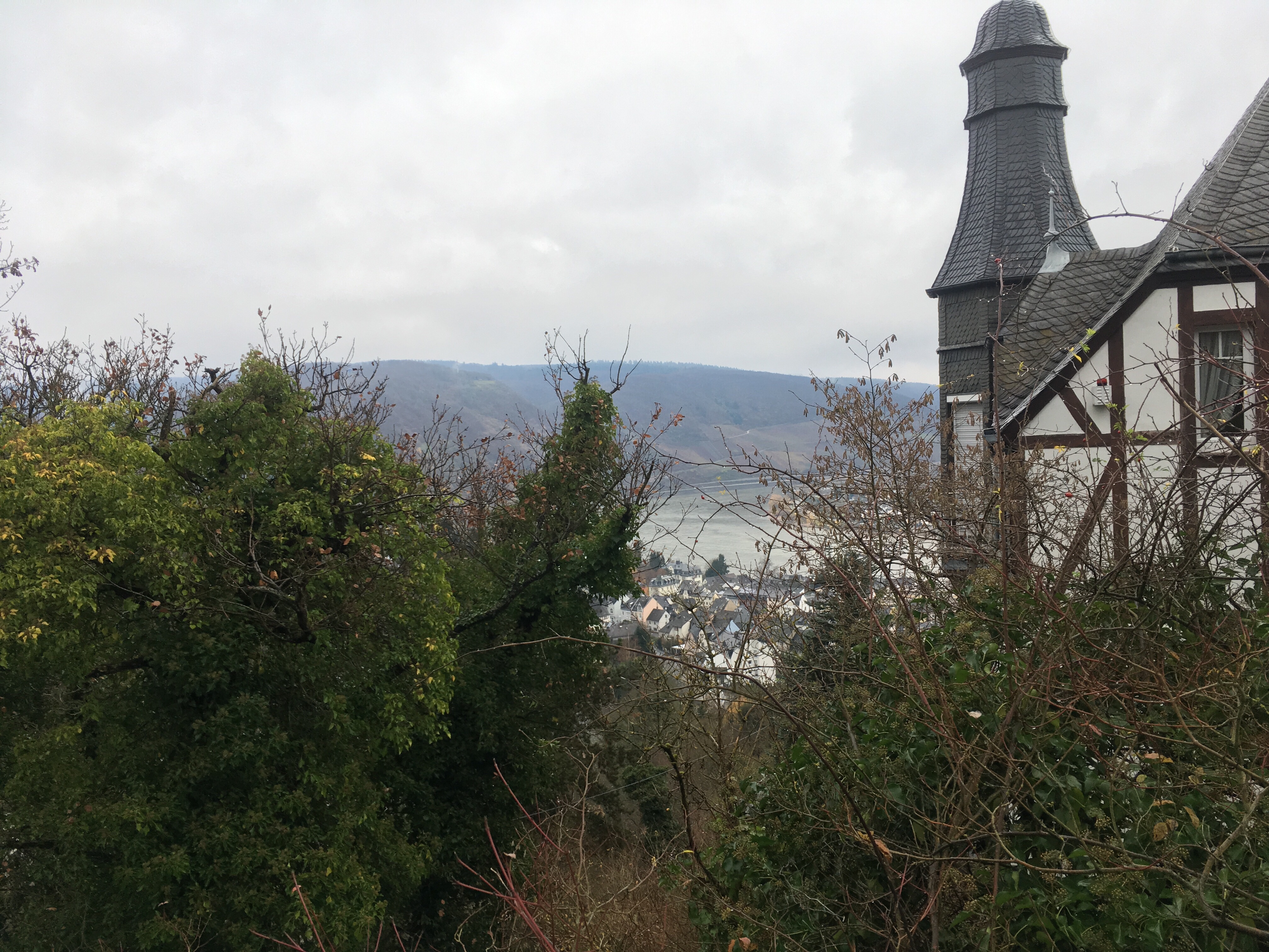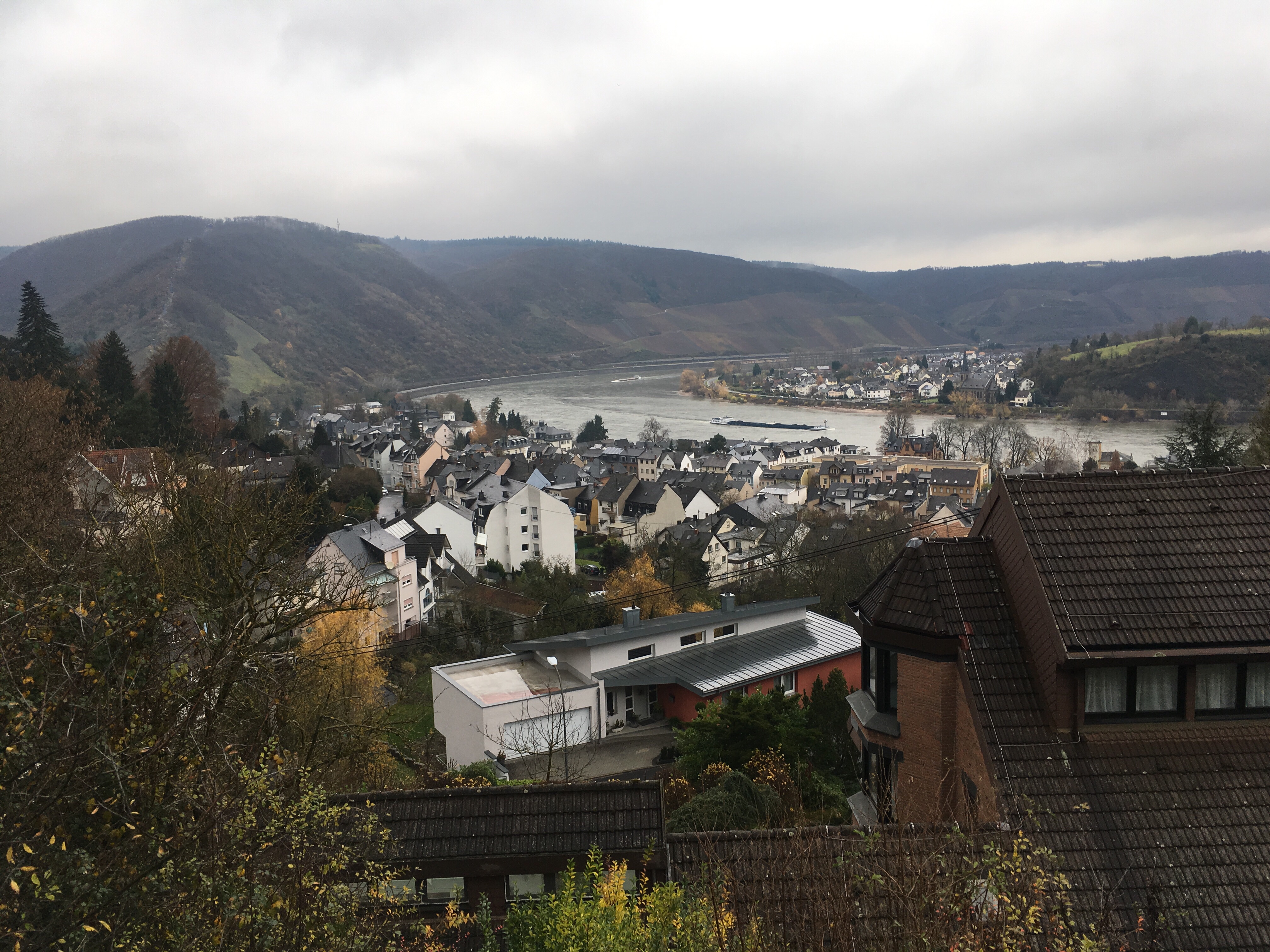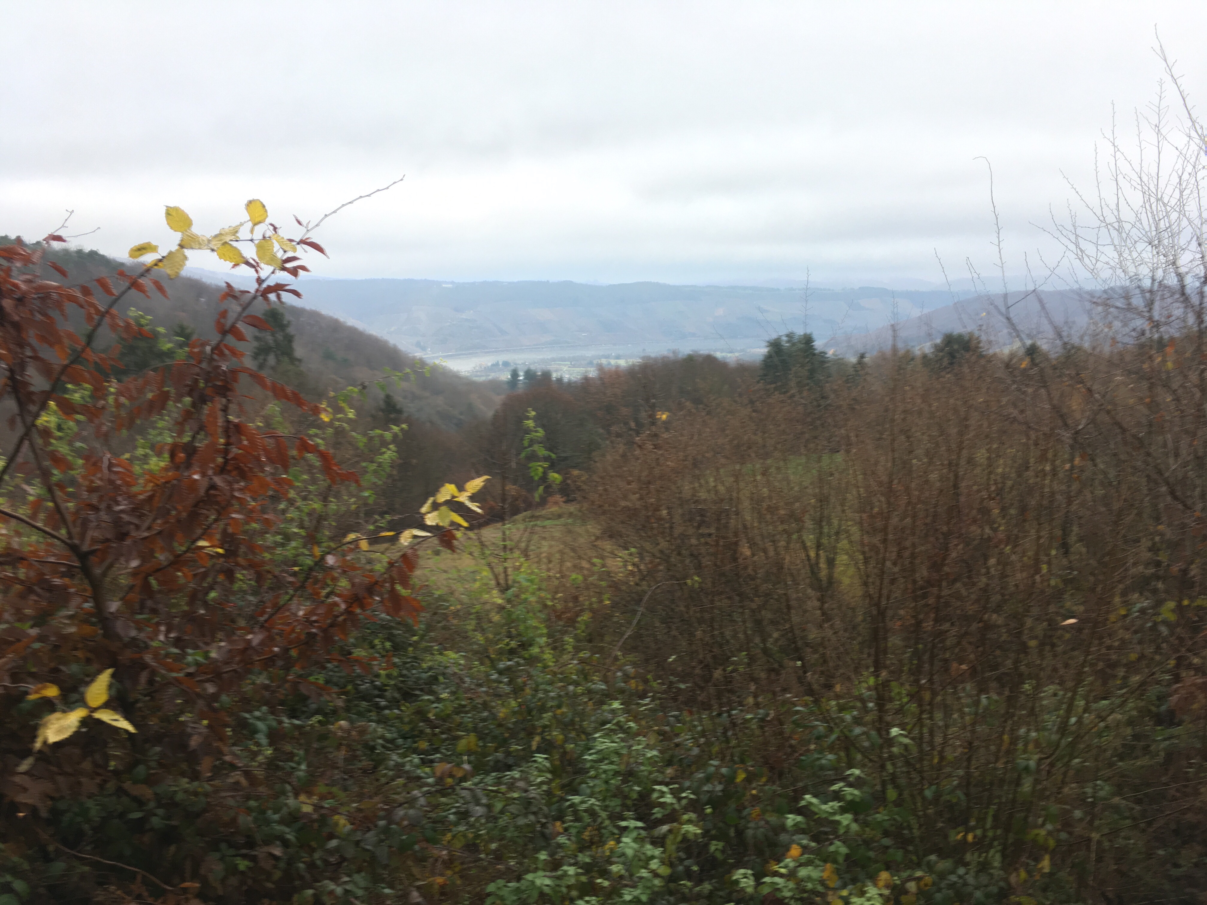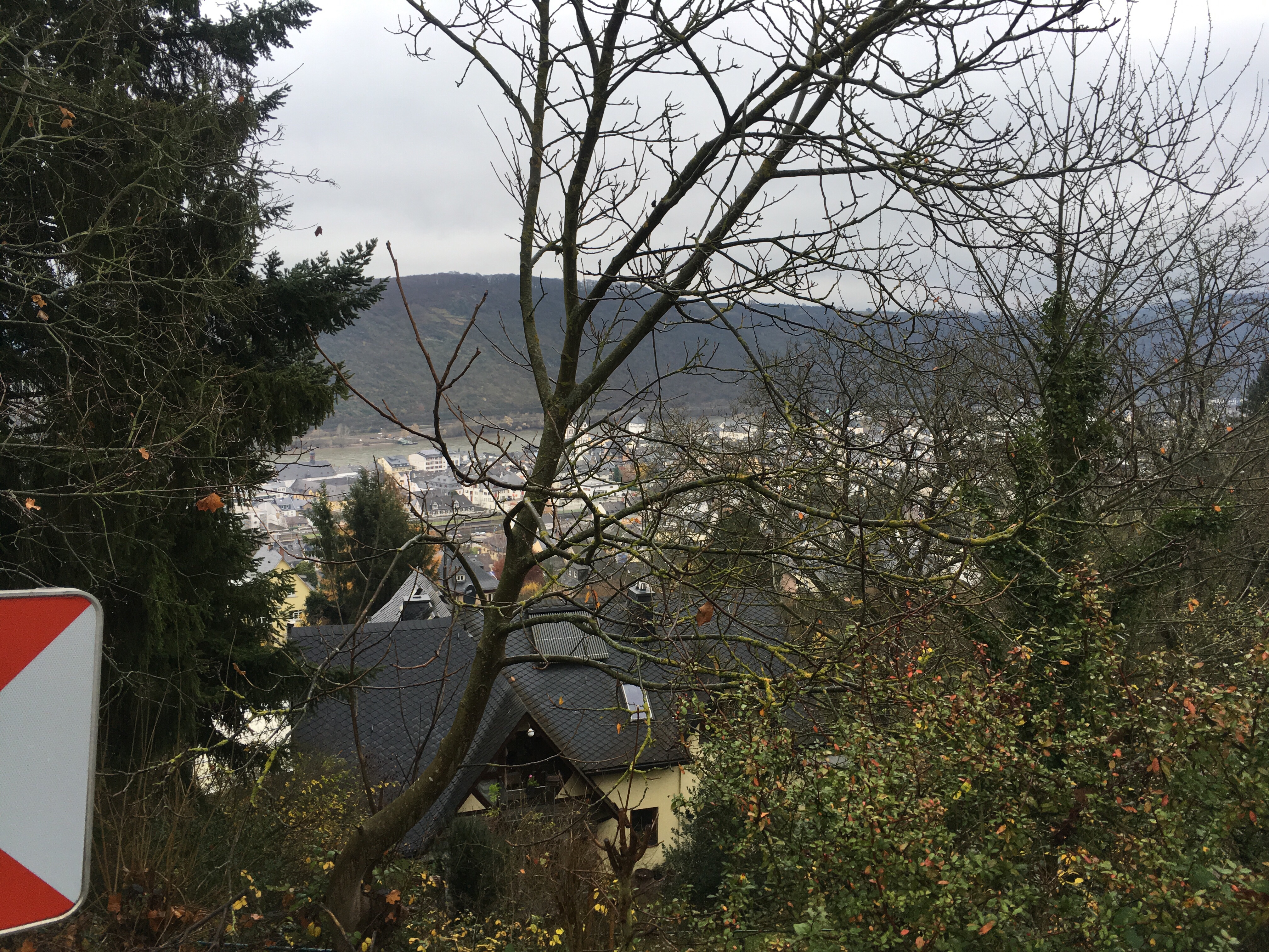 Dann geht es entlang der Bahnlinie, ich liebe ja, Züge fahren zu sehen. Dann wieder lange hoch durch ein Nachbartal mit immer neuen Aussichten auf den Bopparder Hamm, die andere Rheinseite und die Stadt.