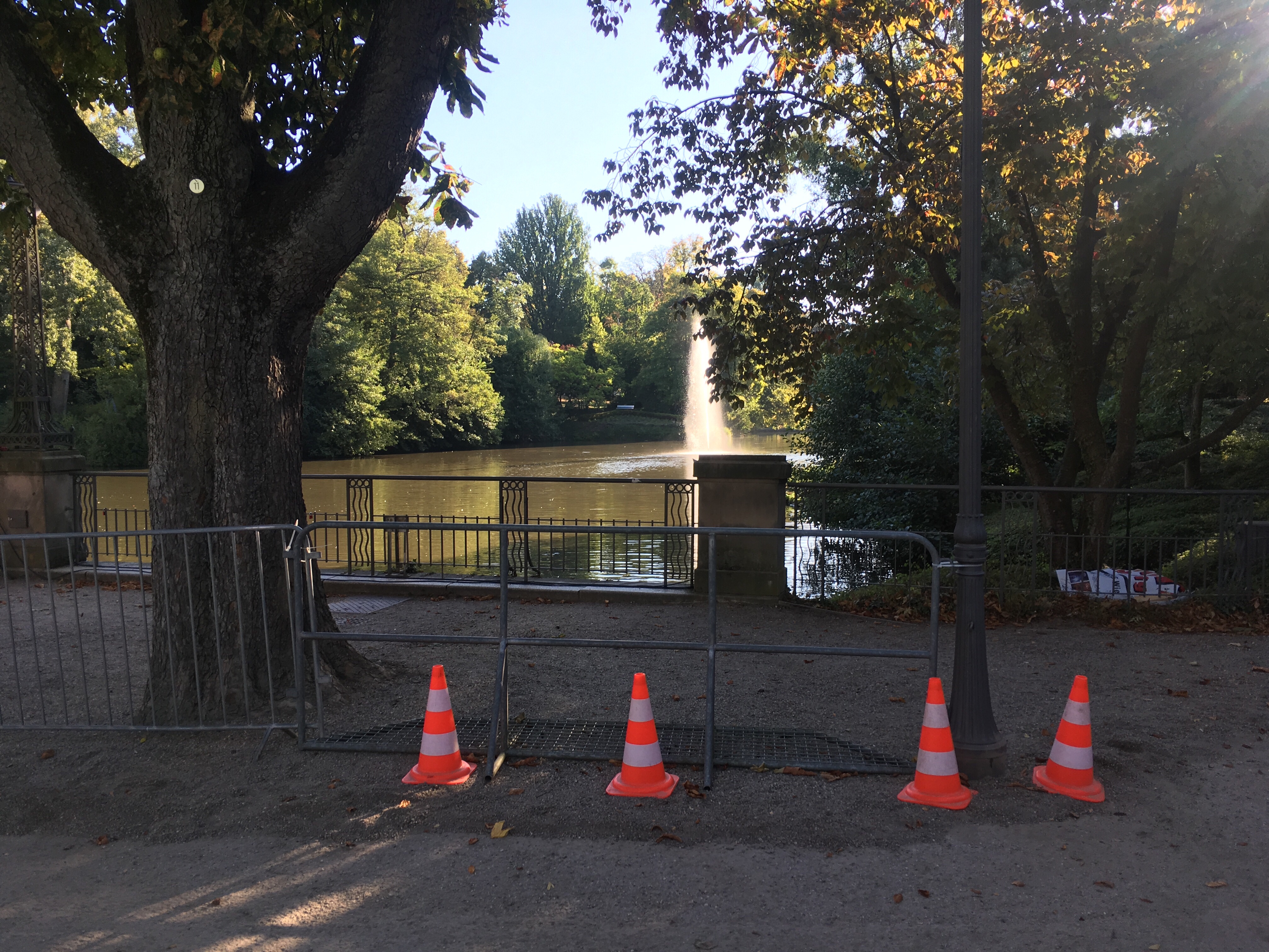 In aller Frühe säuselt die Fontäne im Wiesbadener Kurpark noch vor sich hin. Nur die Hütchen deuten schon an, daß hier später insgesamt ca. 2.000 Läufer*innen die Richtung angezeigt werden soll.