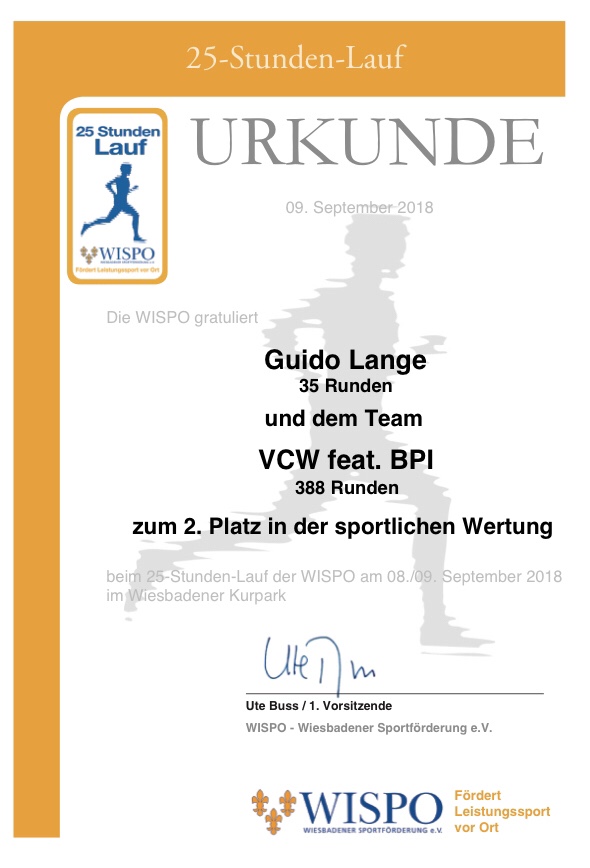 Wiederholungen sind nicht meine Stärke, aber der 25 Stunden Lauf von Wiesbaden macht süchtig. Axel Hamann vom BPI Best Practice Institut hatte mich wieder in sein Sportteam geholt: VCW fest. BPI (hängt mit dem Volleyball Club Wiesbaden zusammen). Und wir haben einen Auftrag: Letztes Jahr Platz 4 – dieses Jahr Platz 3!