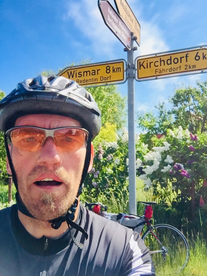 Am Doberaner Platz nach gerade mal 23 km saß ich in der Sonne mit Rhabarber Kuchen und Milchkaffee – so wird aus mir kein harter Knochen mehr. Das Leben ist einfach zu schön dafür.