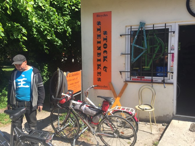 Daneben eine Bikereparatur, wo ich mich angeregt mit Thomas unterhalte. Er war 2005 mit einem alten Deutz-Traktor 18 Monate unterwegs durch Rußland bis in die Mongolei. Eigentlich wollte ich „nur ein paar Tropfen Öl für meine Schaltung“.