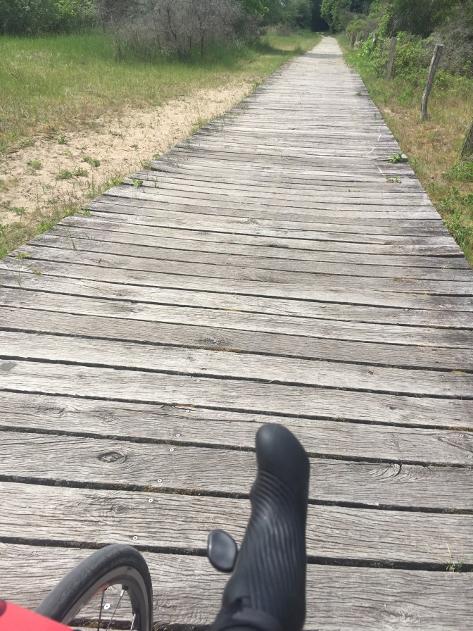 Teils werden Feuchtgebiete mit Bohlen überbrückt. Dat is alles nix für mein Rad.
