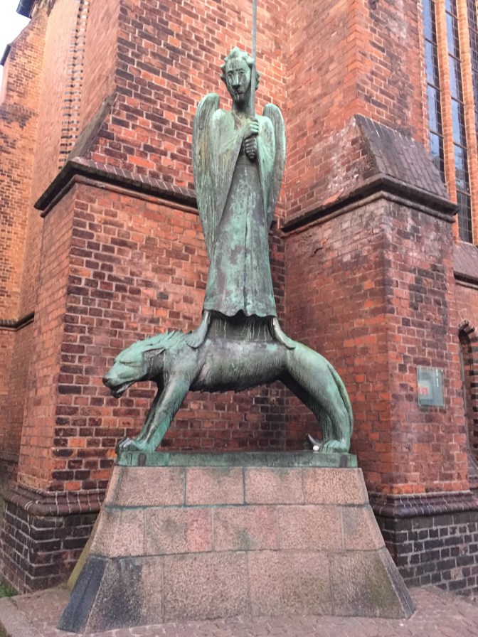 Da entdecke ich den „Geistkämpfer“ von Ernst Barlach, eine seiner ersten impressionistischen Skulpturen. Nicht, daß ich ihn vorher gekannt hatte. Der ist beeindruckend. Der bewaffnete Engel als das Gute siegt über das Böse in Gestalt eines wolfsartigen Tieres.