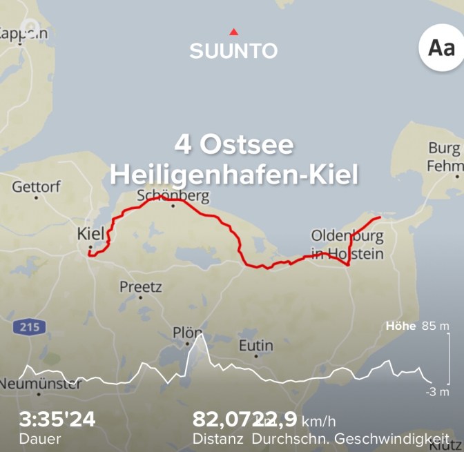 Jetzt fahre ich nochmal einen schönen Bogen bis nach Kiel, um nicht direkt an der Bundesstraße zu sein. Das machen sicherlich viele Radler so, aber es ist nicht ganz leicht, Schilder und Wege sind nicht optimal. Man spürt die Nähe der Stadt, der Verkehr schwillt an, viele wollen nach Feierabend raus nach Laboe oder weniger mondänen Orten. Gut, daß die Tour heute nicht so lang ist, 82 km.