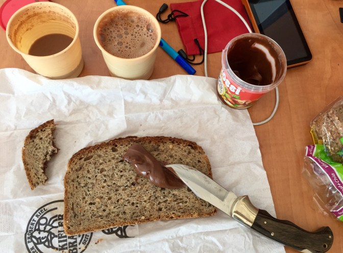 Der letzte umfangreiche Tourentag beginnt mit einem spartanischen Frühstück nach altem Muster. Zwei Becher kaffeeähnlichen Getränks aus dem Automaten, Brot, Nudossi.