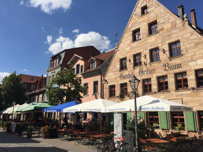 In der Innenstadt ist wenig zu holen, und statt zu resignieren, eß ich erstmal was: es gibt eigentlich nur Fleisch mit Wurst und noch mehr Fleisch. Franken halt. Nix mit veggie.