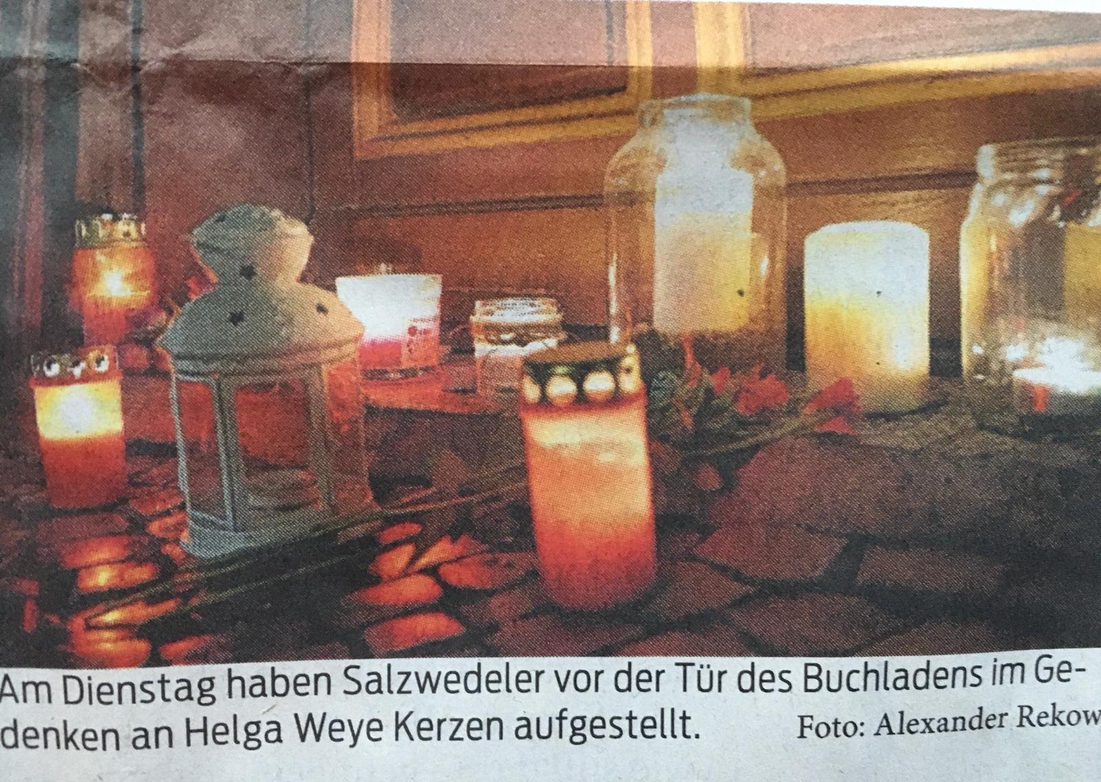 Deutschlands älteste Buchhändlerin Helga Weyhe aus meinem Geburtsort Salzwedel ist zu Beginn des Jahres leider verstorben. Deutschlands Buchwelt hält den Atem an. Bis zuletzt stand sie wie immer in den letzten 70 Jahren in Ihrem Laden und erfreute sich an den Kunden.