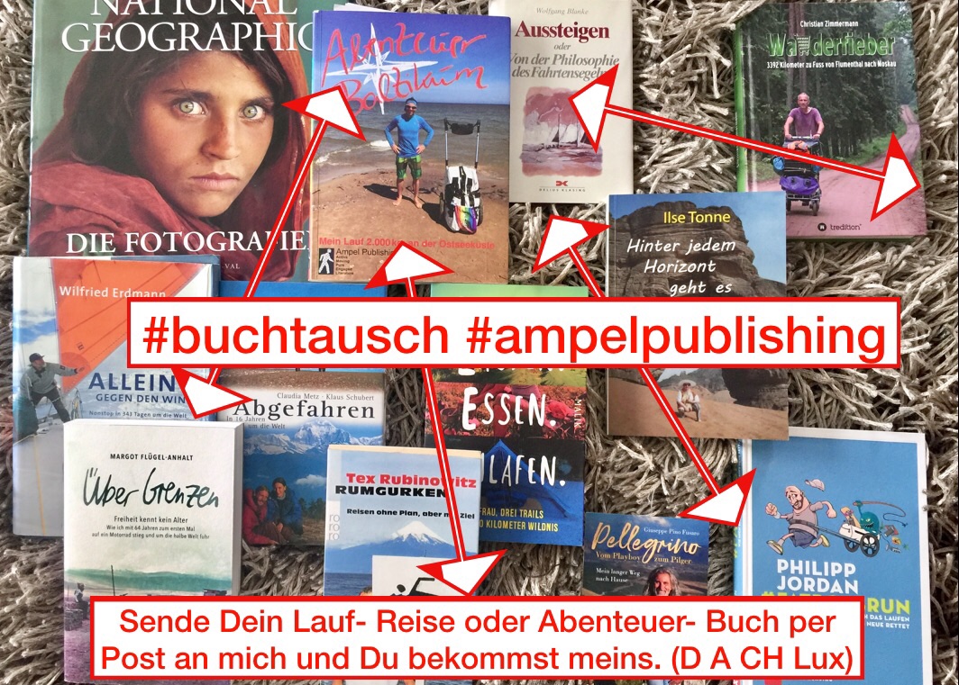 Nun hab ich beim Laufen eine neue Idee – nachhaltig, wie ich finde: Sendet mir per Post Eurer Laufbuch, Reisebuch, Abenteuerbuch im Wert von mindestens 18€ und Ihr bekommt meins dafür. Euer Buch sollte wie neu oder sehr gut erhalten sein. Ihr solltet möglichst in Deutschland oder einem Nachbarland wohnen.
