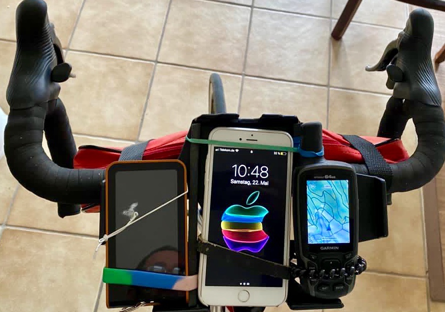 Um alle Geräte auf einen Blick zu haben, mußte ich mir etwas einfallen lassen. Einen älteren Rahmen für ein Tablet habe ich etwas aufgefräst und daran befestige ich dann alles, was ich brauche, inklusive einer Solar-Powerbank, die ich schon im Baltikum dabei hatte.