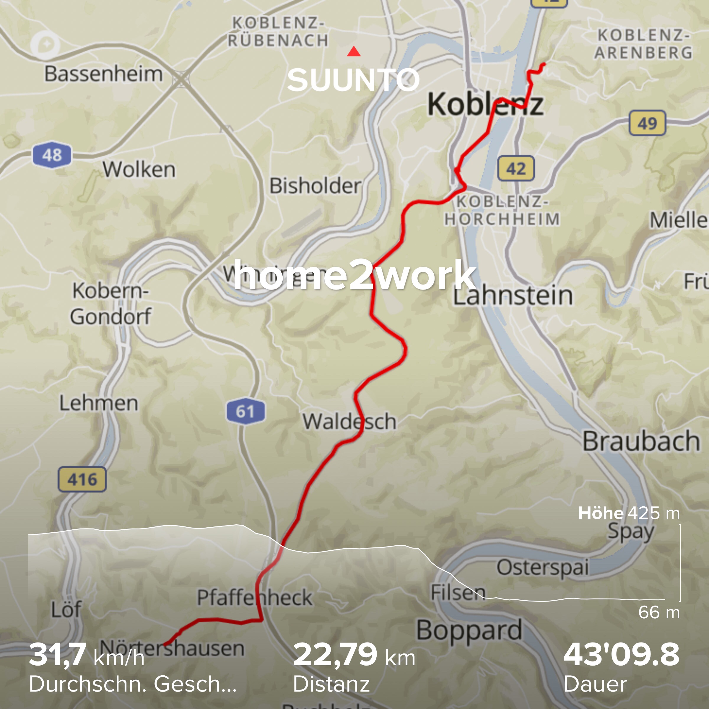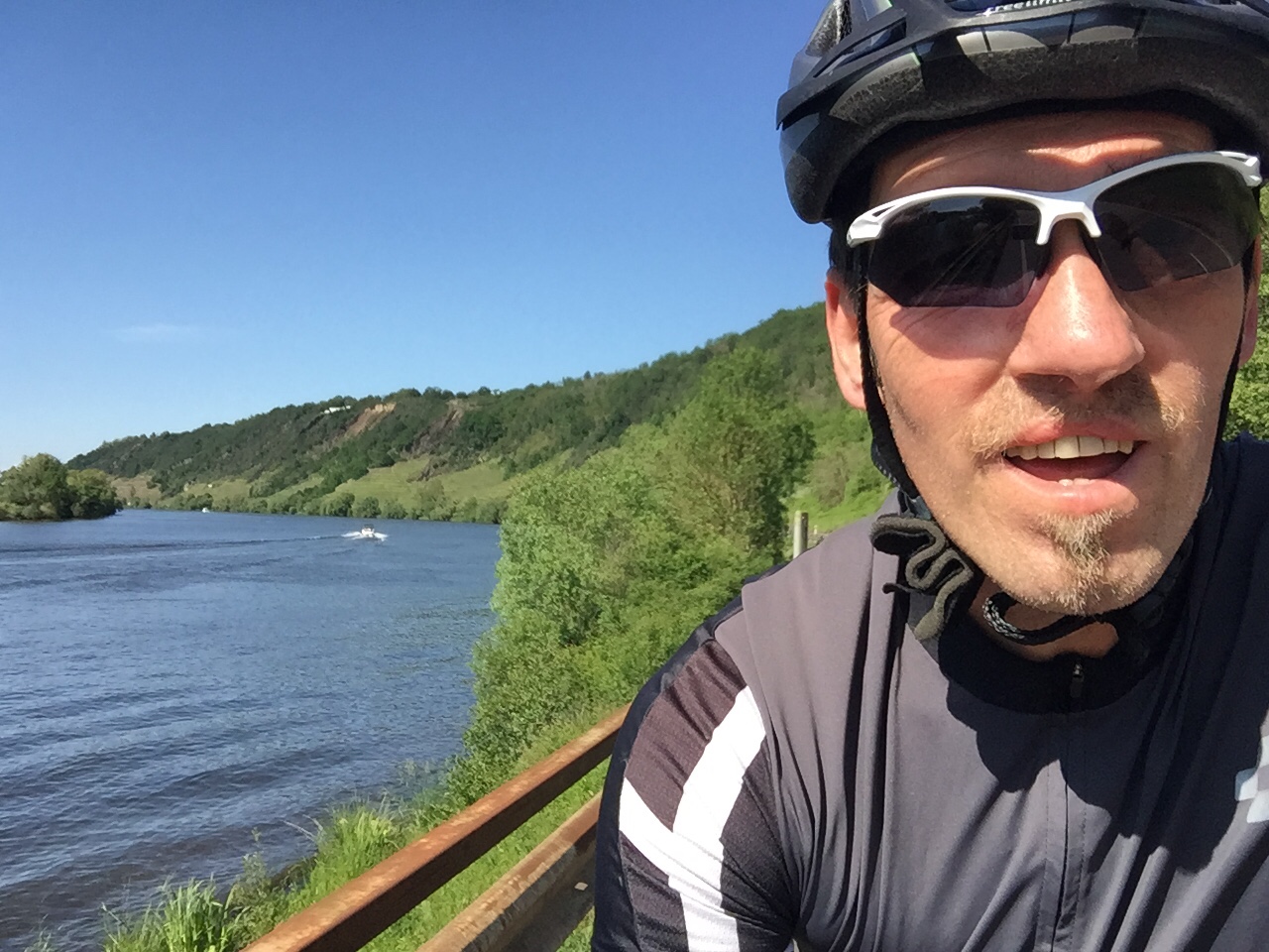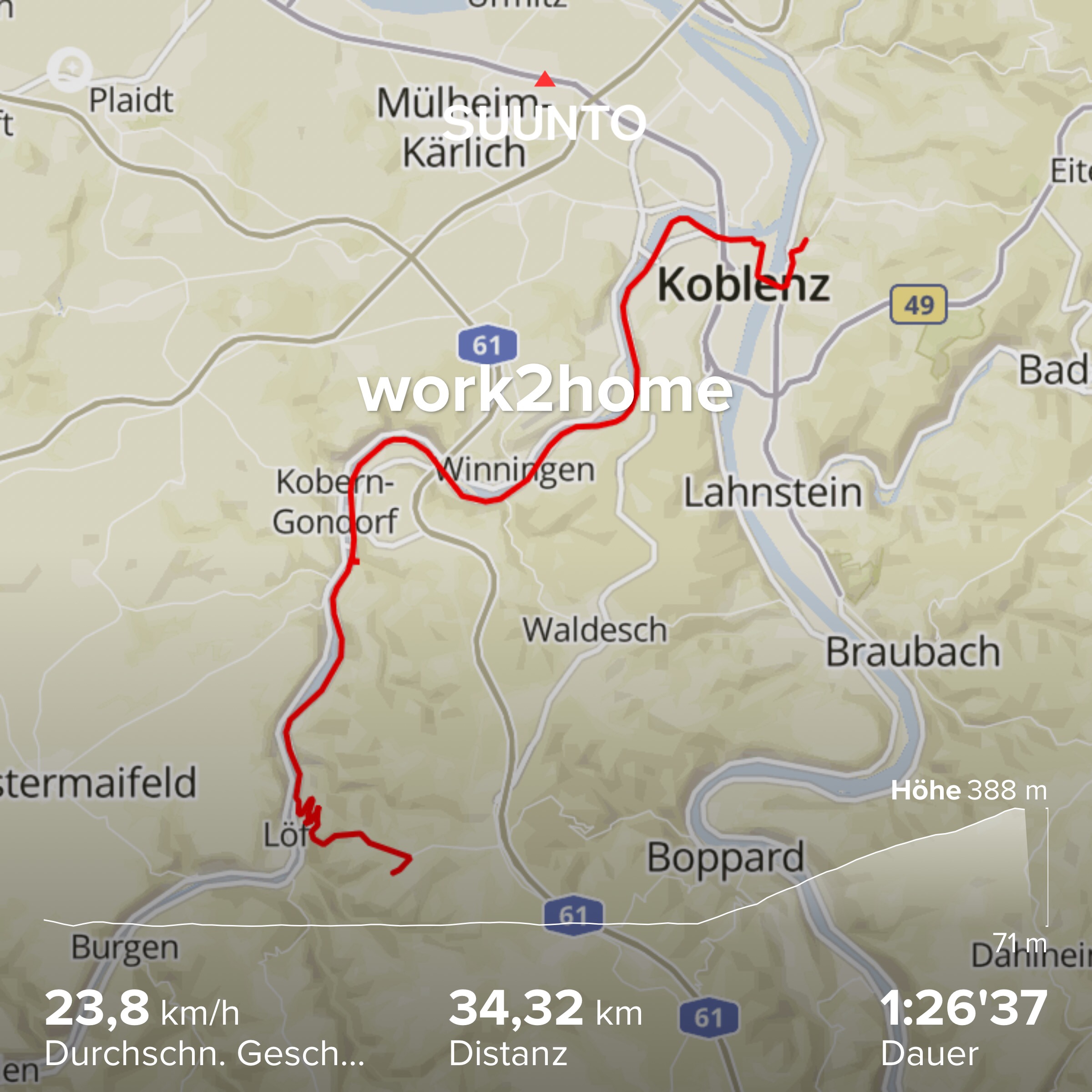 Abends kann ich auf der vielbefahrenen Straße ohne Radstreifen nicht hochfahren, sondern es geht an der Mosel entlang und dann zum Schluß hinauf in den Hunsrück.