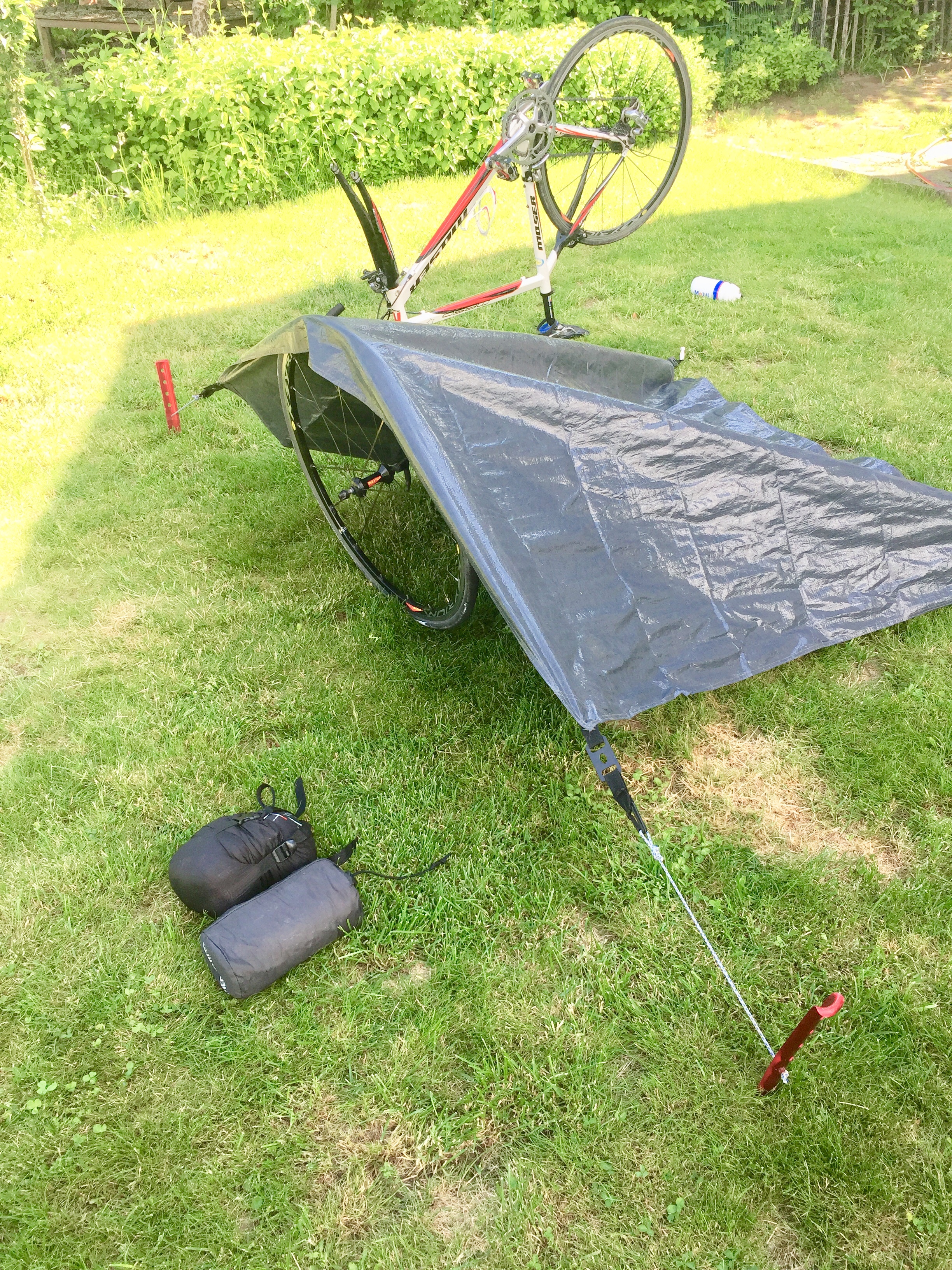 Als Notunterkunft habe ich heute eine Plane ausprobiert, denn ich bin mir nicht sicher, überall eine Unterkunft zu bekommen.