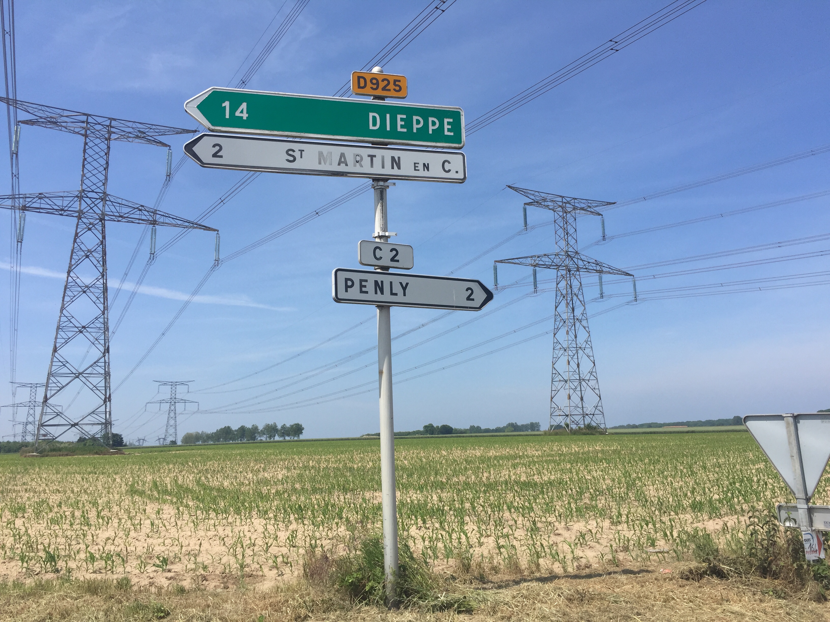 Wahrscheinlich verpaßte ich durch die Fahrt auf der Landstraße ein paar Klippen aus Kalkstein. Ich las so etwas auf Schildern. Ich konnte sie auch erahnen, denn immmer in der Nähe von Küstenorten (die alle mit „s/ mer“ (sur mer) bezeichnet sind (am Meer) ging es in wilder Fahrt bergab, aber dann natürlich auf der anderen Seite mühsam wieder hoch. Die restliche Zeit fuhr ich wohl auf dem Kalkstein oben herum. Es war vielleicht auch gut, auf den 70 km bis Dieppe heute keine Pause zu machen, denn bei Pency gibt es eine ‚Site Electronucleaire‘. Darauf deuten auch die vielen Stromtrassen hin, die in die Richtung gehen.