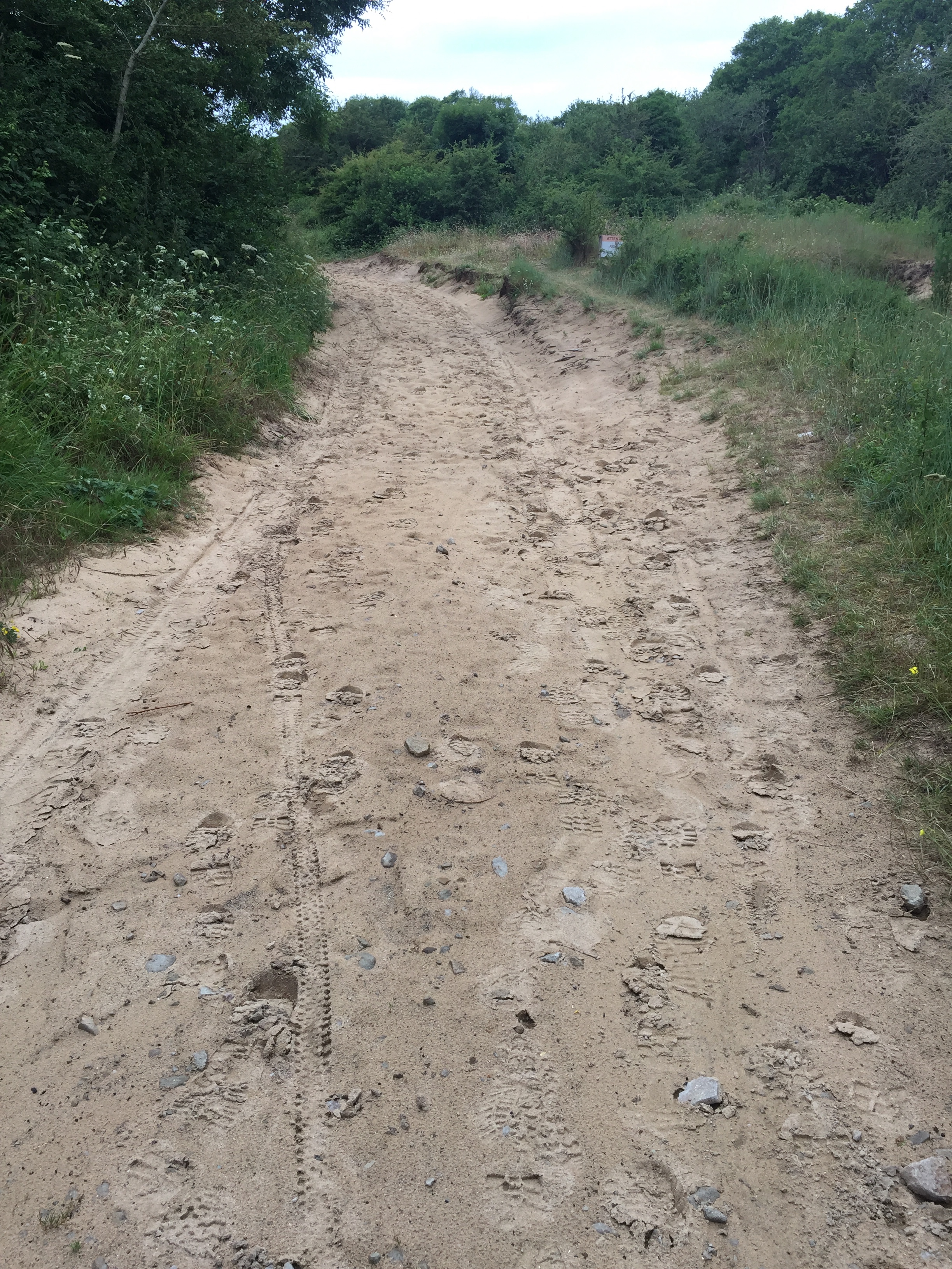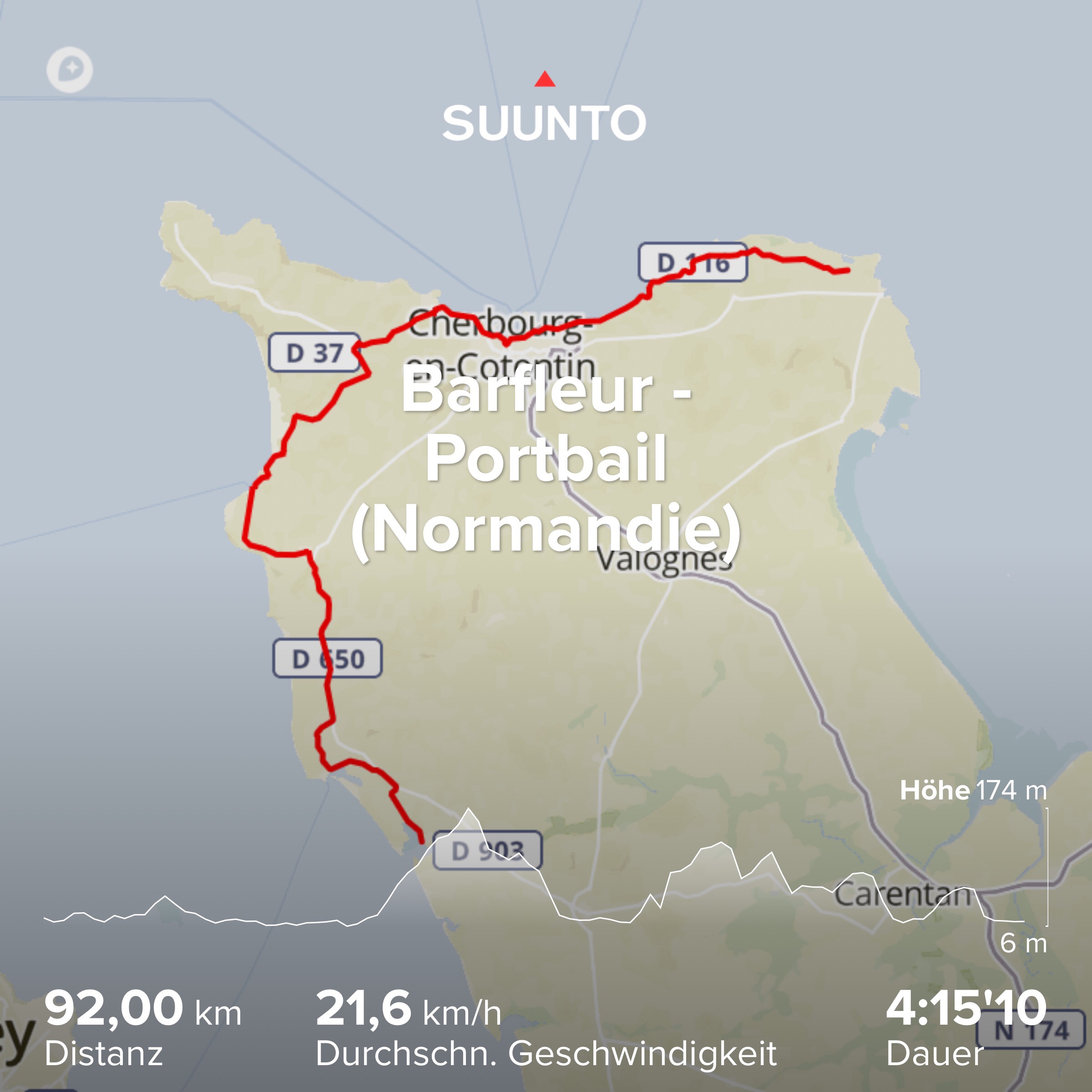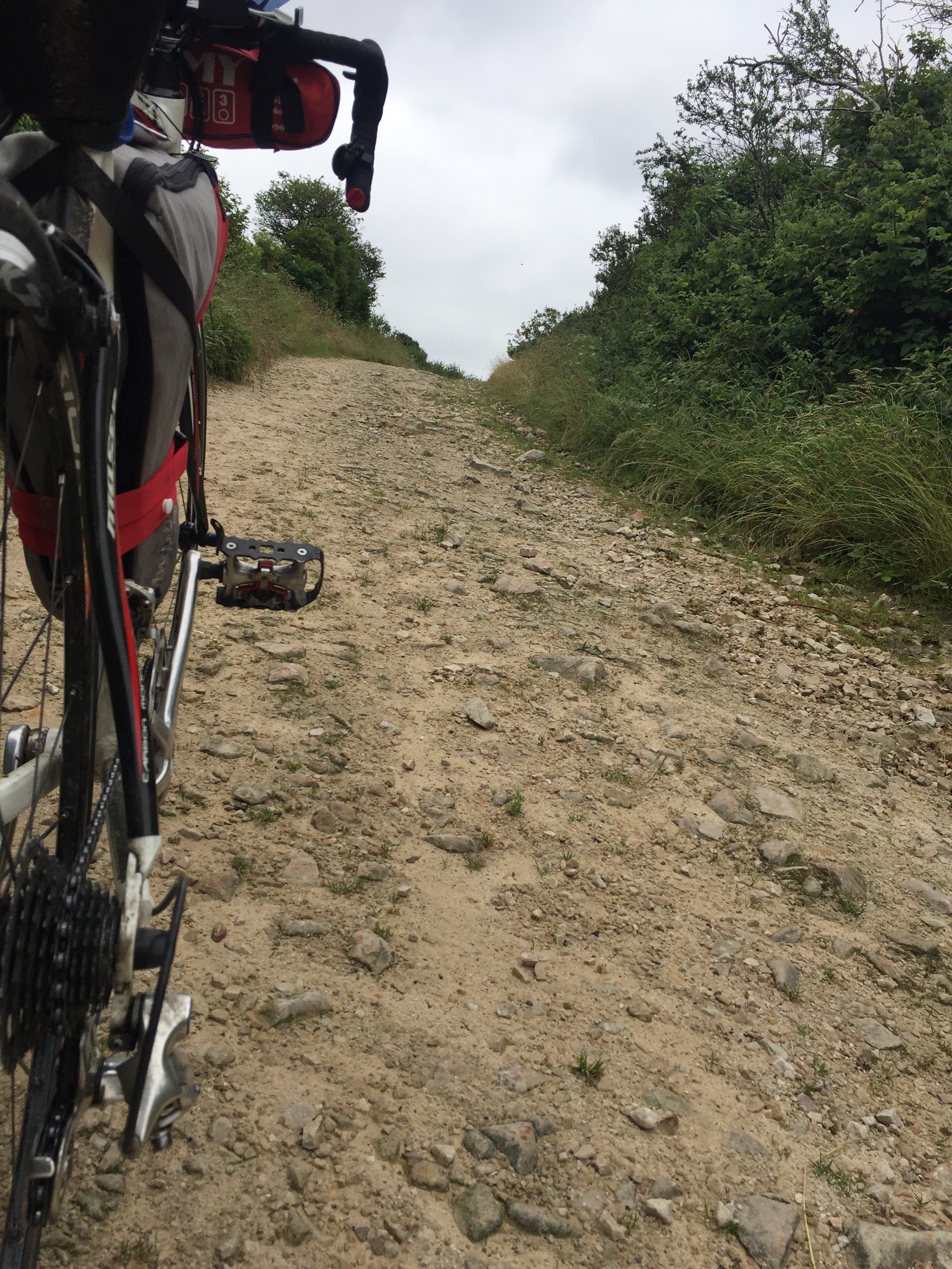 Ich mußte ab Cherbourg navigieren, denn besonders um große Städte herum wird es oft unübersichtlich. Zweimal verfuhr ich mich am Ortsausgang und beide Male ging es steil nach oben. Dann suchte ich hektisch und die Autos hupten mich von der Straße runter. Ich verschaltete mich mehrmals bei diesem Auf und Ab und irgendwie war der Flow weg. Ich versuchte, wieder ein paar schöne Nebenstraßen zu finden, auf denen keine Autos kamen und so über viele Hügel hinweg die westliche Küste zu erreichen. Das hatte ich schon mal vorgestern mittels Google geschafft, denn Radwege gibt es hier nicht und Schilder auch nicht. Das ging jetzt aber richtig schief. Erst Schotter, das war schon schlecht, dann Sandwüste.