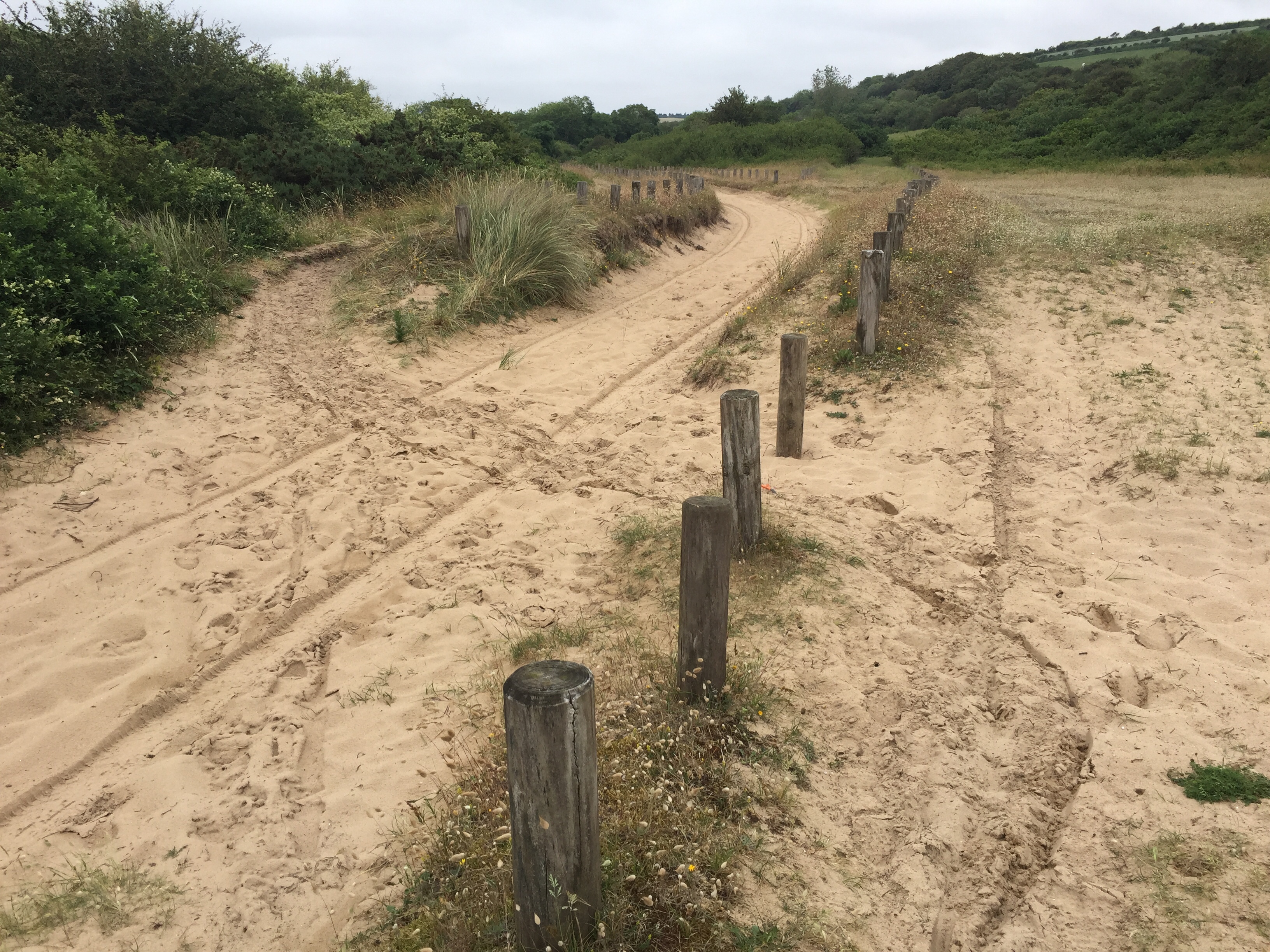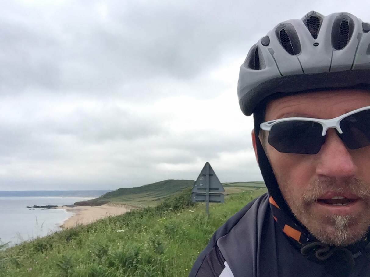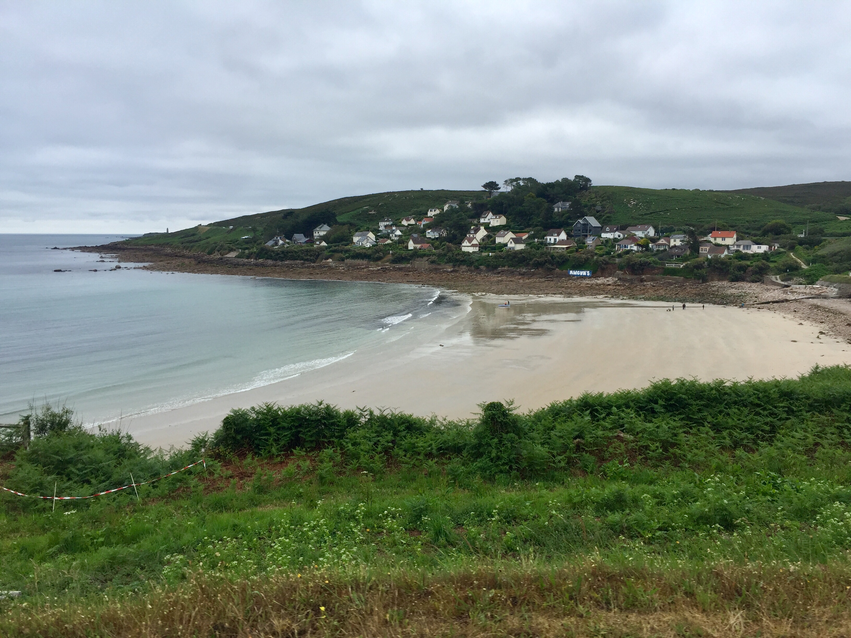 Ich mußte ab Cherbourg navigieren, denn besonders um große Städte herum wird es oft unübersichtlich. Zweimal verfuhr ich mich am Ortsausgang und beide Male ging es steil nach oben. Dann suchte ich hektisch und die Autos hupten mich von der Straße runter. Ich verschaltete mich mehrmals bei diesem Auf und Ab und irgendwie war der Flow weg. Ich versuchte, wieder ein paar schöne Nebenstraßen zu finden, auf denen keine Autos kamen und so über viele Hügel hinweg die westliche Küste zu erreichen. Das hatte ich schon mal vorgestern mittels Google geschafft, denn Radwege gibt es hier nicht und Schilder auch nicht. Das ging jetzt aber richtig schief. Erst Schotter, das war schon schlecht, dann Sandwüste.