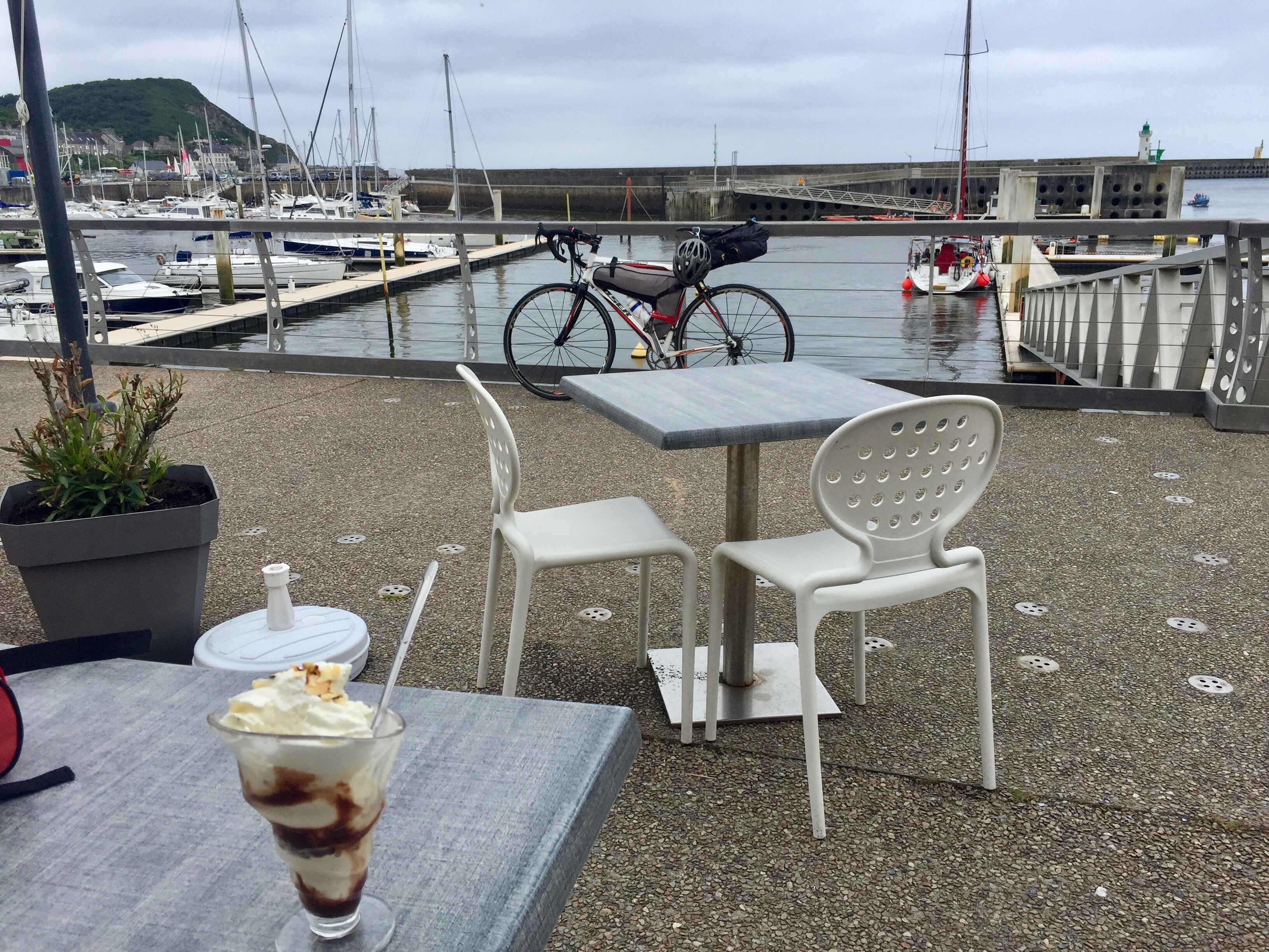 Bei km 50 ein Eisbecher im Hafen von Diélette sollte mich entschädigen für diesem Weg, so quer durch mit dem Kopf durch die Wand.