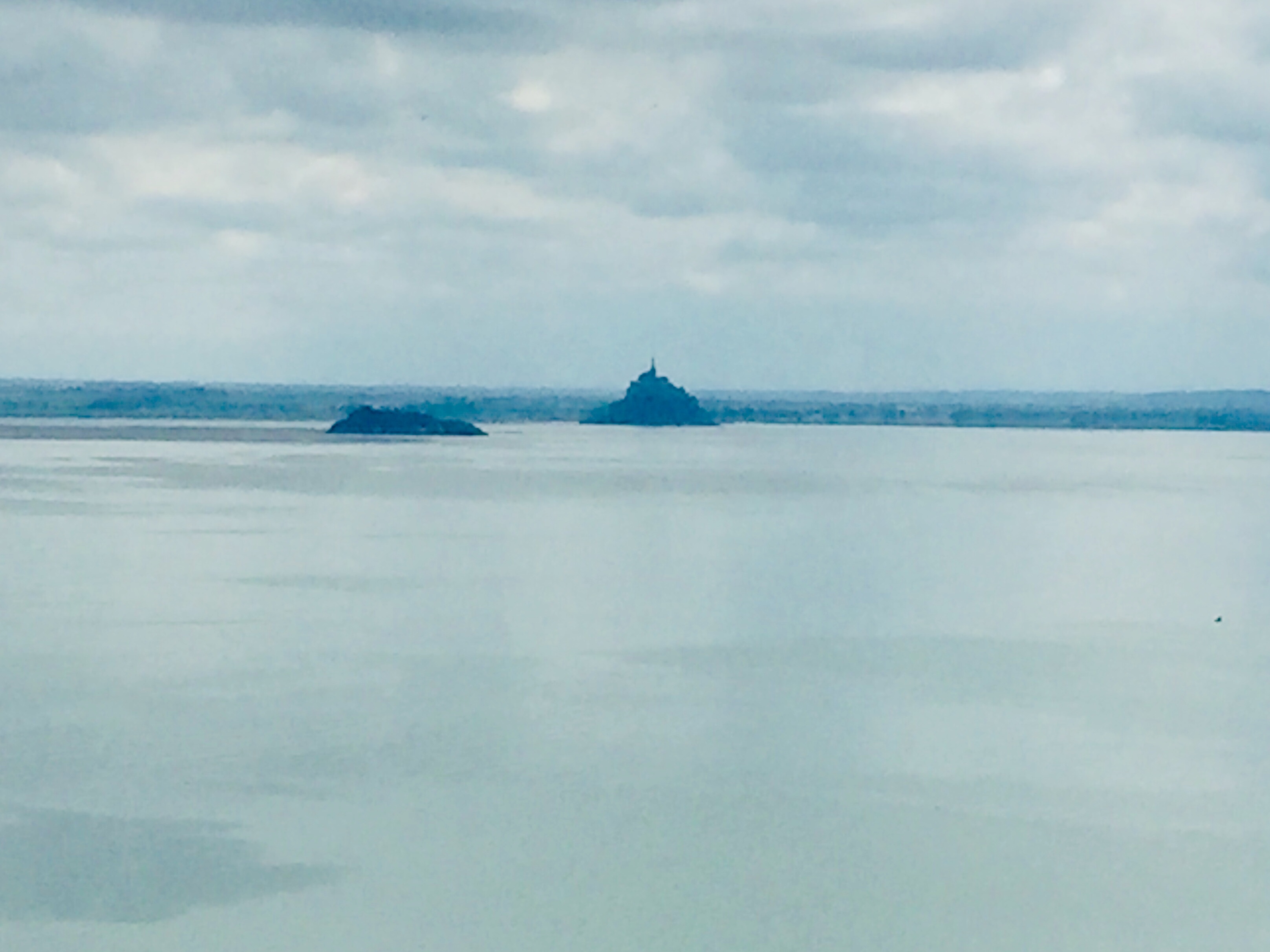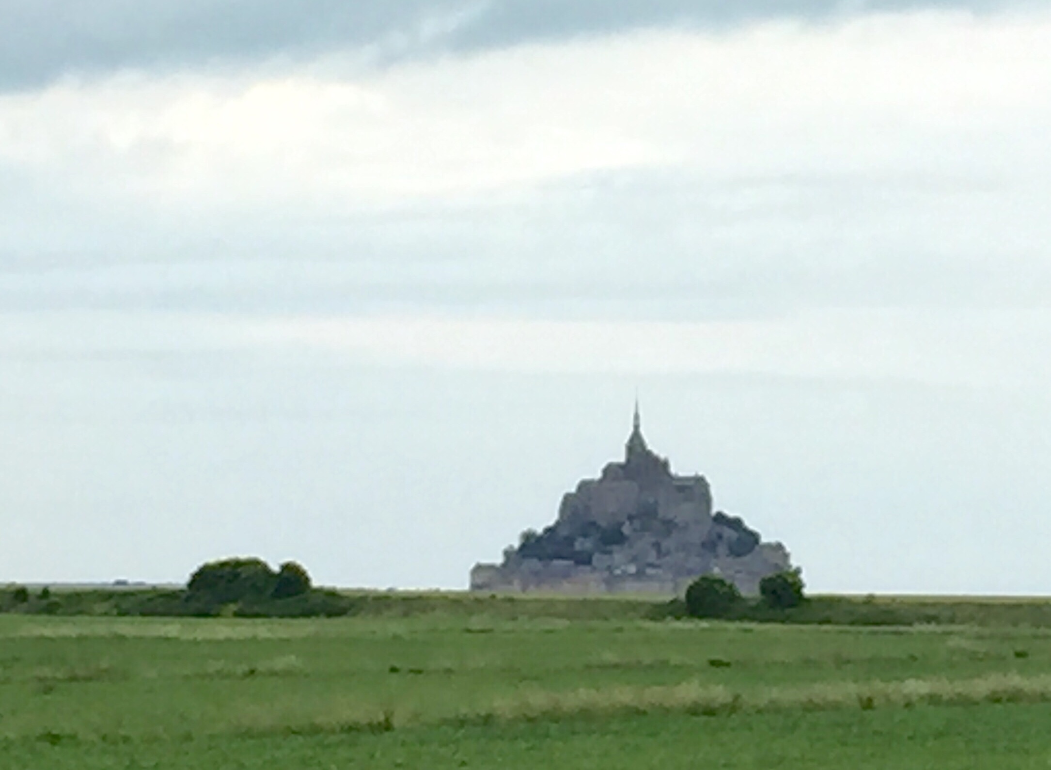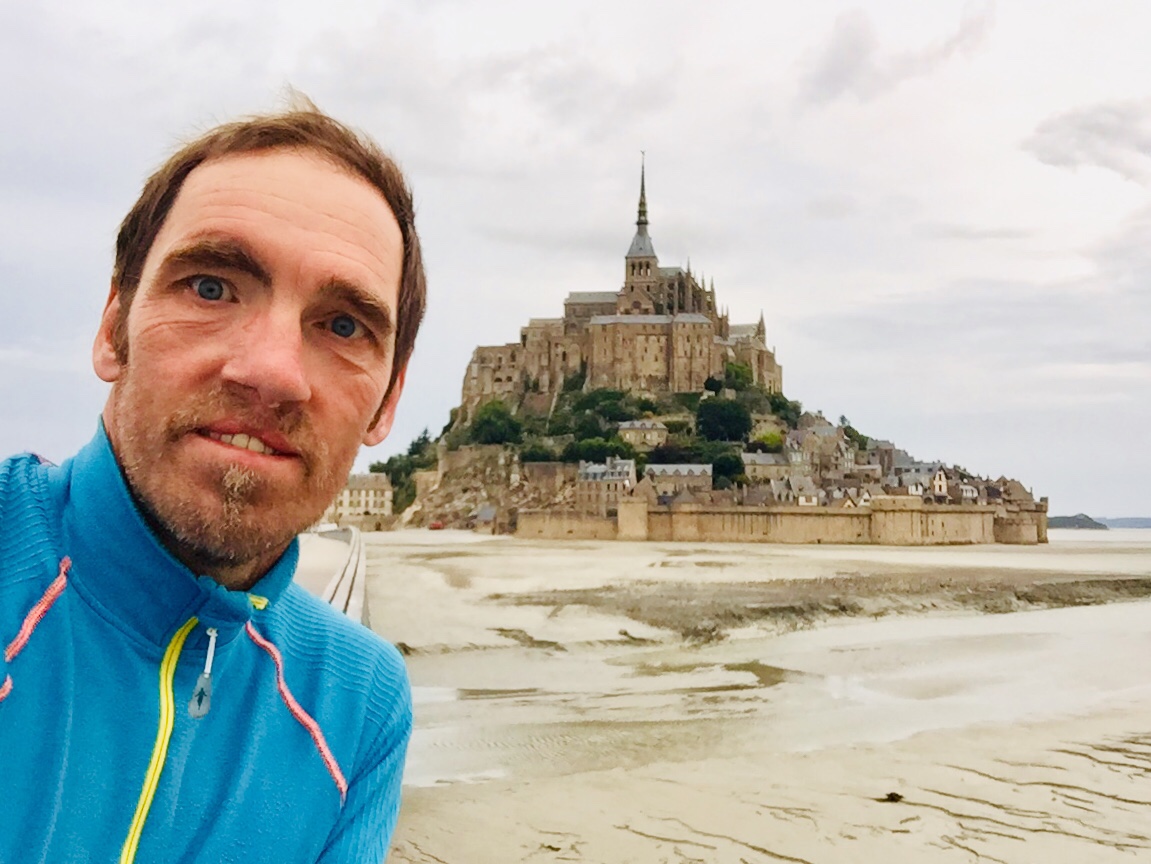 Plötzlich sehe ich ihn zum ersten Mal, den Mont Saint Michel. Absolut beeindruckend und mit dem Handy eigentlich nicht festzuhalten. Der Anblick gibt mir Auftrieb, obwohl ich noch 40 km im Halbkreis über Avranches zu fahren habe.