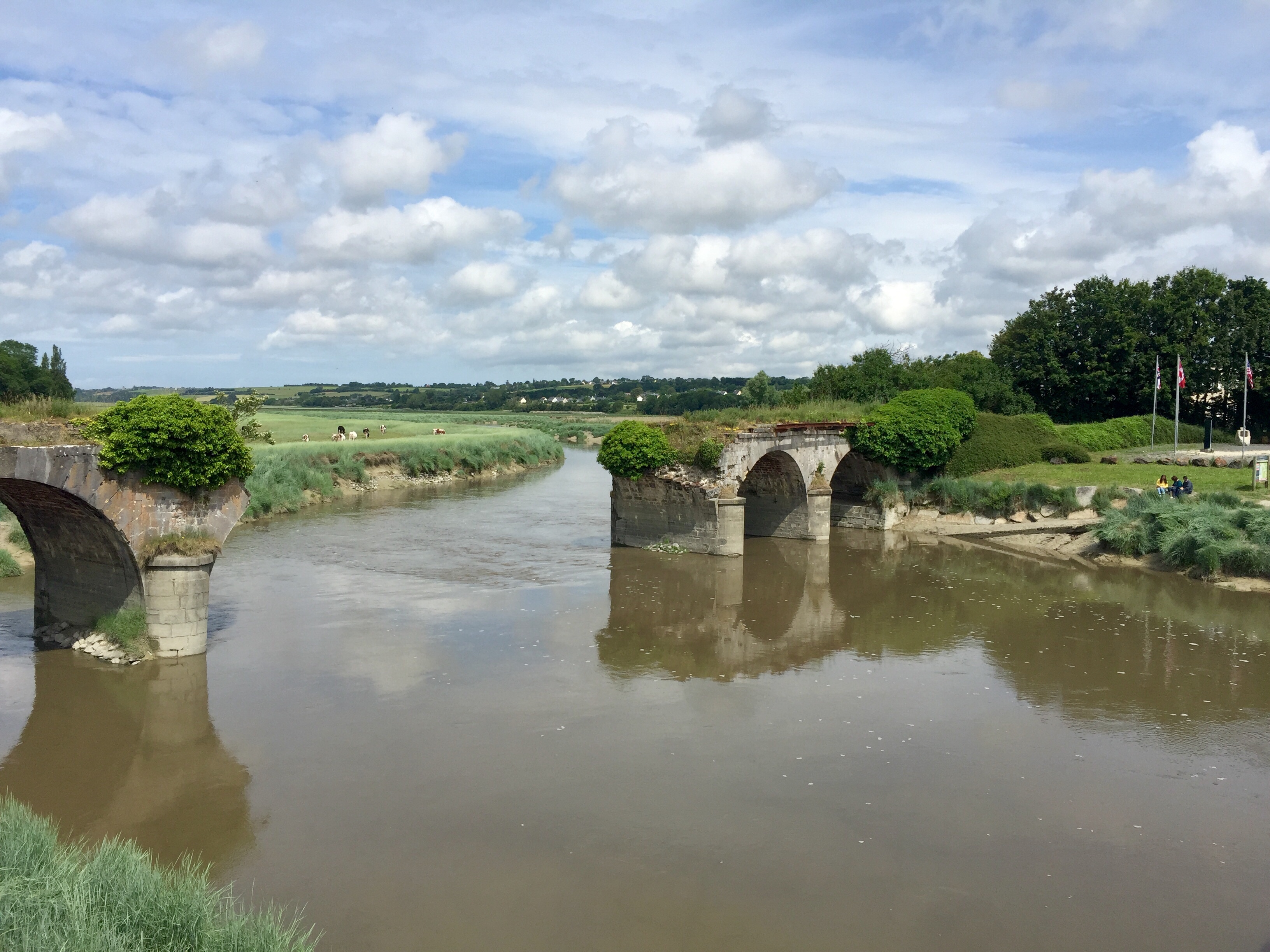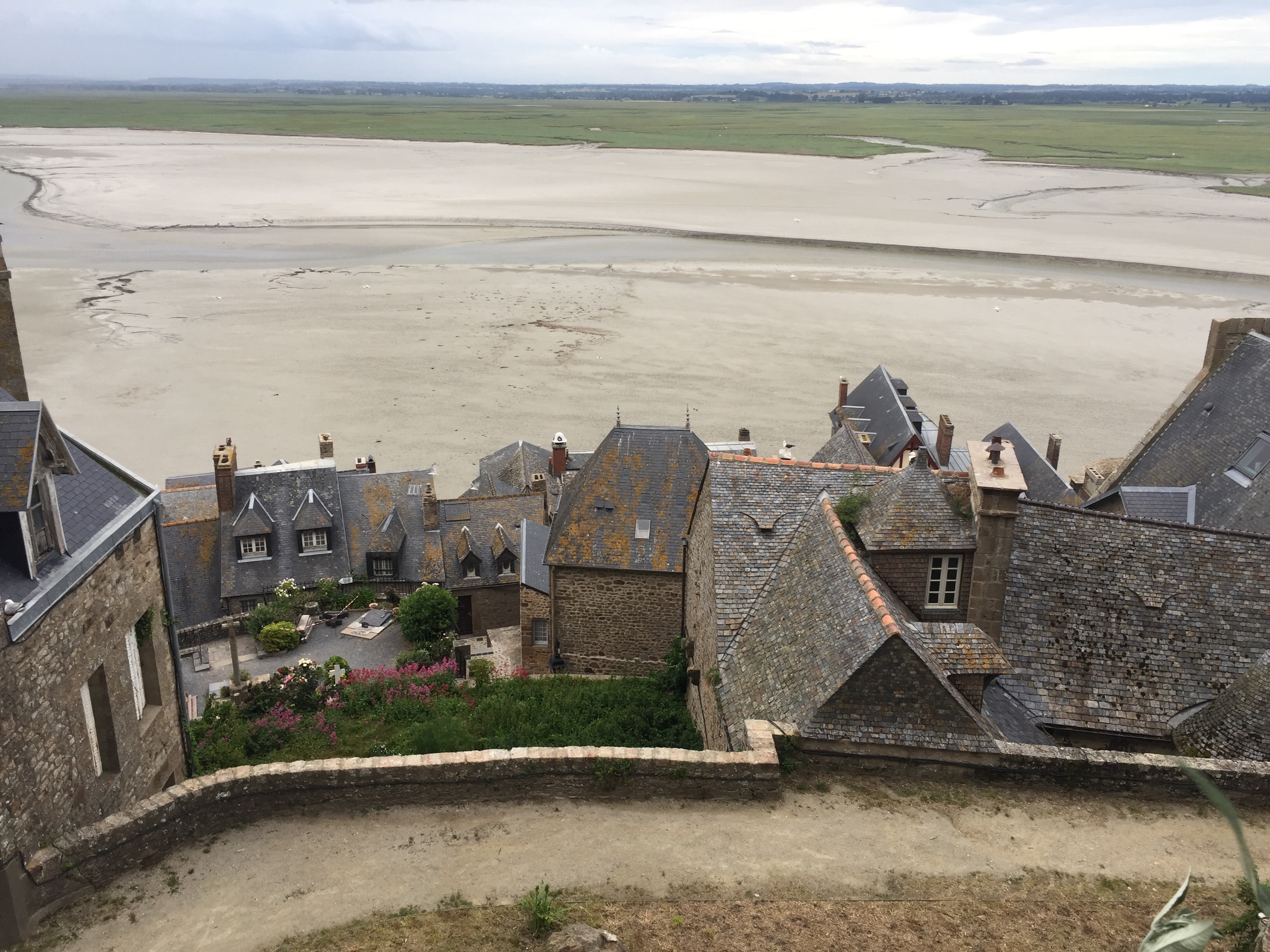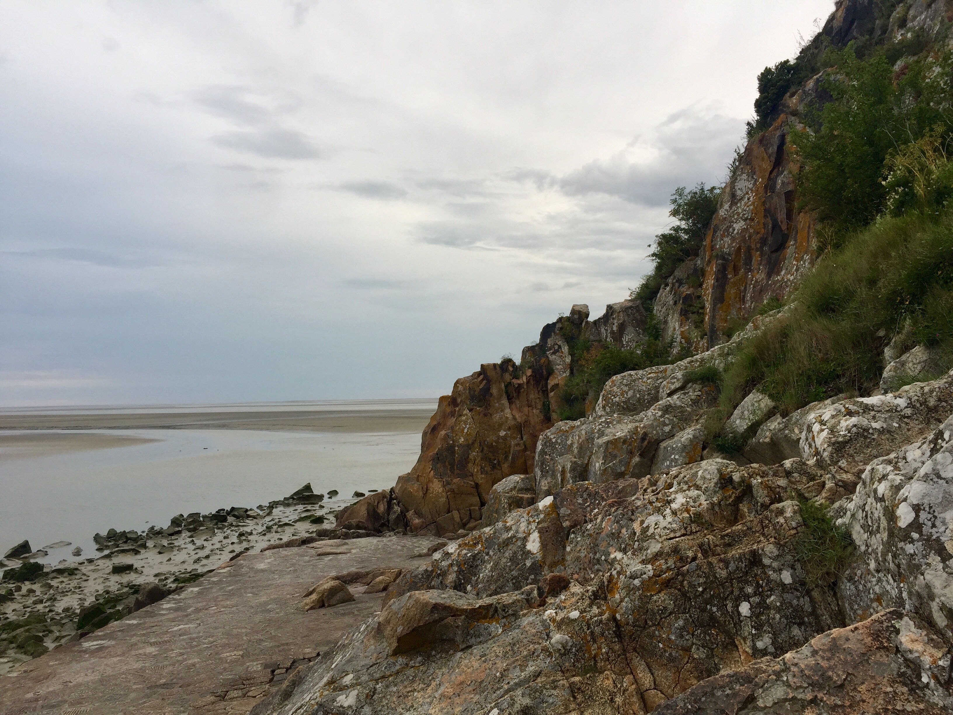 Plötzlich sehe ich ihn zum ersten Mal, den Mont Saint Michel. Absolut beeindruckend und mit dem Handy eigentlich nicht festzuhalten. Der Anblick gibt mir Auftrieb, obwohl ich noch 40 km im Halbkreis über Avranches zu fahren habe.