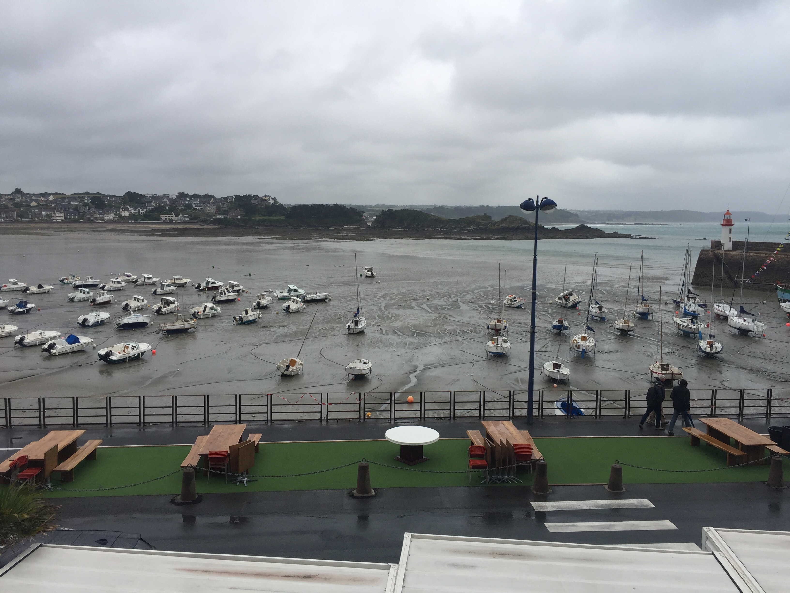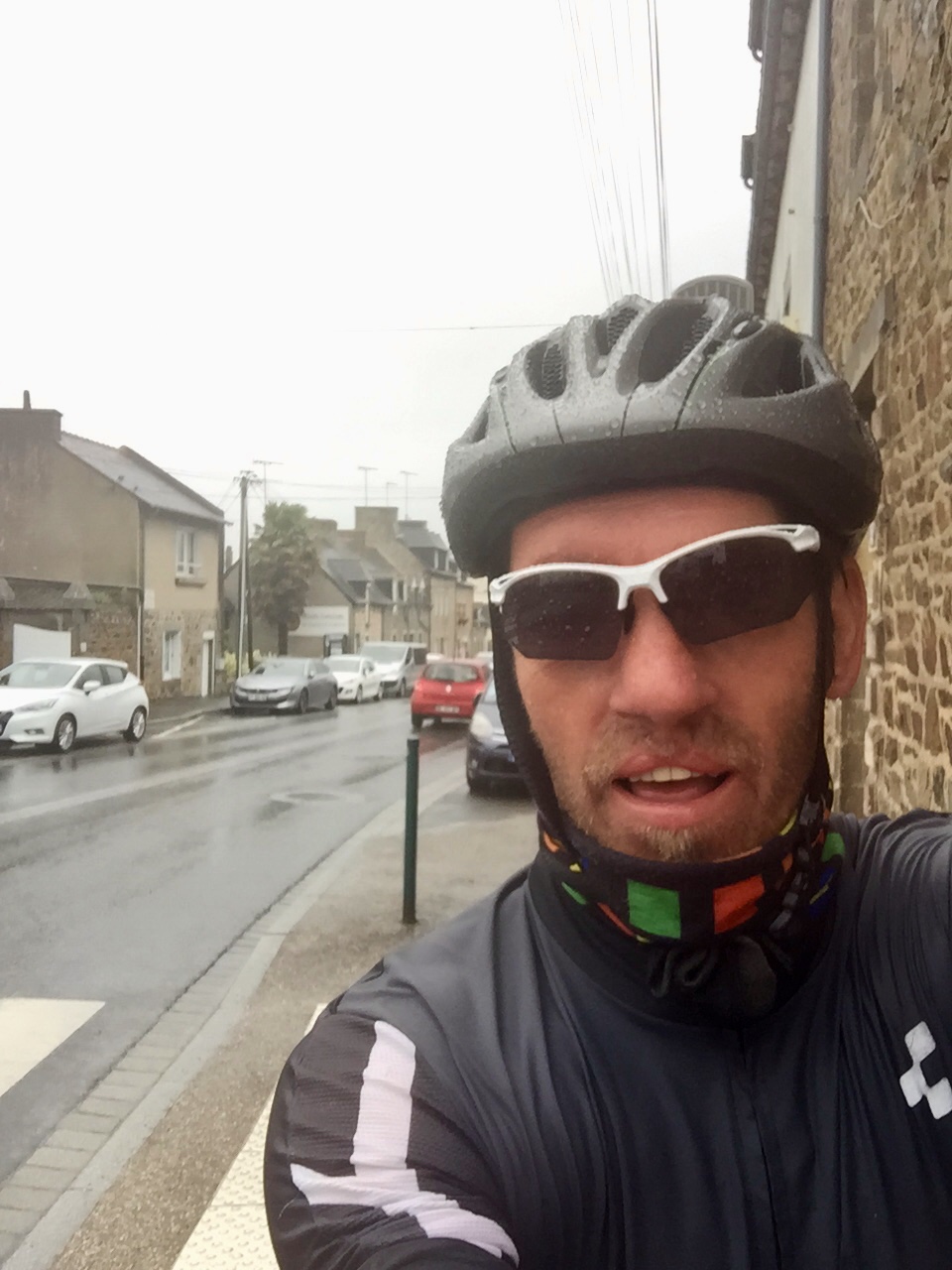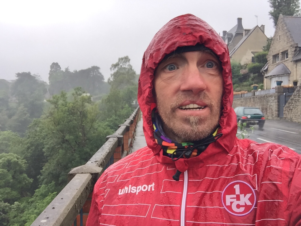 Es blieb einfach so und ich sagte mir: „Auf jeden Fall fahre ich nach St. Brieuc.“ Das ist eine größere Stadt, die auch gestern immer schon ausgeschildert war. Heute hatten wir das Wetter, das ich schon seit zehn Tagen erwartet hatte: Dauerregen und über 30 km/h Wind (Gott sei Dank aus Nord), der mal von schräg hinten und oft von der Seite, selten von vorn kam.