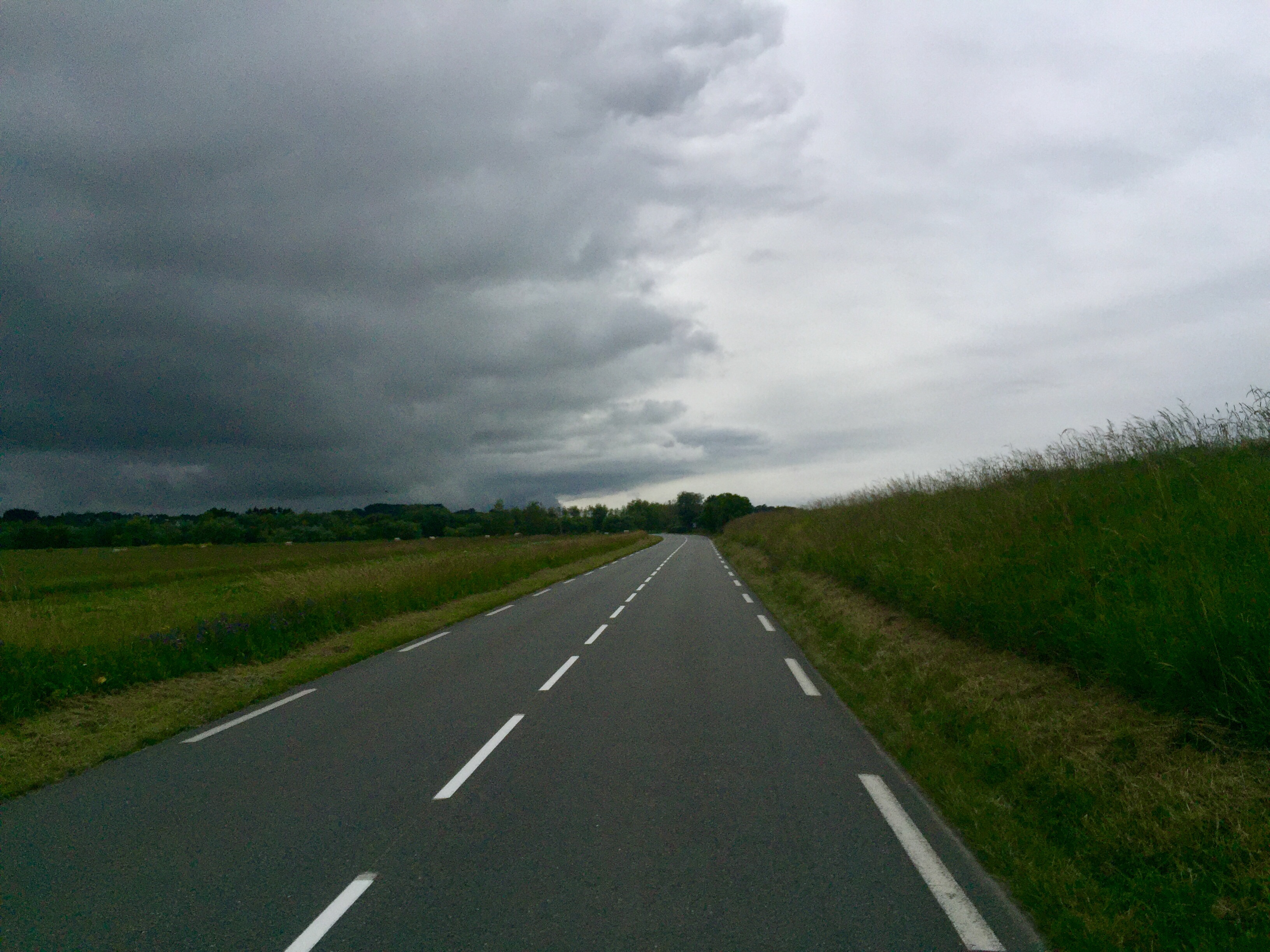 Links, südlich Richtung Brest sind sehr schwarze Wolken und ich bleibe immer schön in Küstennähe. Denn ich glaube daran: Wenn Wolken vom Meer aufs Land ziehen, beginnen Sie sich zu stauen und dann regnet es halt. An der Küste selbst passiert oft gar nicht soviel.