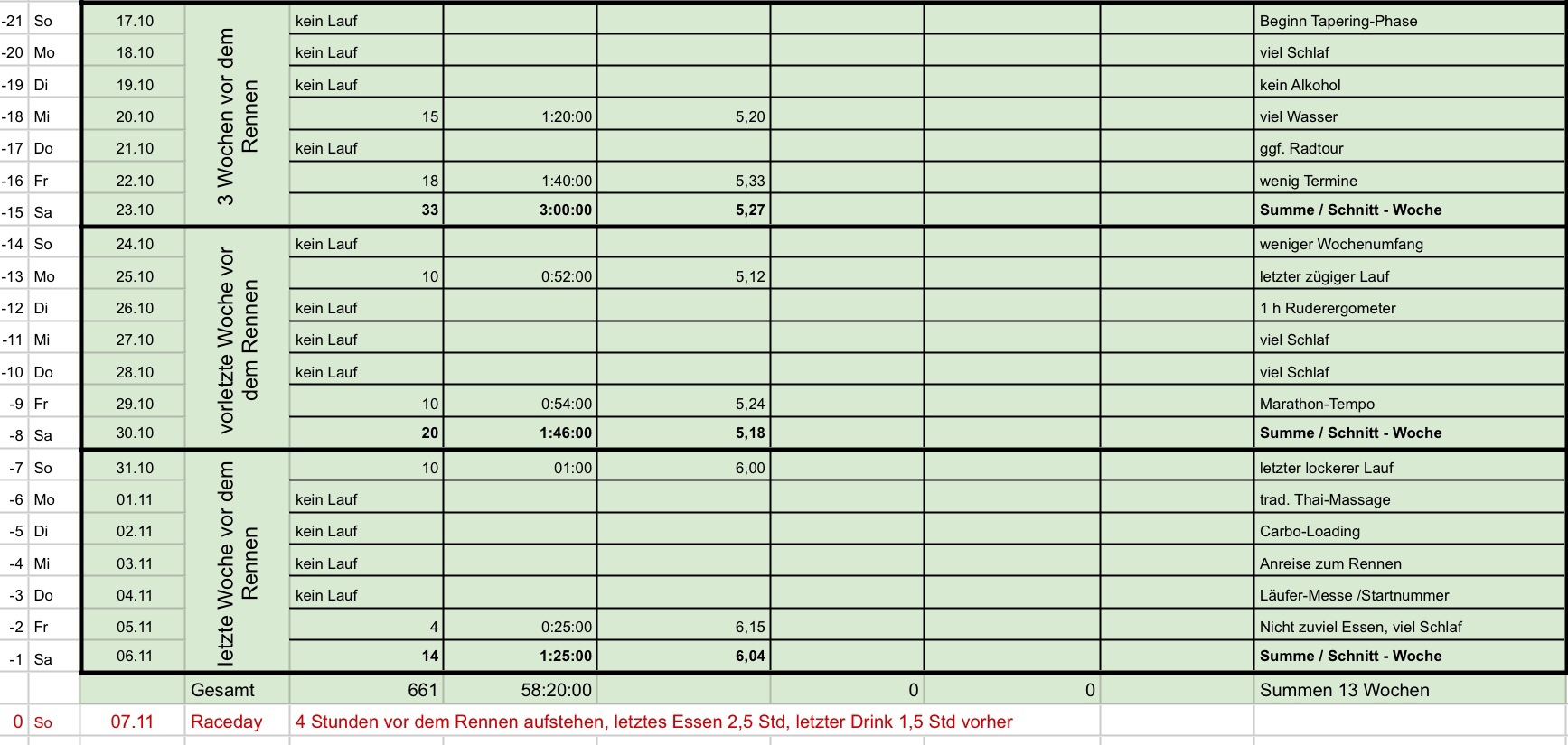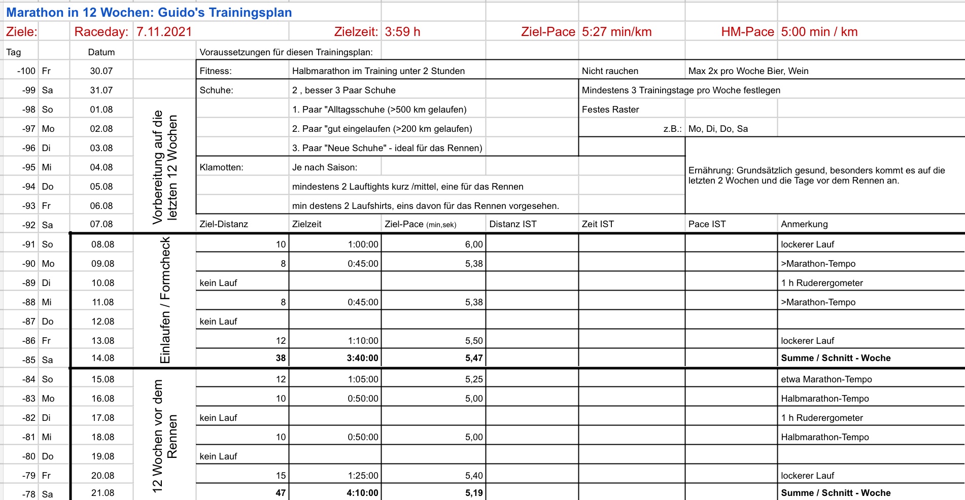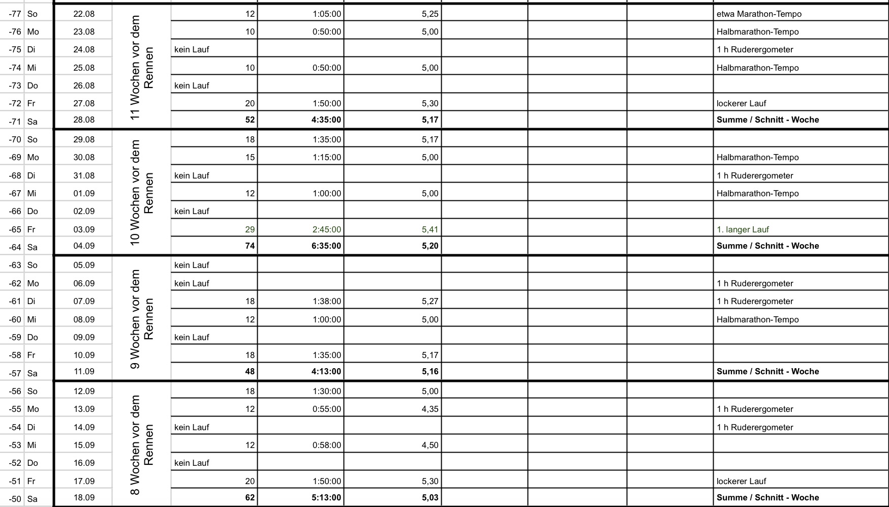 Für einen guten Freund mache ich nun einen Trainingsplan für seinen ersten Marathon in 12 Wochen. Mit seinem guten Fitnesslevel schafft er die Vorbereitung ganz sicher. Es fehlt ihm eigentlich nur an Umfang. Auch für mich werde ich diesen Plan nehmen: