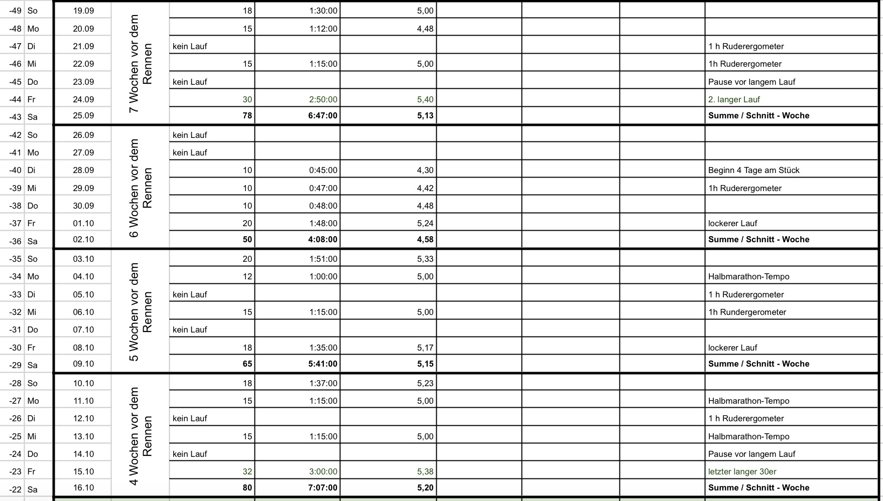 Der Trainingsplan folgt den Prinzipien der Superkompensation und der Periodisierung. Grob gesagt: Immer wenn man sein letztes Pensum erreicht hat, legt man eine kleine Schippe drauf und läuft z.B. nach einem Ruhetag etwas weiter oder schneller. Dabei dürfen die Sprünge nicht zu groß sein, ein oft gesehener Fehler. Außerdem spiegelt sich der Rhythmus in Kleinen – der Woche – auch im größeren – hier im 3-Wochen-Abstand – wieder. Dabei schaukelt man sich langsam in eine Höhere Leistung. Aber ich habe es auch nicht unnötig kompliziert gemacht.