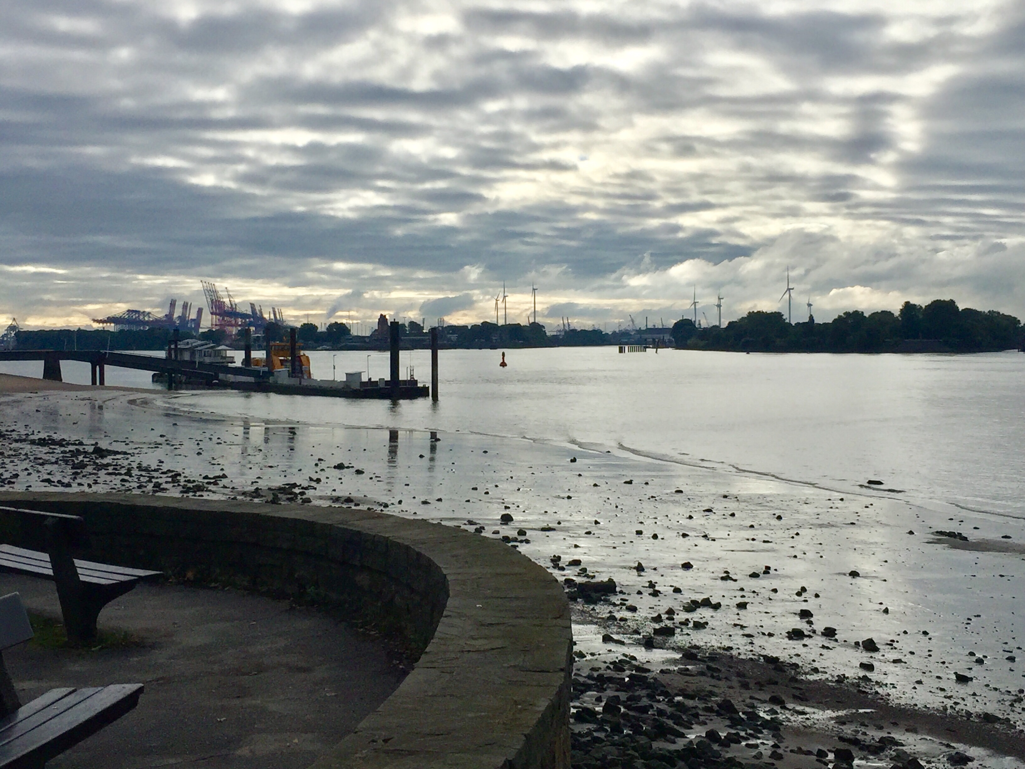 Gegenüber die Hafenanlagen mit viel Arbeit und das Werksgelände von Airbus.