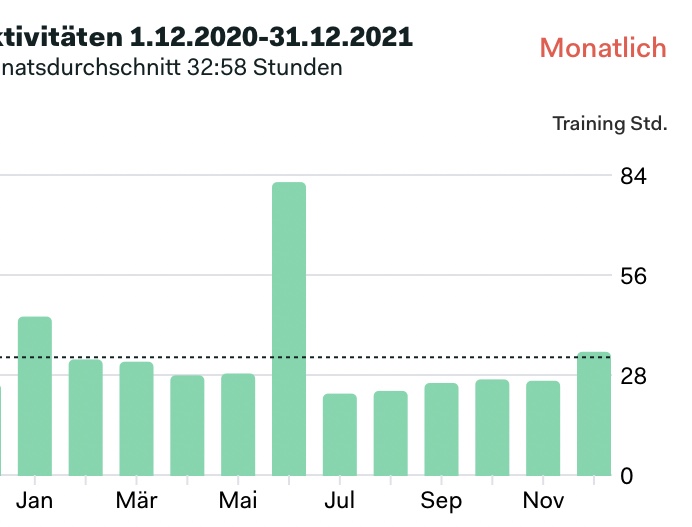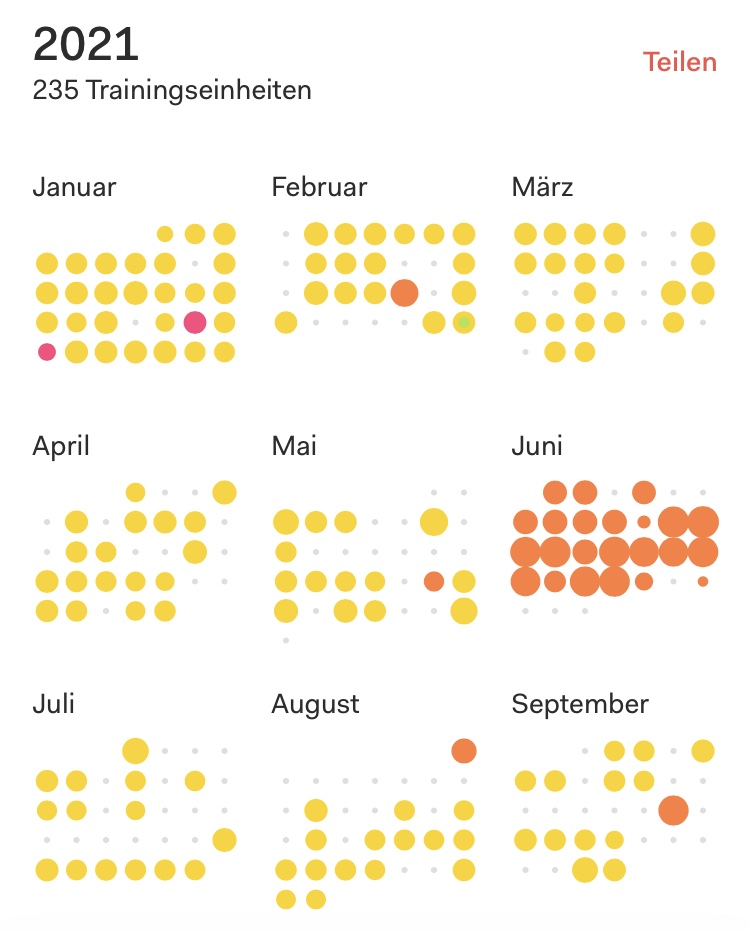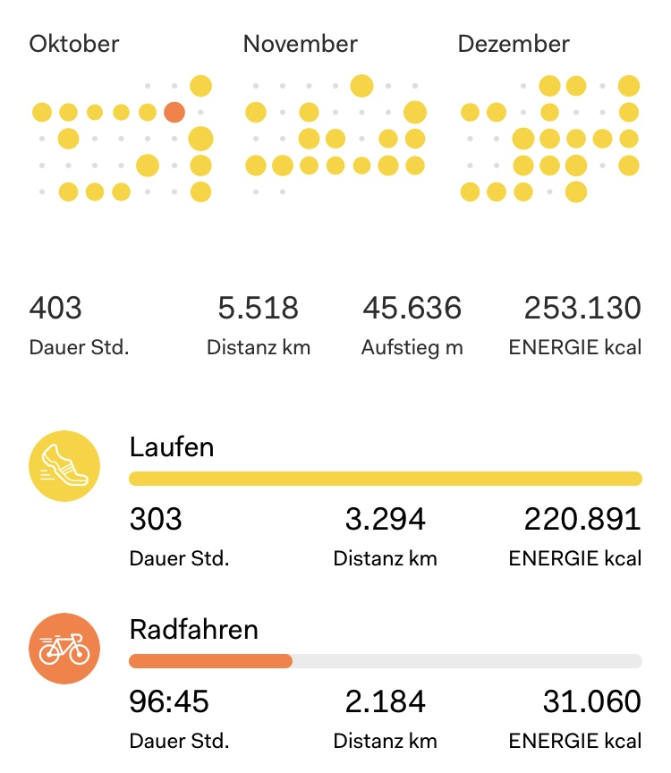 Insgesamt war ich pro Tag gut eine Stunde unterwegs. Eine super Sache auch für die Gesundheit! Man sieht den Peak im Juni, die lief ich überhaupt nicht, und da hinein fiel auch mein Rennradabenteuer Rotterdam-Bretagne. Zu jedem Tag gibt es einen Beitrag hier im Blog.