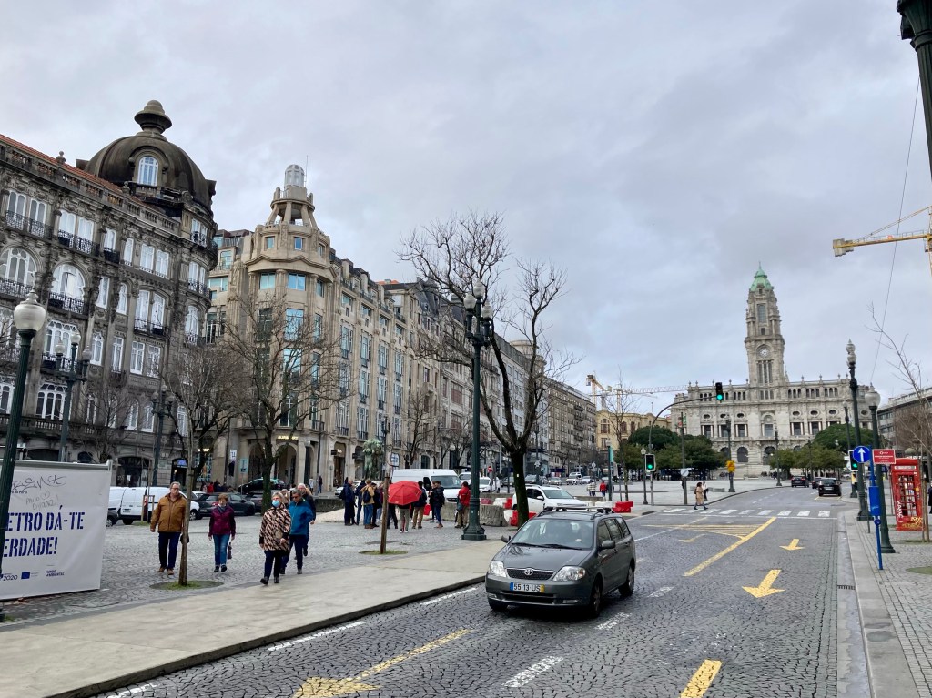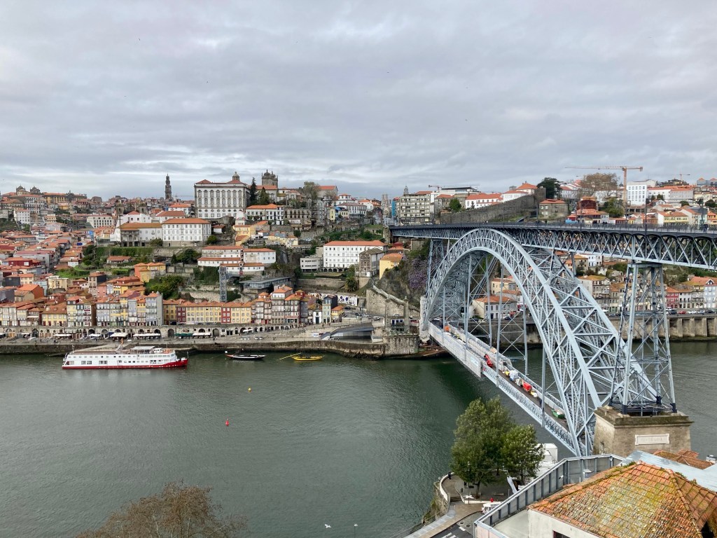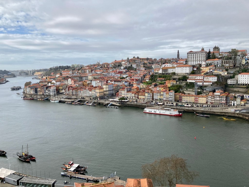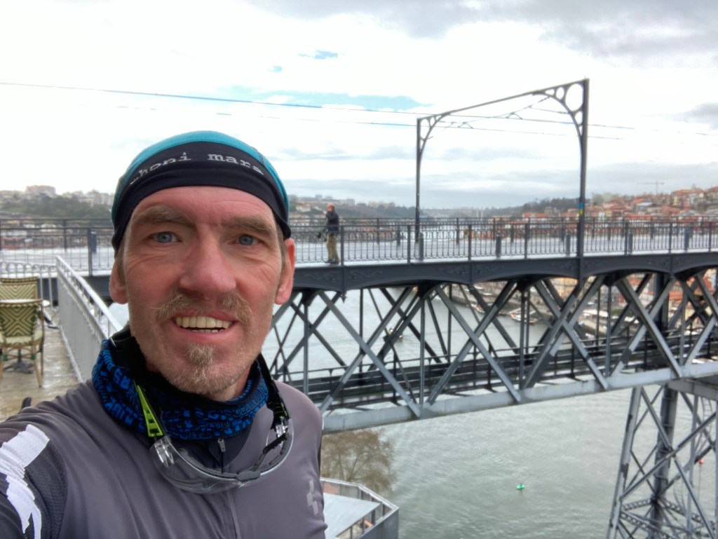 Als ich mich Porto näherte, kamen all die Probleme, die man oft beim Reinfahren in große Städte hat: Viel Verkehr, ausgefahrene Seitenstreifen, wenig Platz bei engen Stellen, schlechte Rad/Gehwege, hektische, vom Stau geplagte Autofahrer, Lieferwagen, Bordsteinparker, Ampeln, Hinweisschilder und vor allem fehlende Hinweise darauf, wie es denn am besten in die Stadt geht. Solche Probleme gibt es bei den Überlandfahrten alle nicht. Da Porto auch noch auf verschieden hohen Felsen gebaut ist, kommt die rege Hoch- und Runterschalterei noch dazu und Orientierungsfehler rächen sich schwer, man muß dann alles wieder hoch bis zu dem Punkt, wo man falsch abgebogen war. Ich bin ja überzeugter Monotasker, für mich ist das Zuviel auf einmal und ich komme in Streß. Nur ein Mal verfuhr ich mich, aber ich verschaltete mich öfter. Weil es auch noch regnete, konnte man nicht so bequem das Handy in der Halterung lassen, sondern mußte es rausholen, entsperren und dann wieder verstauen. Ich frickelte mich durch und hoffte auf den einen Moment, wo man die Stadt von oben toll sehen konnte…