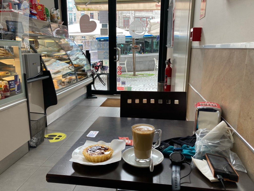 Dafür haben sie hier ein besonderes Händchen und wahrscheinlich schützen die Platten auch ganz gut gegen jegliches Unwetter. Wenn mal was schmutzig ist, kann man es einfach abwaschen. Ansonsten gab es erstmal nichts zu sehen. Bei km 34 bekam ich schon wieder Hunger und es regnete schon ganz gut. Bevor ich zu sehr frohr, aß ich schon mal Kuchen und trank den portugiesischen Milchkaffee Galão. Damit beeilte ich mich und wer weiß, wann es das nächste Mal was gibt.