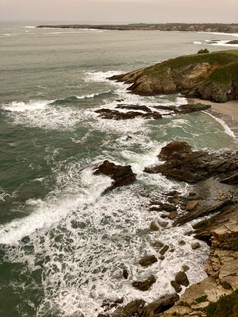 Und immer wieder lugte das Meer hervor! Mit Beharrlichkeit, Ausdauer und einem weiteren Café in Novellano im Nirgendwo erreichte ich dann Cudillero. Ich sah auf der Karte, daß ich dafür wieder 200m runter ans Meer sollte, dort aber vielleicht nicht mal ein richtiges Hôtel war. Aber oben, zwischen Autobahn und Landstraße gab es einen weitläufigen Komplex aus mehreren Häusern mit Hunderten Parkplätzen. Die arbeiteten auf Minimalbetrieb und hatten ein Zimmer. 35€ mit Frühstück, so muß es sein!