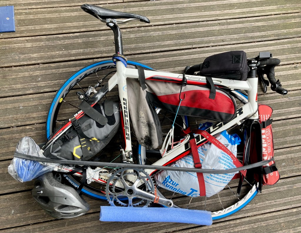 Alles legte ich kompakt aufeinander. Ich hatte ja den 15er Schlüssel von Maxim in La Trinité SurZur bekommen, um nun die Pedale abzuschrauben. Alle Schnallen, Gurte, den kaputten Schlauch von Lagos und die gefundenen Dinge von der Straße kombinierte und schnürte ich zu einem Paket.