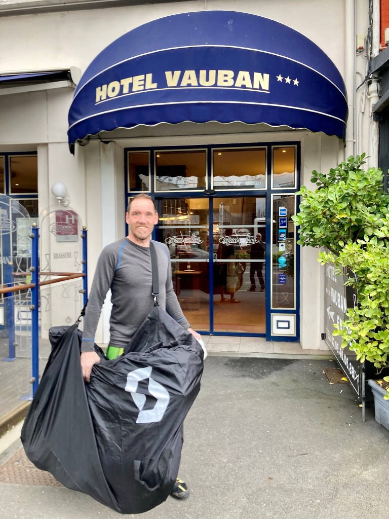 Die Tasche für das Rad hatte ich nun 25 Etappen weit mitgeschleppt (wiegt 800g), die hätte mir im Notfall auch als Zelt dienen sollen. Jetzt brauchte ich sie und war ziemlich sicher, damit gut in den beiden TGV bis Moulhouse klar zu kommen.