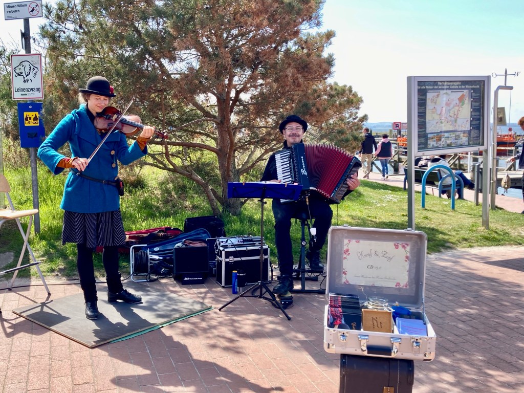 Die Atmosphäre an diesem kleinen Hafen ist toll, erst recht durch dieses Musiker-Duo aus Wismar. Hier habe ich sie im Netz gefunden; Knopf&Zopf
